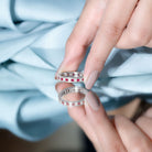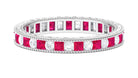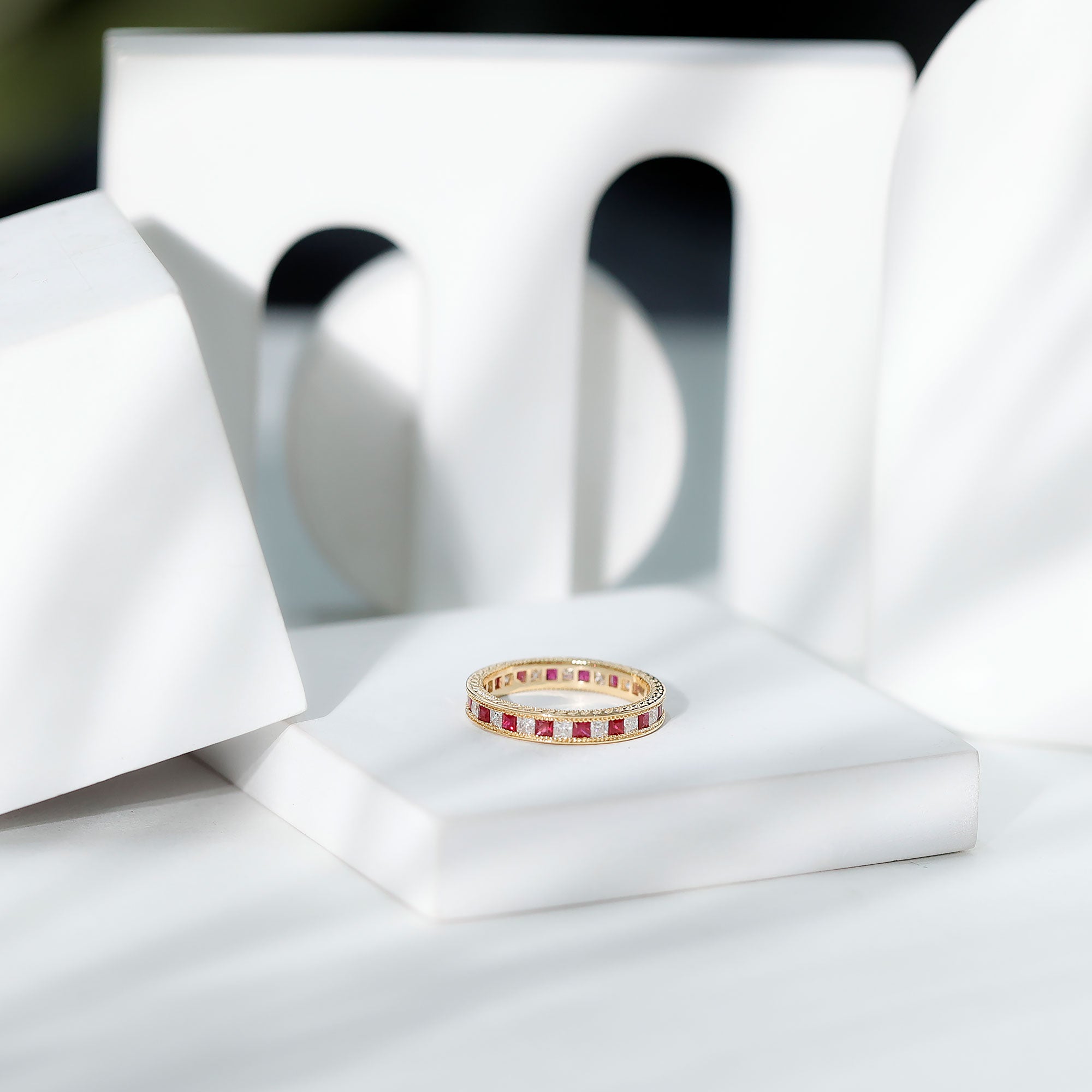 Embrace the allure of this Ruby Eternity Ring where every glance sparks joy and every moment shines with unforgettable brilliance. Crafted with care and precision this Ruby Wedding Ring showcases the Princess Cut Ruby and Moissanite in Channel Setting, and is beautifully complemented by a unique beaded design that adds texture and a modern twist to the classic eternity band. This Real Ruby Ring creates a breathtaking effect that captures attention from every angle. Whether worn as a statement piece or stacked with your favorite rings, this eternity band radiates versatility and sophistication, making it the perfect accessory for any occasion.