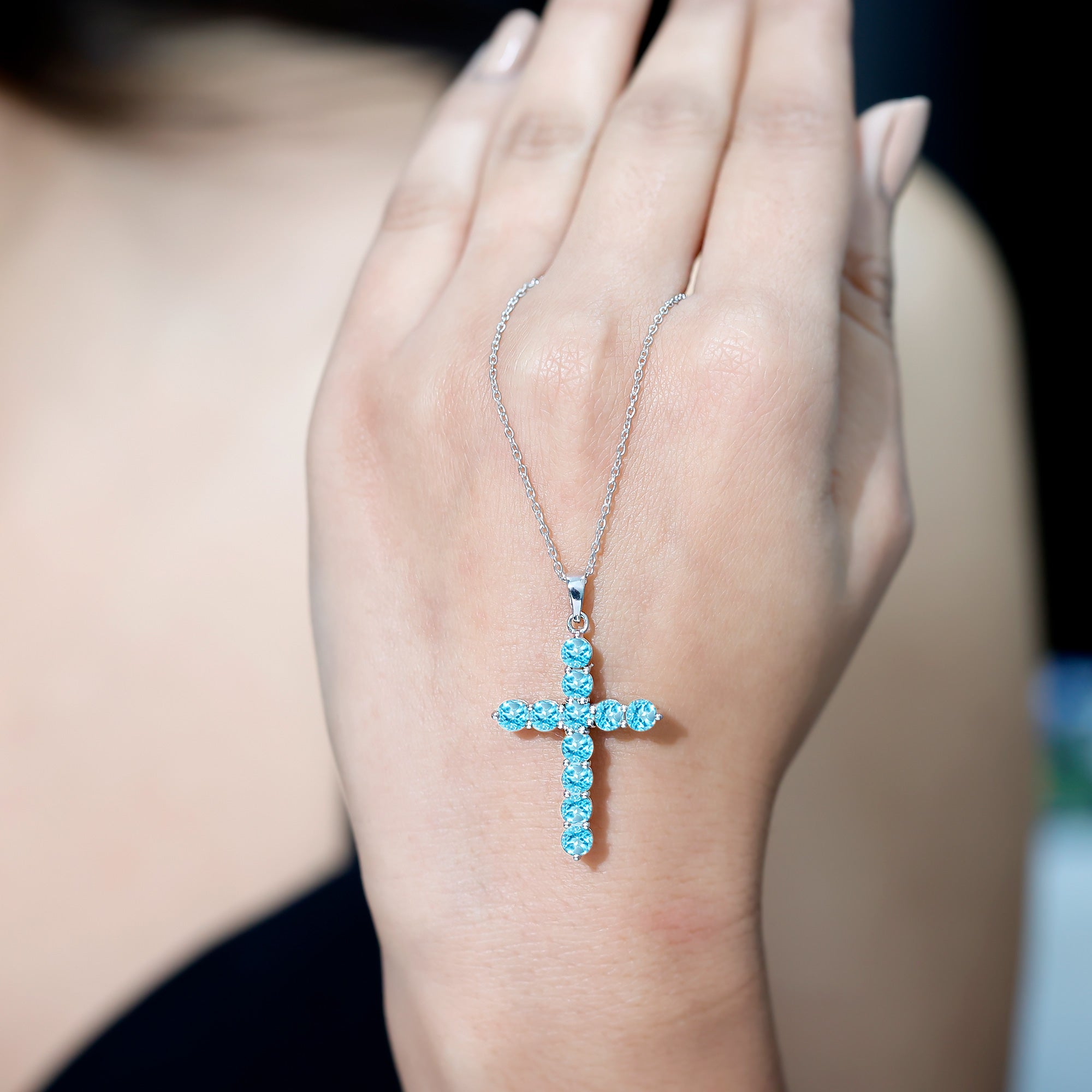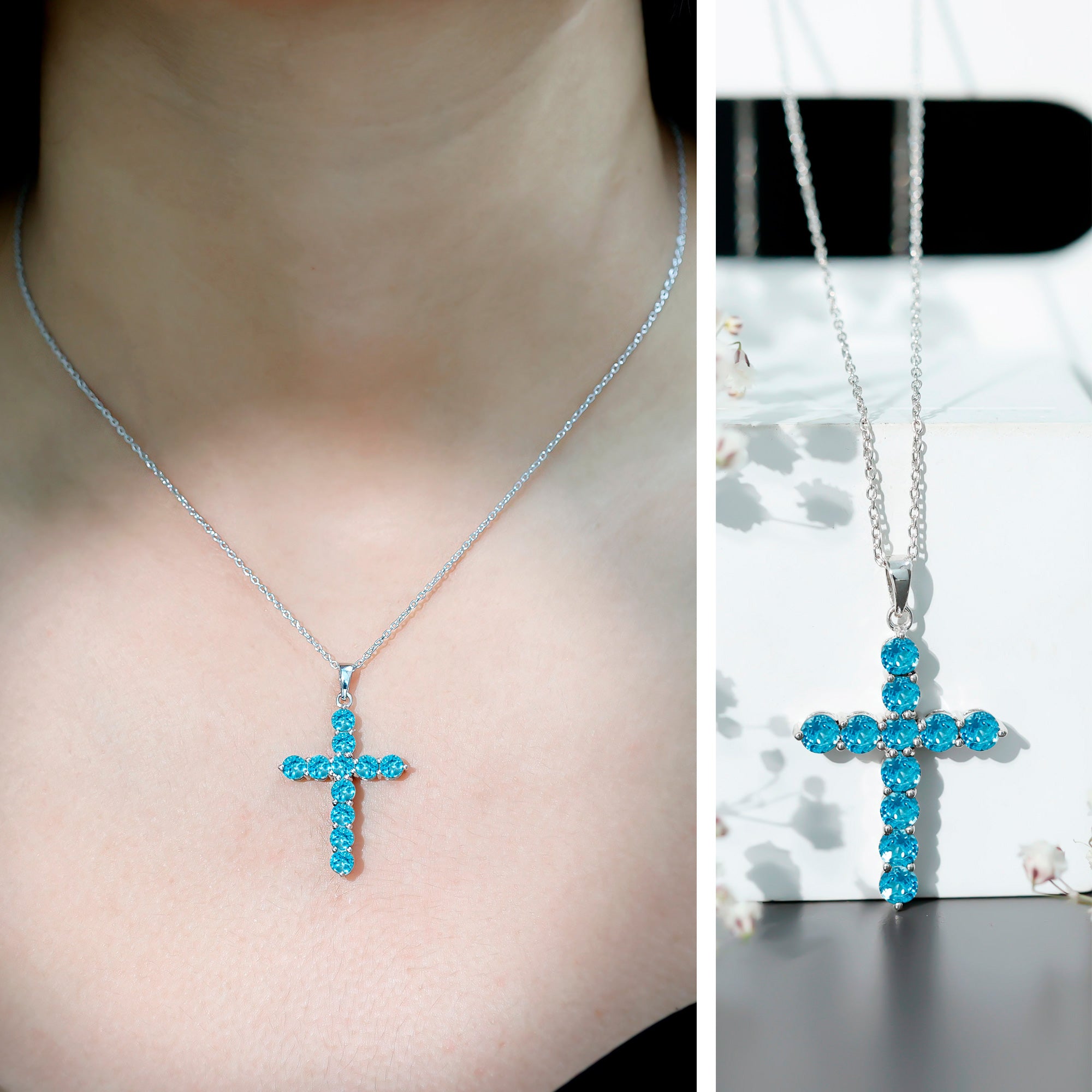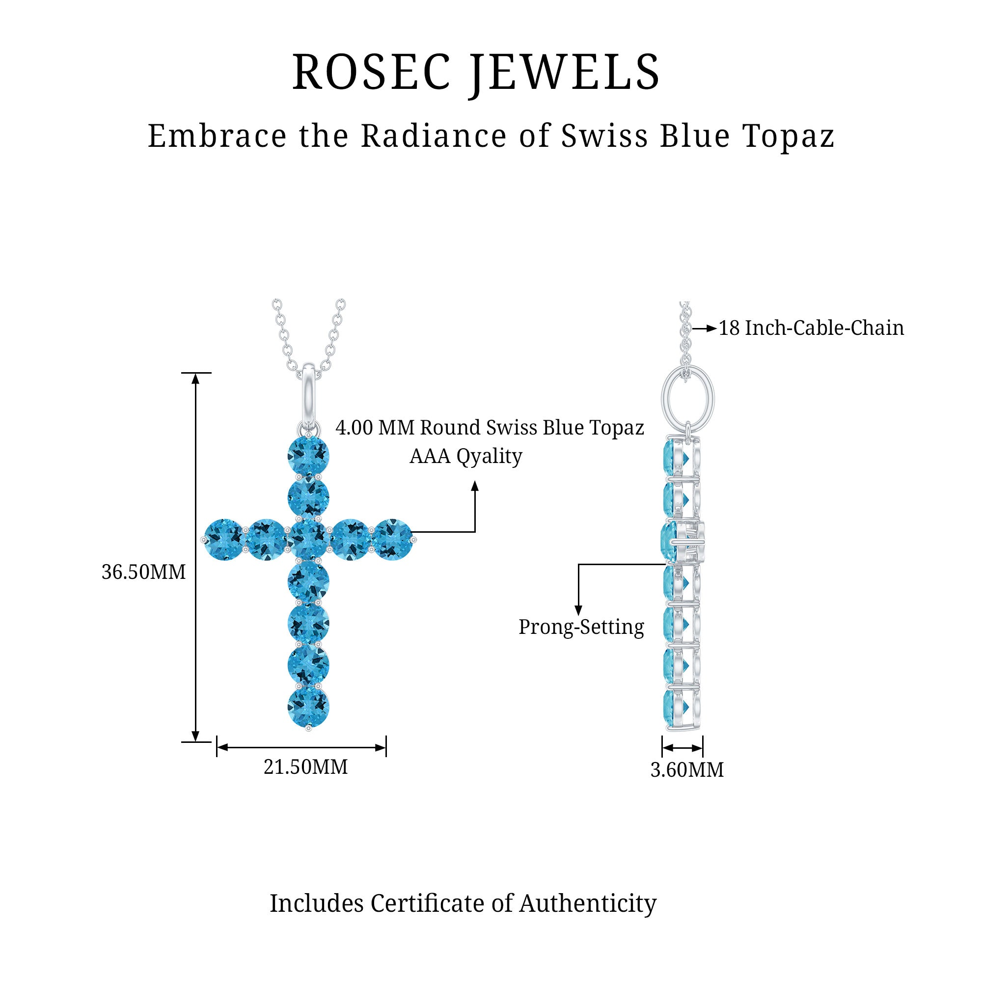 This stunning Cross Necklace is not just a beautiful piece of jewelry, it represents a deep symbol of love and faith. Adorned with round cut AAA quality Swiss blue topaz set in secure prong setting, this Simple Pendant Necklace is ideal for those who cherish spirituality. Crafted with our master artisans unmistakable eye for detail in 14k white gold plated sterling silver, this Christian Pendant ensures that each gemstone radiates its utmost brilliance. The Topaz Pendant Necklace is suspended from a cable chain, enhancing its elegance. To ensure its Quality, it comes with a certificate of authenticity, providing peace of mind.