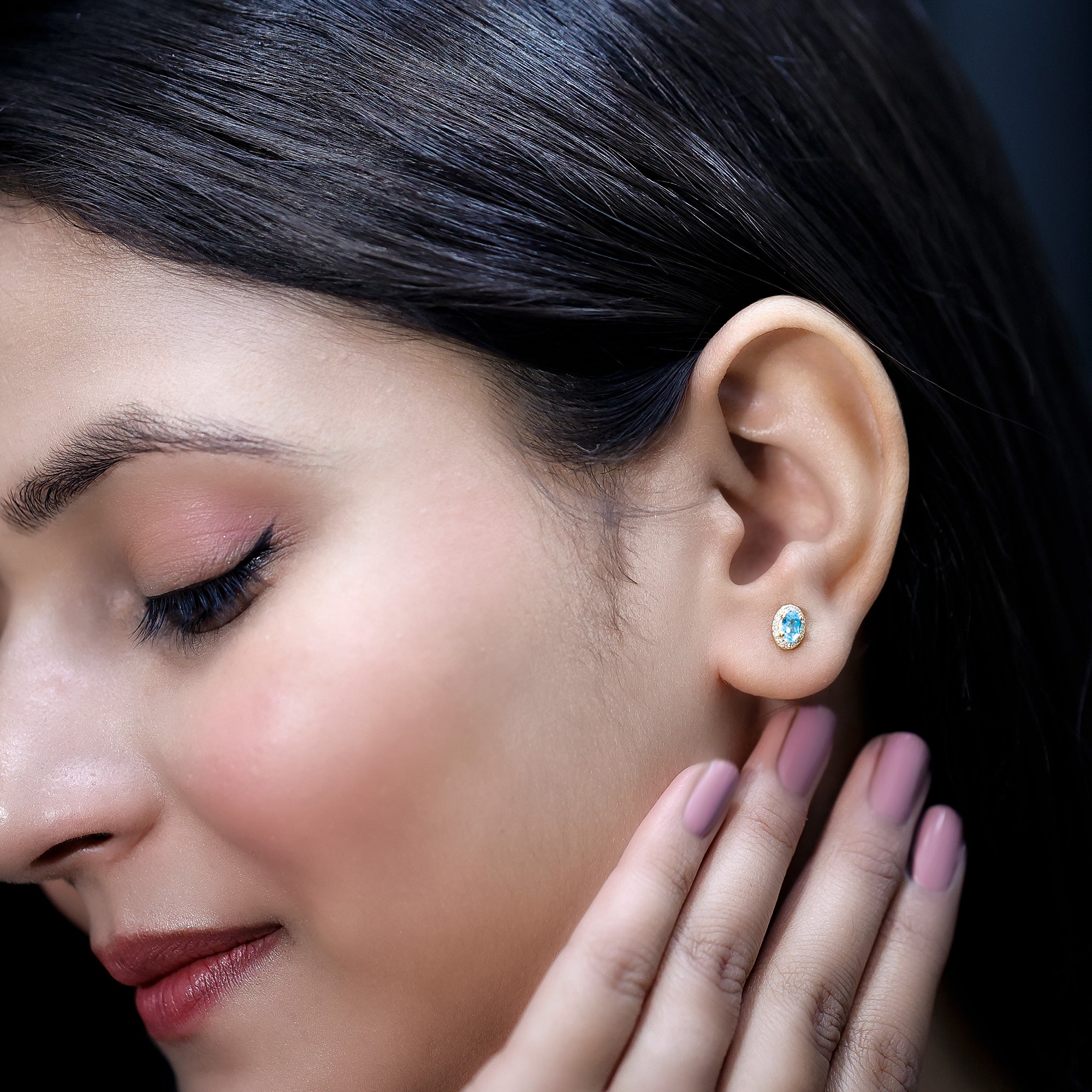 Delicate, dreamy, and designed to impress - these Swiss Blue Topaz Earrings are a graceful blend of simplicity and beauty. Designed in yellow gold plated silver, they have a classic shape and an eye-catching color that stands out beautifully. Each earring features a 3X5 MM oval shaped Swiss Blue Topaz, set securely in prong setting. Known as the birthstone for December, Swiss Blue Topaz symbolizes peace, honesty, and clarity, making these Oval Stud Earrings a thoughtful gift for someone born in that month. A sparkling halo of lab grown diamonds surrounds the center stone, adding extra shine without taking away from its natural beauty. The Blue Topaz and Diamond Earrings are finished with a screw back closure, keeping them safe and comfortable for all-day wear. Lightweight and simple to style, they can be worn with casual looks or dressed up for formal events. Made with AAA quality Swiss Blue Topaz, these December Birthstone Earrings bring a timeless feel with a modern touch. They come in a signature jewelry box and include a gemstone certificate for authenticity. This pair is a lovely way to show personality and elegance, something to be treasured for years to come.