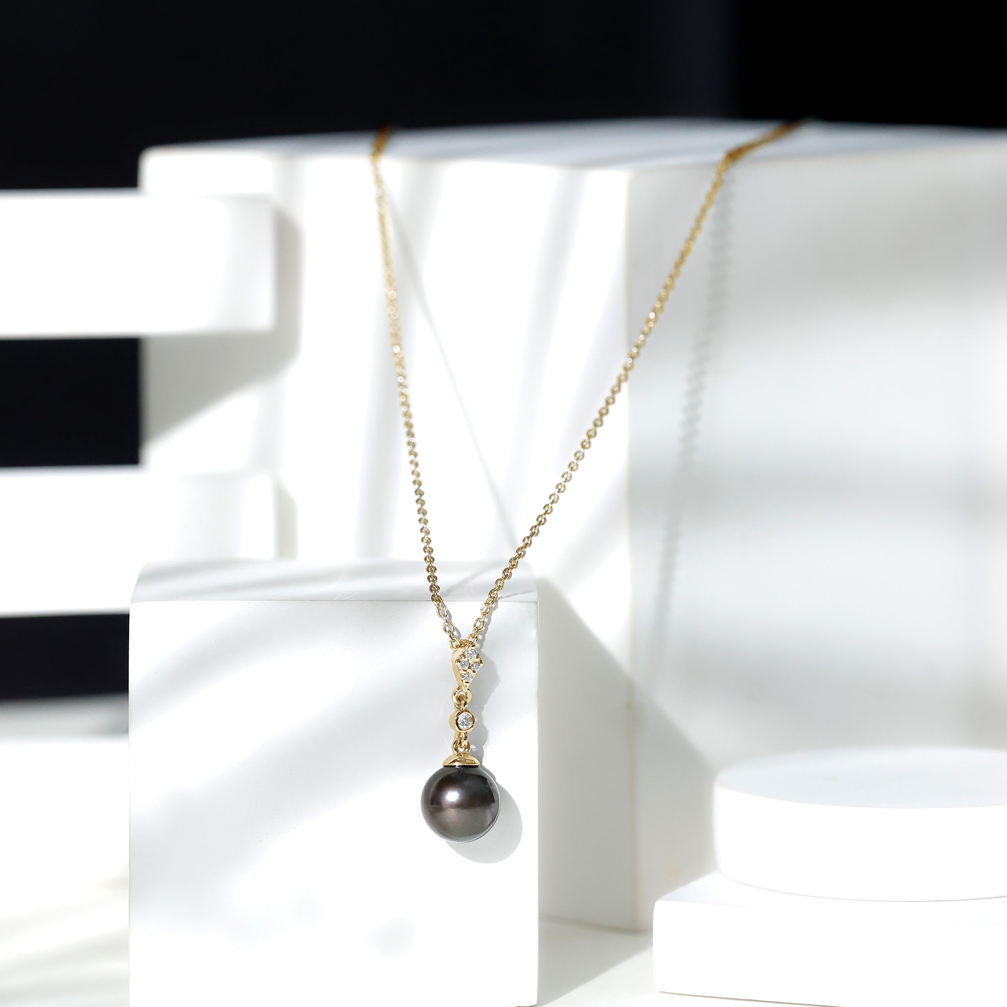 Highlight your neckline with this exquisite Pearl Drop Pendant featuring a breathtaking 10 MM Round Shaped Tahitian Pearl (AAA quality), dangling from a unique arrangement of round cut moissanite stones. Suspended from a fine chain, this Black Pearl Necklace is a testament to both luxury and classic choices. This Dangle Pendant Necklace makes an ideal anniversary or birthday gift, perfect for celebrating the love and connection you share. Whether walking down the aisle or celebrating a special moment, this Bridal Necklace is the ideal accessory to add grace and glamour to your big day. Also, it comes with a Certificate of Authenticity, ensuring exceptional craftsmanship and quality.