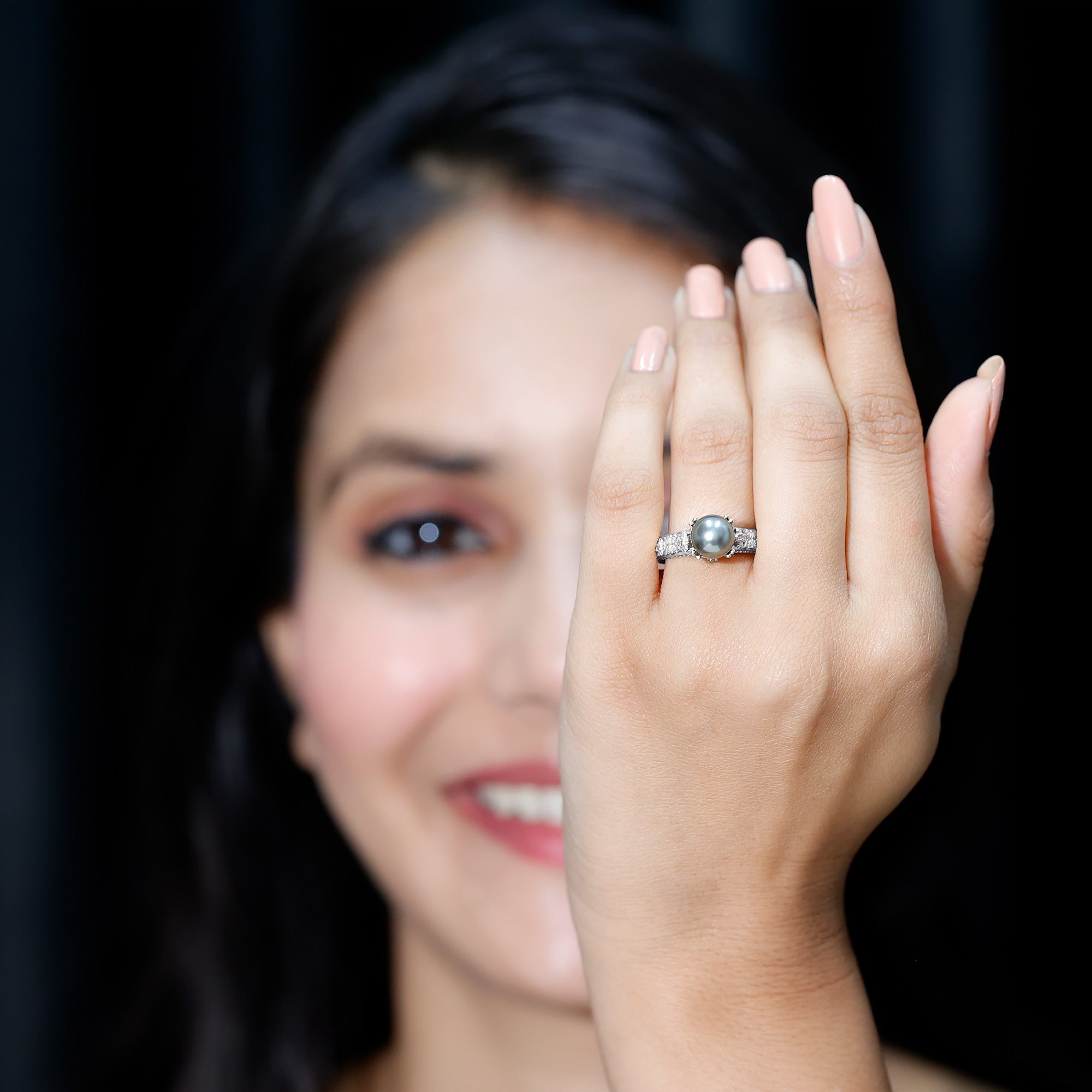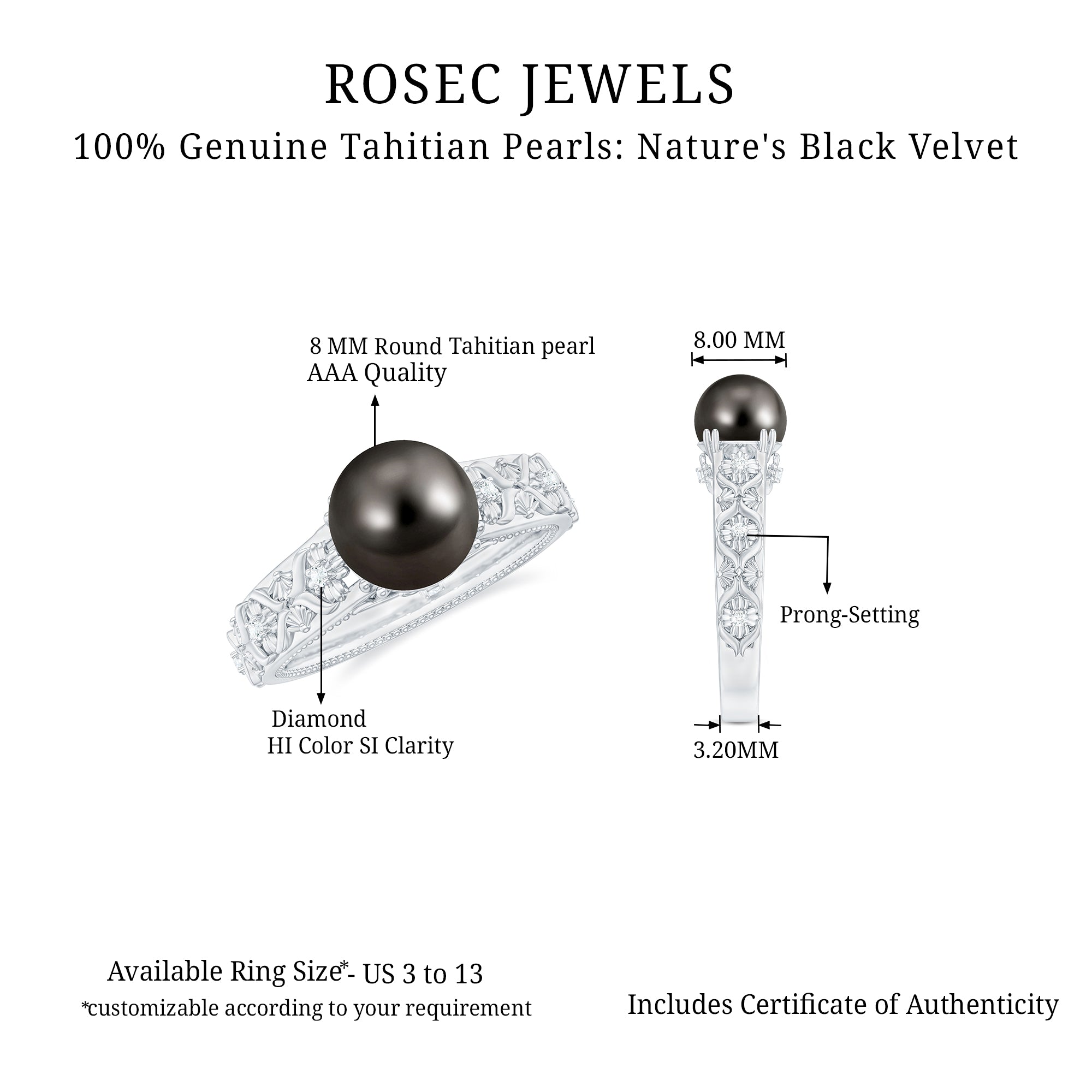 This Tahitian Pearl Engagement Ring is designed to bring natural beauty and timeless elegance together in one special piece. At the center of the ring sits an 8 MM Tahitian pearl, set in bead setting. The band of the Pearl and Diamond Engagement Ring is carefully crafted with floral engravings that add a romantic touch. These gentle details make the design feel unique without being too bold. Small diamonds are set along the band, offering a delicate sparkle that highlights the pearl and adds just the right amount of shine. A charming detail lies beneath the center stone - two hidden diamonds placed in a tiny floral design. These surprise stones add a special touch that only the wearer will notice, making the Vintage Pearl Ring feel even more personal. This Tahitian Pearl and Diamond Ring is created for someone who appreciates meaningful design and natural elegance. Available in US sizes 3 to 13, it offers a comfortable fit and comes in a beautiful jewelry box, ready for a memorable moment.