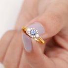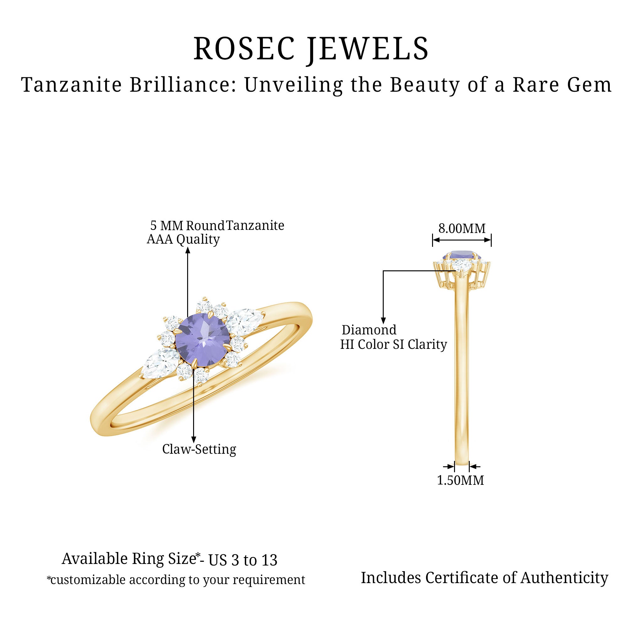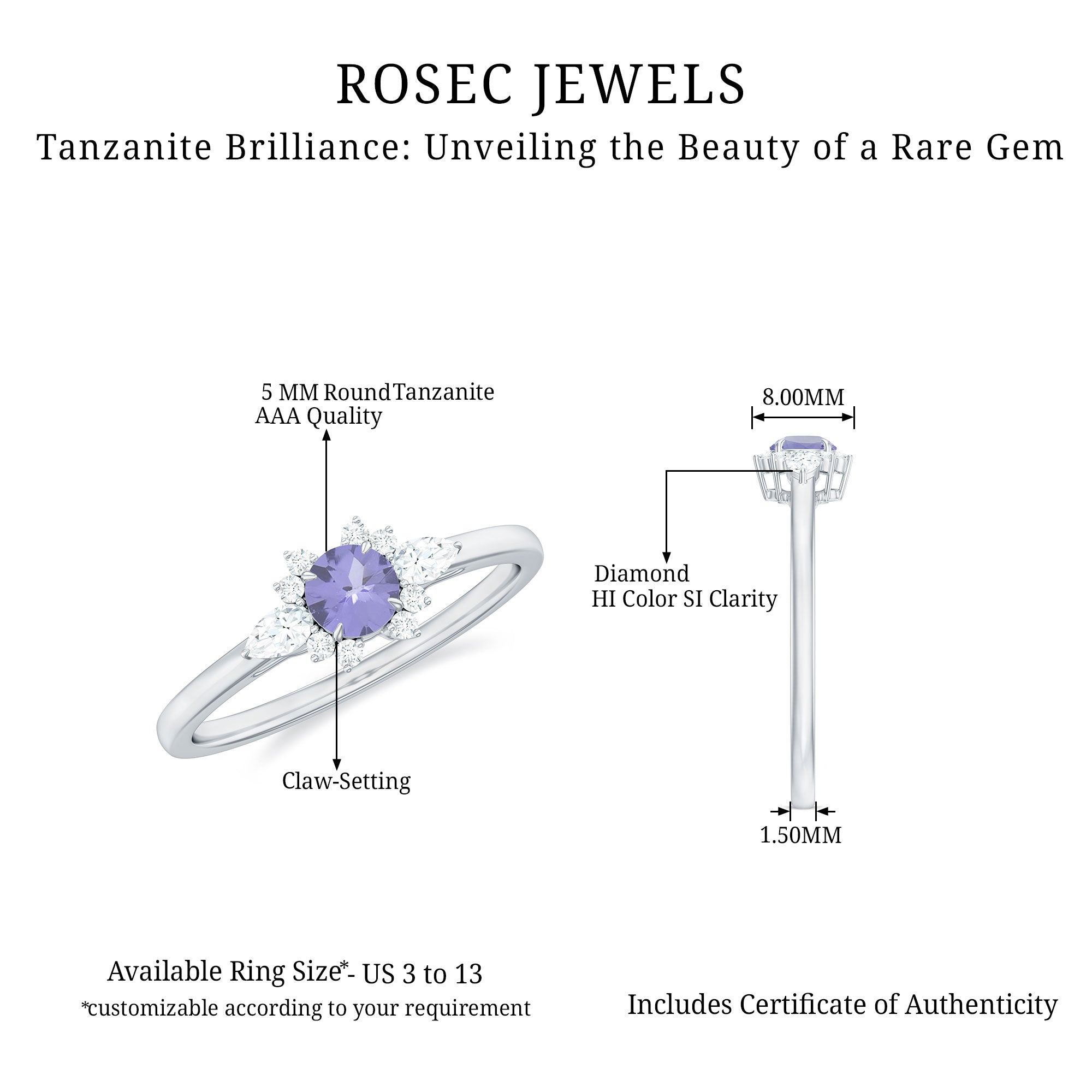 Promise your love and commitment to your special someone with this exquisite Tanzanite Diamond Promise Ring. The 5 MM Round Shape Tanzanite stone is beautifully adorned in a Claw Setting, and the addition of Diamond stones adds even more charm to this stunning ring. Show your devotion and promise to never leave her side with this beautiful and timeless piece of jewelry.