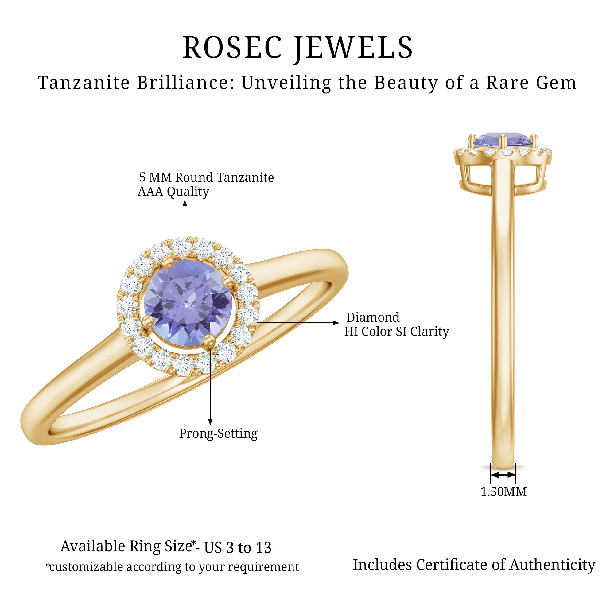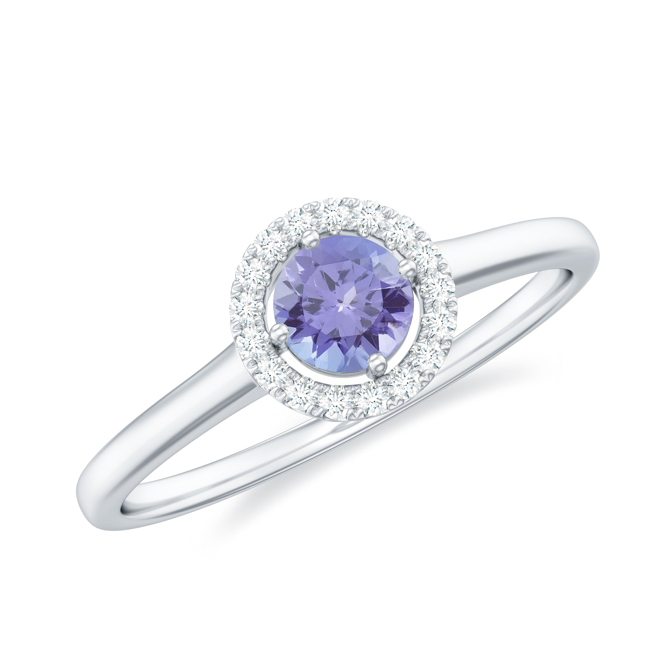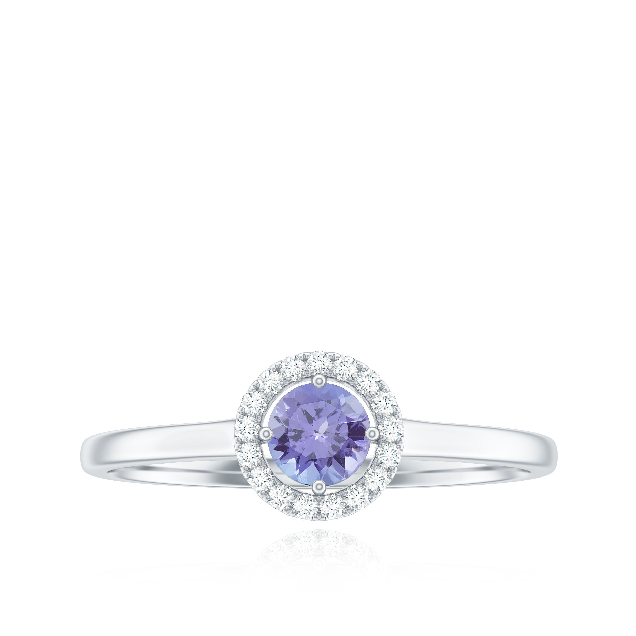 Surprise her with this gorgeous Halo Ring featuring a 5 MM Round Shape Tanzanite at the center and surrounded by sparkling Round Shape Diamond stones in a Prong Setting. This Dainty Ring for Women is sure to take her breath away.
