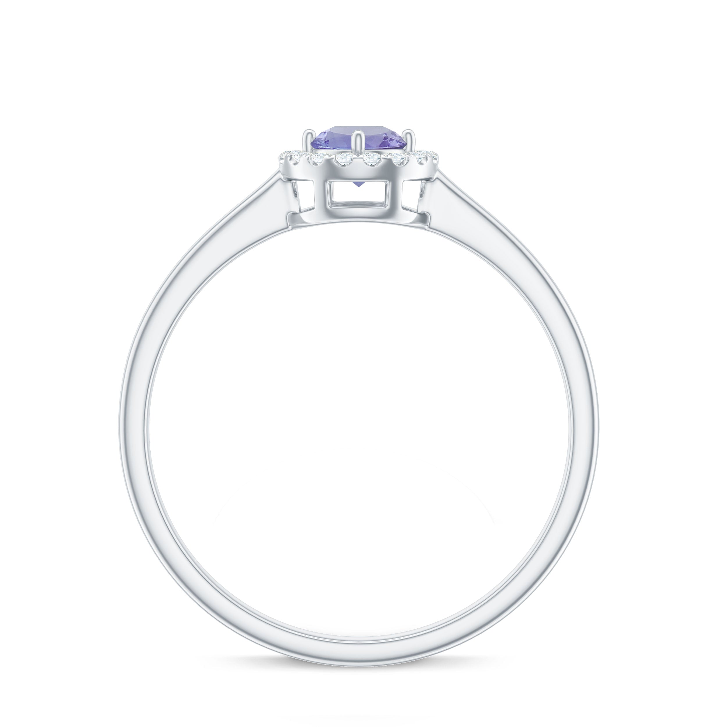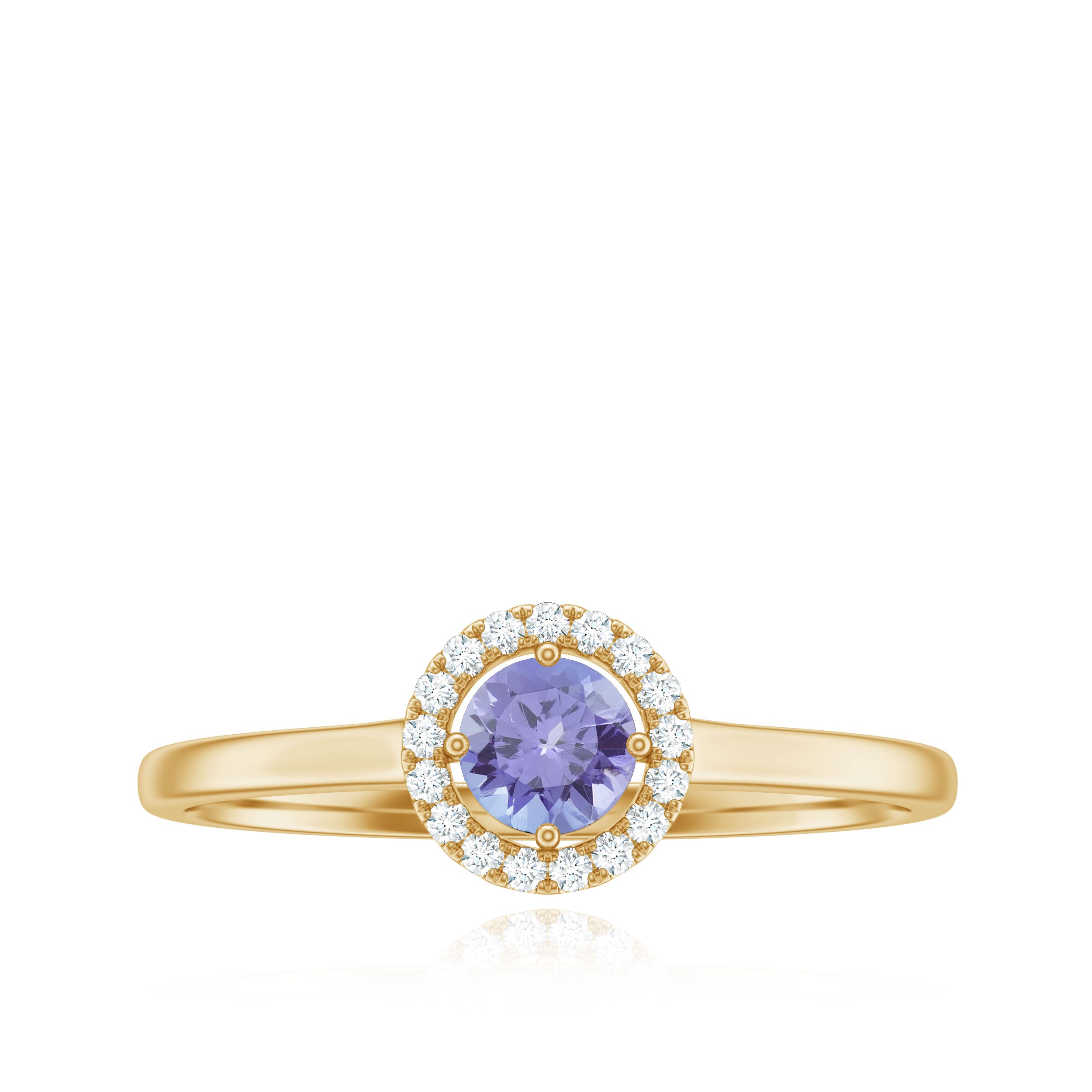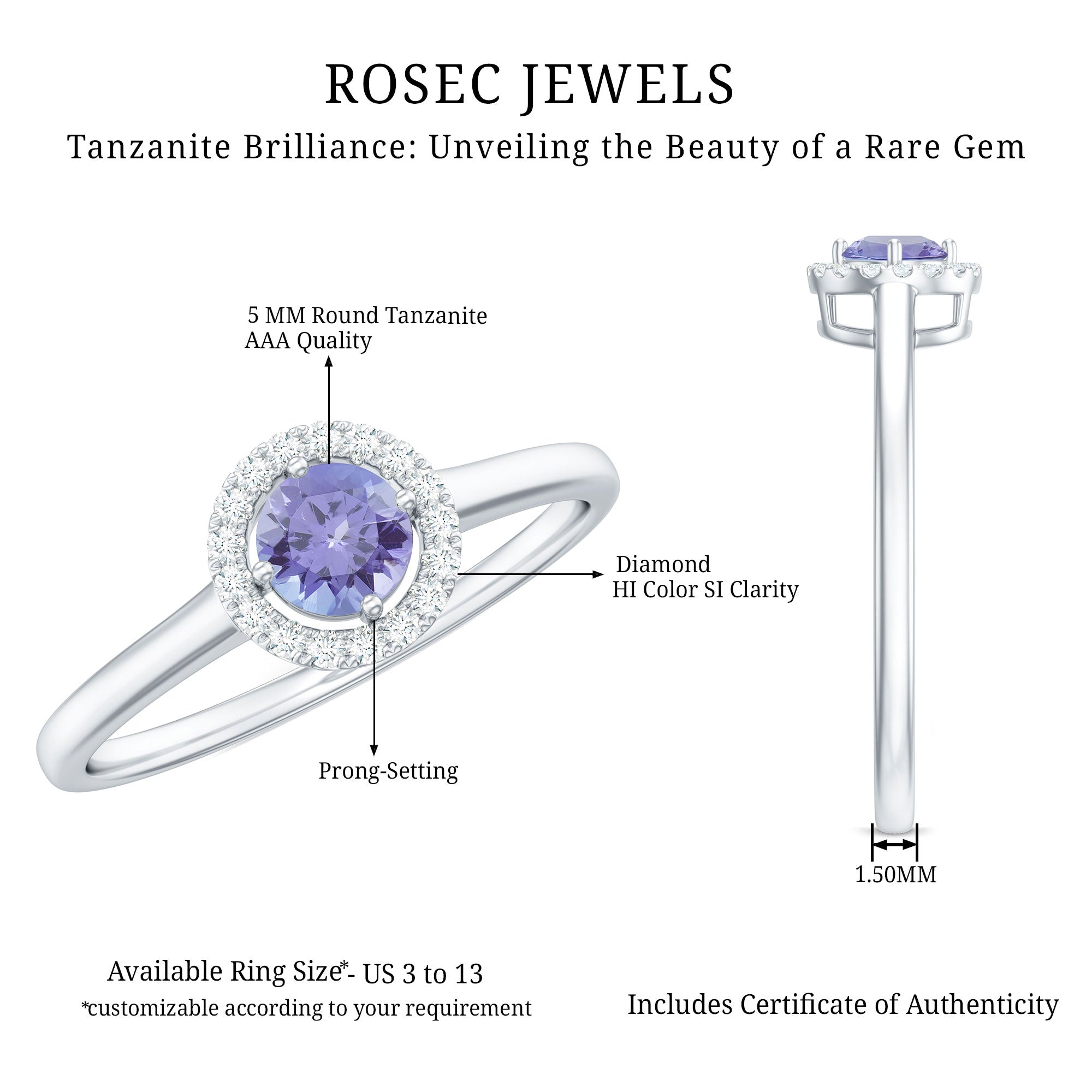 Surprise her with this gorgeous Halo Ring featuring a 5 MM Round Shape Tanzanite at the center and surrounded by sparkling Round Shape Diamond stones in a Prong Setting. This Dainty Ring for Women is sure to take her breath away.
