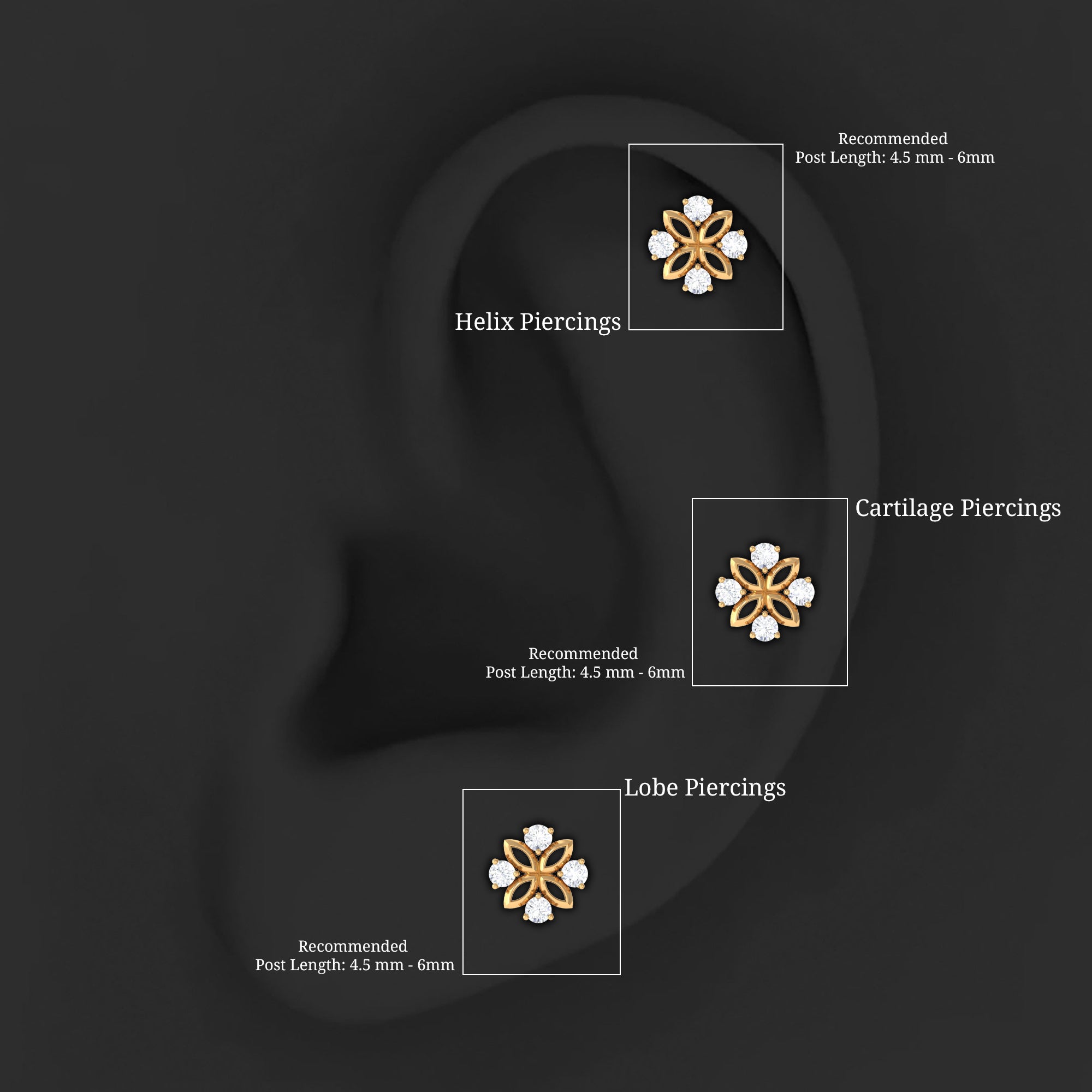 Our beautiful Diamond Flower Earring will emit a dazzling appearance and express your affection for nature with its unique floral design. This earring showcases a four-leaf flower crafted from solid metal, positioned at the center, adorned with round cut diamonds held by prongs, adding a touch of brilliance to the overall design. You can wear this Flower Stud Earring on your Helix, Cartilage, Tragus, Conch, or Upper Lobe Piercing. The flat back closure ensures it stays securely in place. The Cartilage Stud Earring is made with Hallmarked Metal, offering a distinctive and charming way to flaunt your style around town. Surprise your loved one by gifting this Diamond Cartilage Earring as an anniversary or birthday gift for her. Delight your special someone with this Diamond Stud for any occasion, whether its a birthday, graduation, anniversary, or simply to show you care. Whether worn solo as a statement piece or layered with other earrings for a curated ear look, it seamlessly fits both minimalist and bold styles.