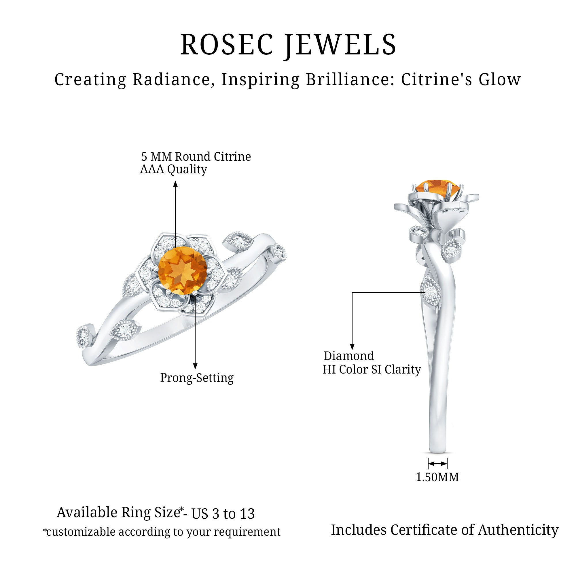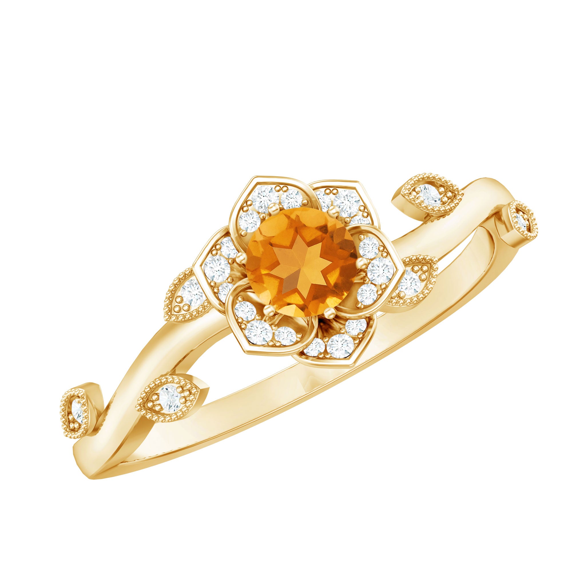 Experience the beauty of nature with this enchanting Nature Inspired Ring. A Round Shape Citrine Solitaire sits at the center, surrounded by petals adorned with Round Shape Diamond, creating a stunning floral design. The Metal Leaf design is further accentuated with additional Diamond, adding to its allure. Embrace the elegance and charm of this exquisite ring, a perfect choice for nature lovers and those who appreciate unique and captivating designs.