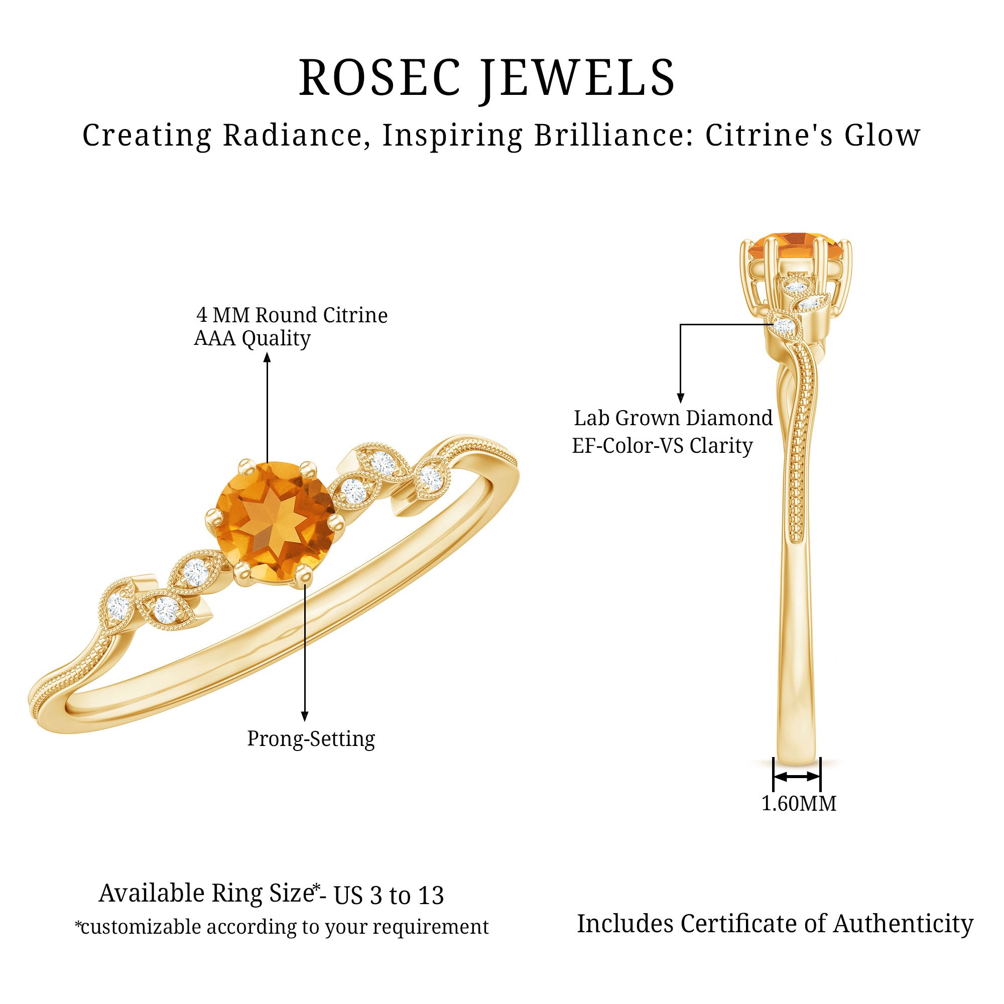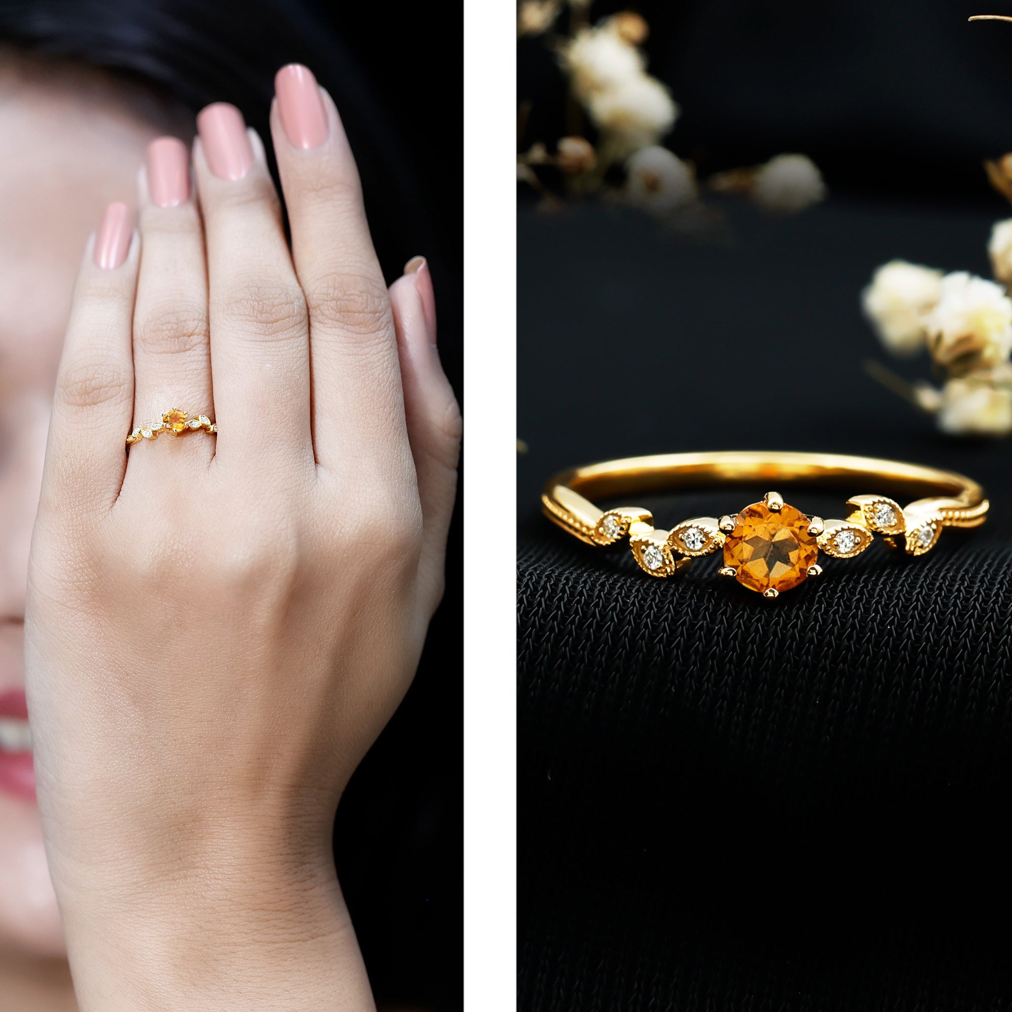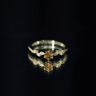 Let your promises bloom like nature’s beauty with this delicate Citrine Ring, an everyday treasure filled with meaning. Crafted in 14K yellow gold plated silver, this Minimalist Promise Ring is a soft symbol of love, light, and commitment. At its center sits a 4 MM round shaped citrine, held by prong setting. Its brightness is gentle yet bold, adding a cheerful glow to your everyday style. What makes this ring truly special is the band. Designed with a graceful leaf-inspired pattern, the shank features alternating marquise-shaped leaf motifs, each one carefully adorned with sparkling round lab grown diamonds. The tiny beaded edges around each leaf detail add a vintage charm, giving the Citrine and Diamond Ring a refined yet whimsical touch. This ring is made to be light and comfortable, making it ideal for daily wear. Perfect as a minimalist piece of jewelry, this design is for those who value subtle beauty and heartfelt meaning. This Leaf Ring is ideal for marking a quiet milestone, whether it’s a promise to a partner, a friend, or even to yourself. The citrine, a symbol of joy and clarity, pairs perfectly with the timeless sparkle of ethical diamonds, offering a graceful blend of warmth and brilliance.
