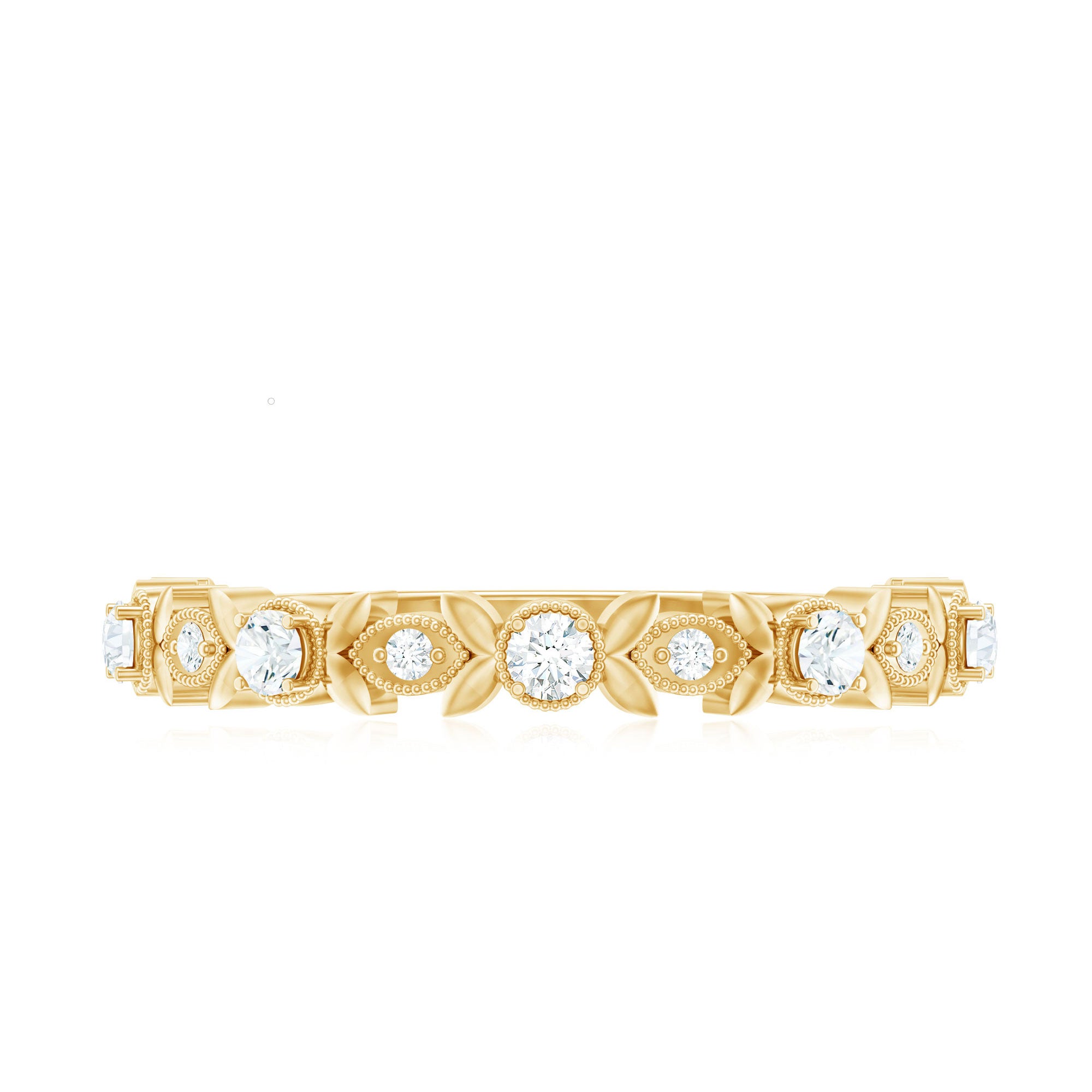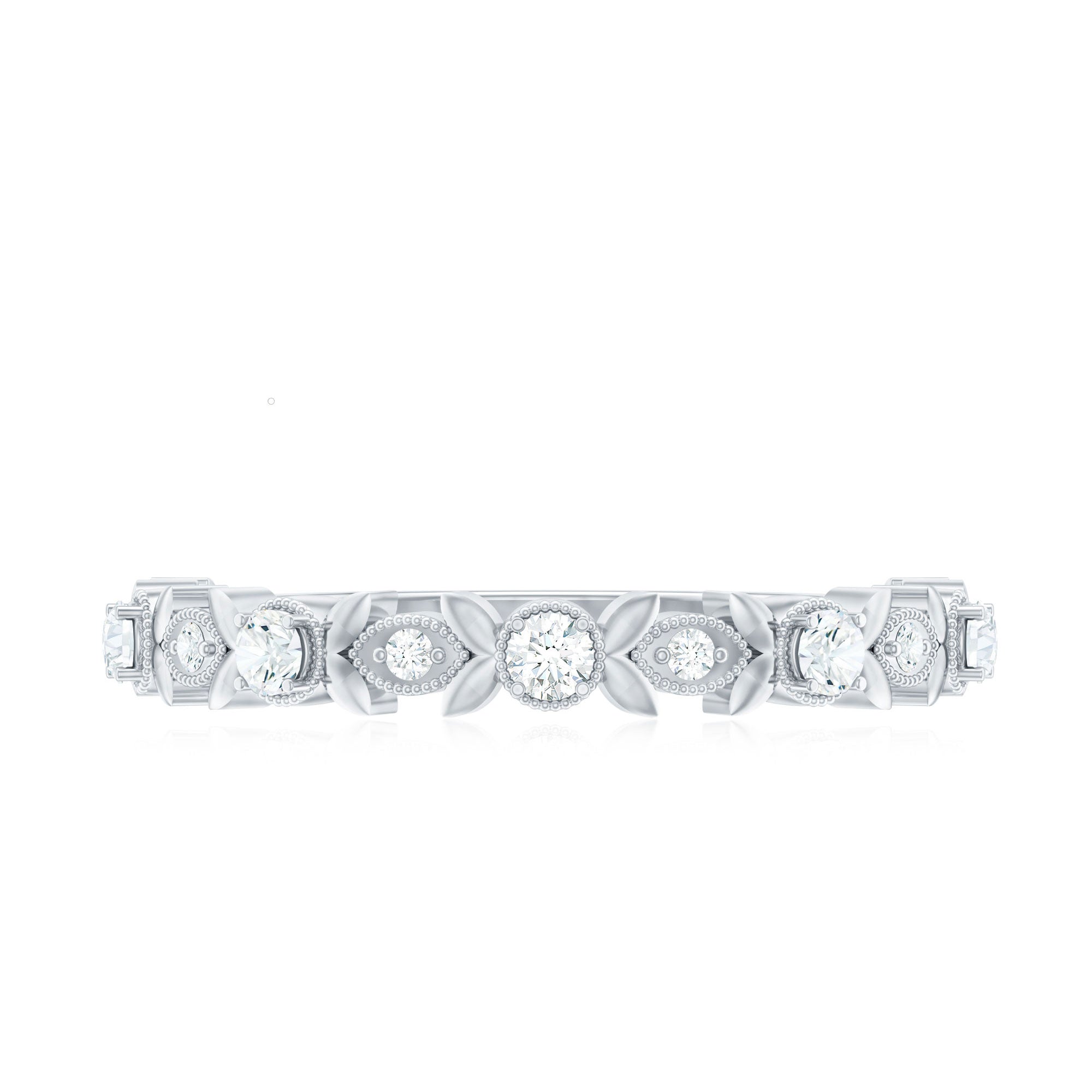 The stunning, intricate details that would let you stand out when you slip on this charming Diamond Wedding Band. A true nature inspired piece of jewelry for a woman who seeks the natural elements, mimicking the leaf design encrusted with Round Diamond and the beaded details that would keep its roots intact in the traditional world. So, if she embraces the love of nature, then this Nature Inspire Wedding Ring is a perfect go-to option. Much like the leaf motifs, and with a great combination of Natural Diamonds, which would always remind you of the design that would suit your style and personality. This Simple Diamond Ring feels modern and timeless with a styling trend that offers a whisper of classic aesthetics. Though simplicity is the ultimate sophistication, it ensures that it remains stylish for years to come. As the perfect symbol of love, this Vintage Wedding Band has a minimalist design that allows the Natural Diamond to take center stage and embrace simplicity.