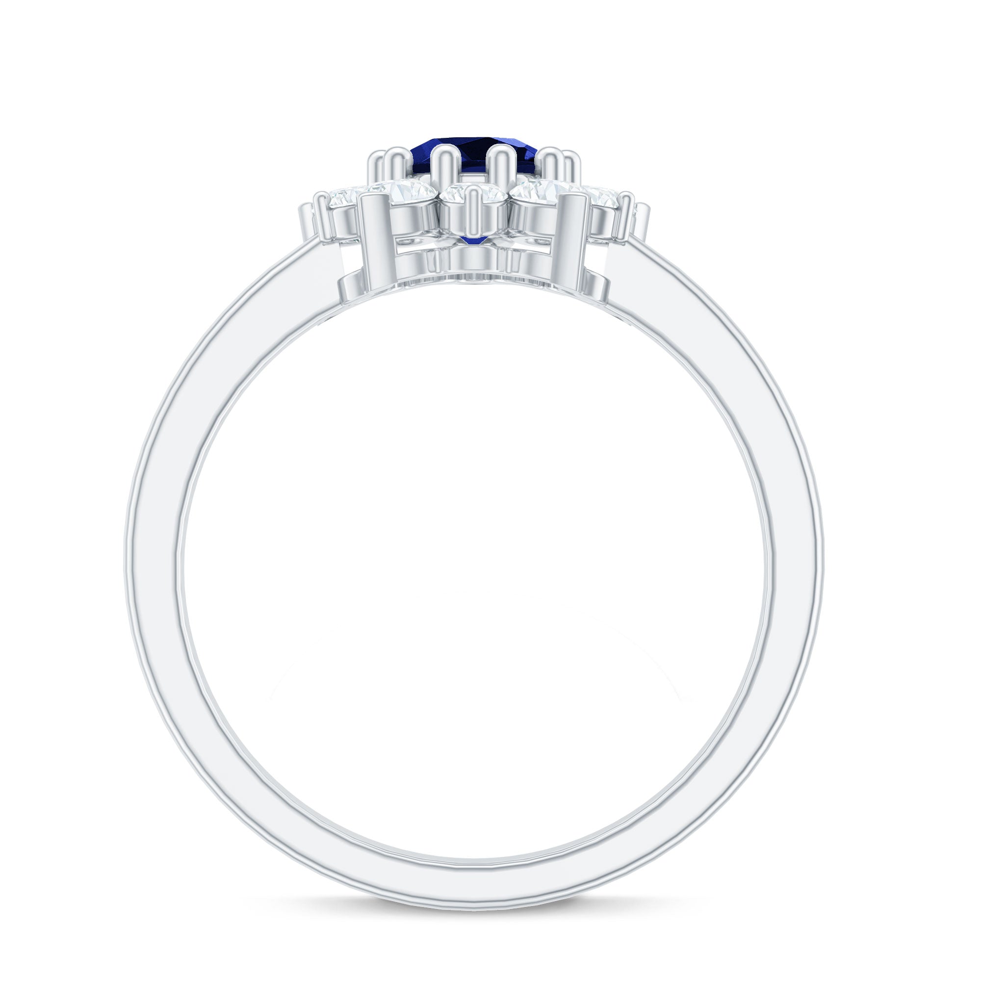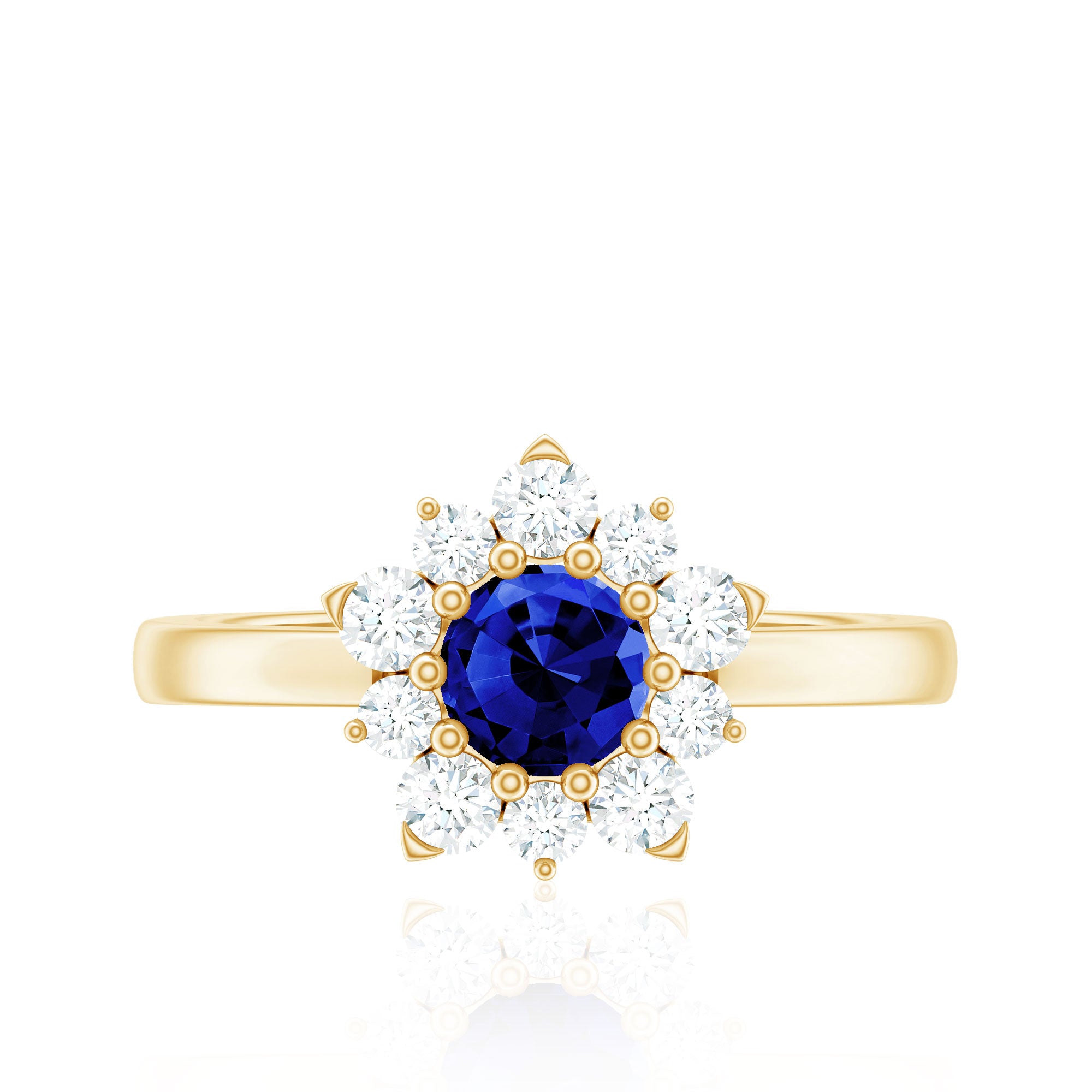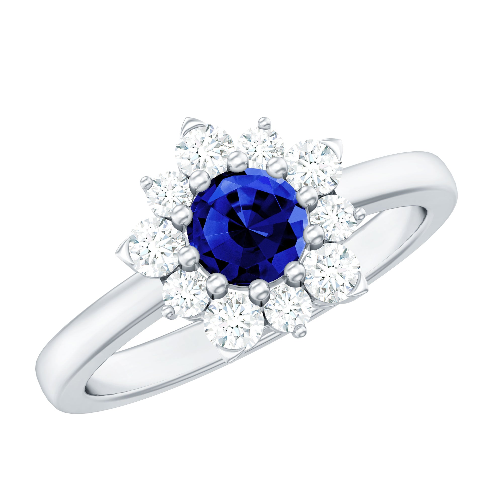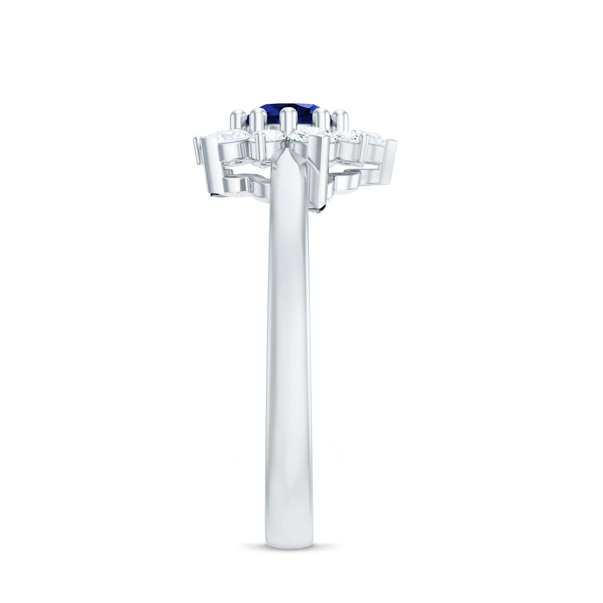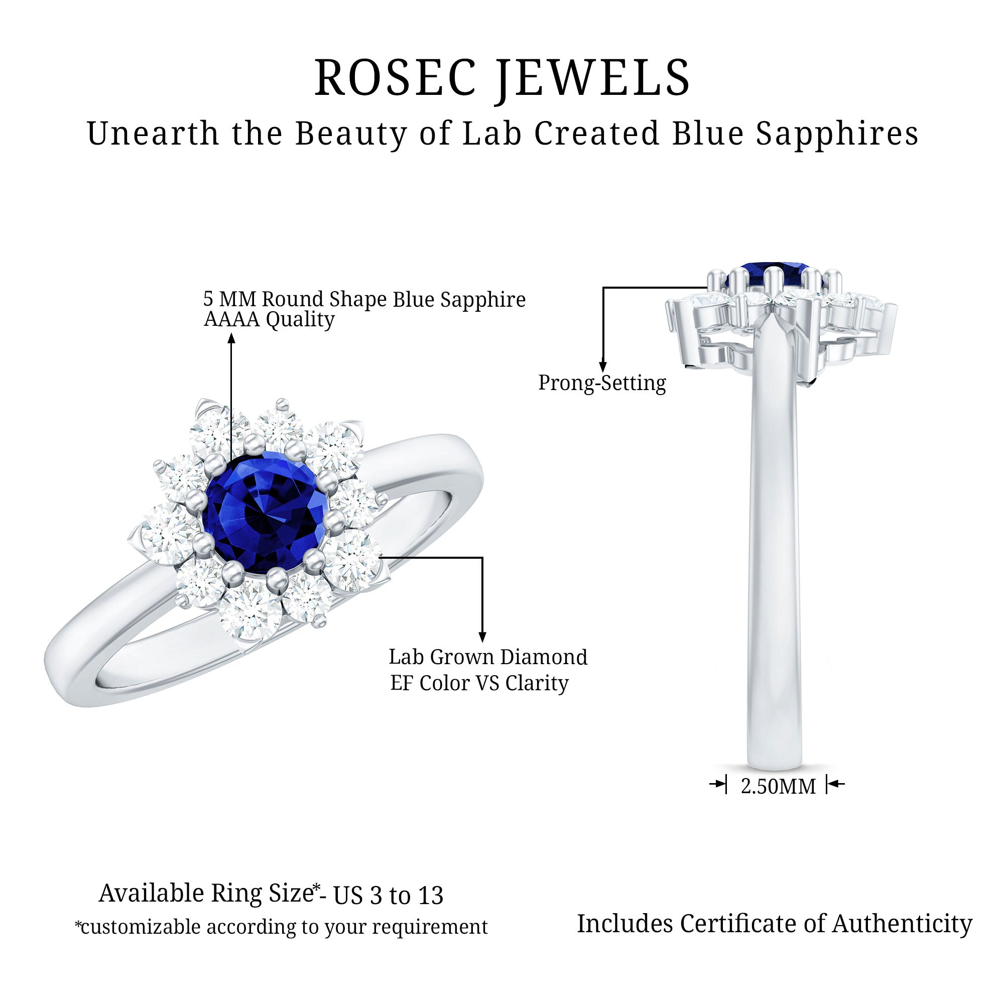 Shine like a Promise Day star with our Lab Grown Blue Sapphire Floral Ring. Behold the mesmerizing beauty of the radiant 5mm Round Shape Blue Sapphire, the heart of our design, as it gleams like the very essence of a blooming flower. Surrounding it, a brilliant constellation of Round Lab Grown Diamonds, glistening like delicate petals, comes together to craft an everlasting floral masterpiece. The captivating blue hue and exceptional durability of the Lab Created Blue Sapphire make this ring a symbol of loyalty and wisdom, a perfect Promise Ring. With this exquisite combination of Blue Sapphire and Diamond (Cultured), heads will turn, and youll cherish the moment forever. Rosec Jewels specializes in creating awe-inspiring Aaaa Quality Sapphire and Ef-Vs Quality Diamonds that light up your world. Get ready to sparkle and captivate with our Blue Sapphire Diamond Ring, exclusively from Rosec Jewels!