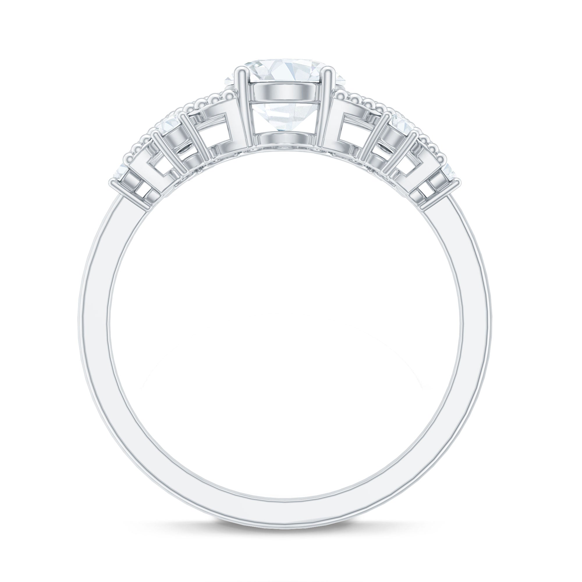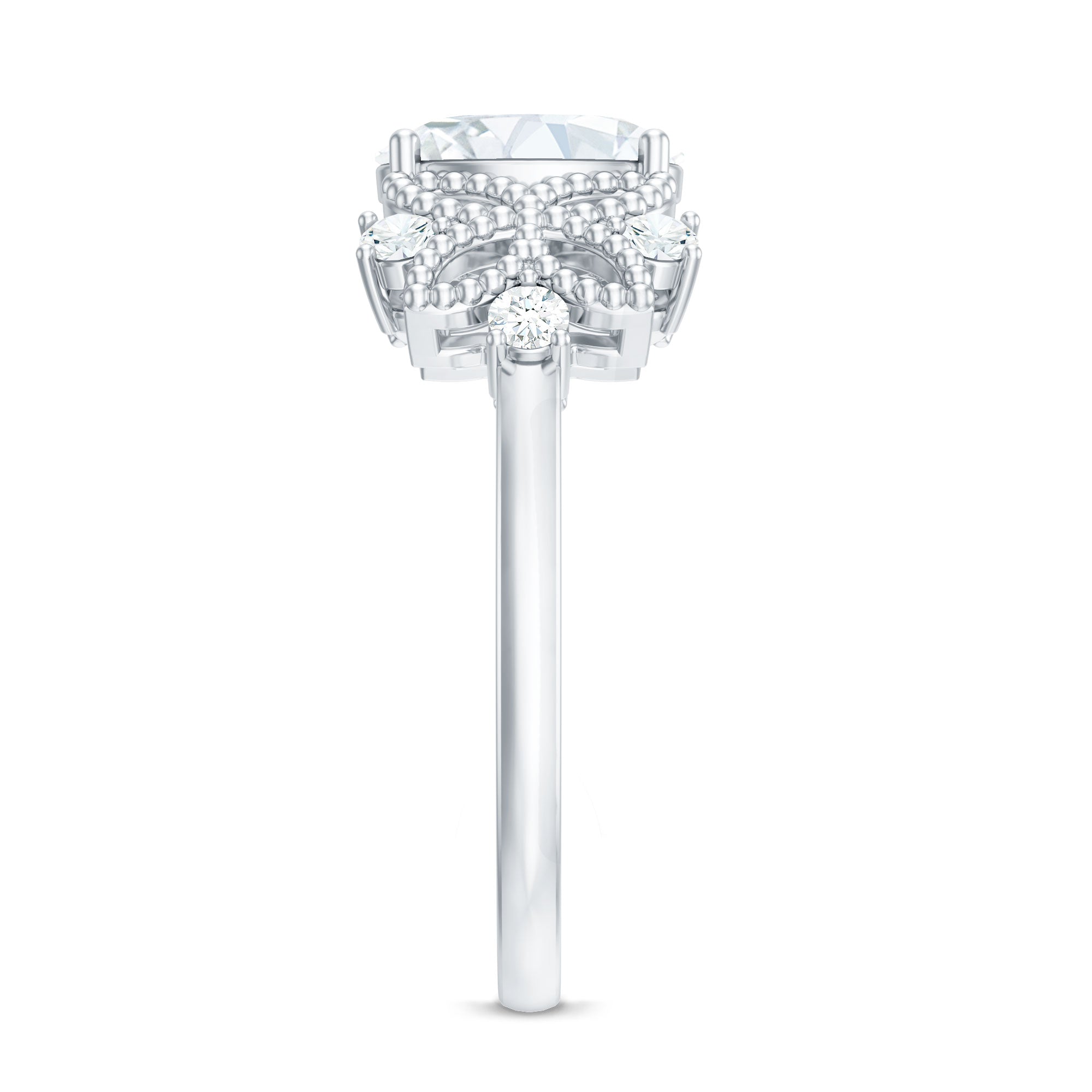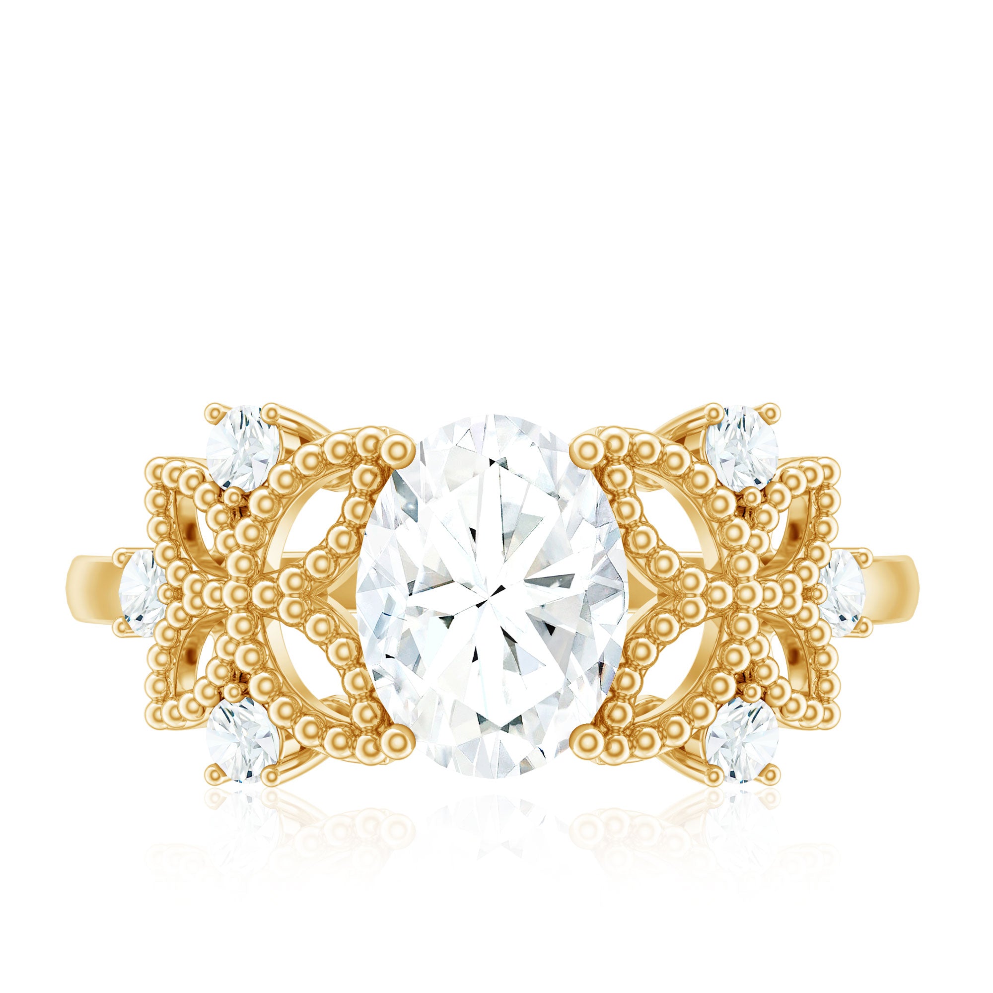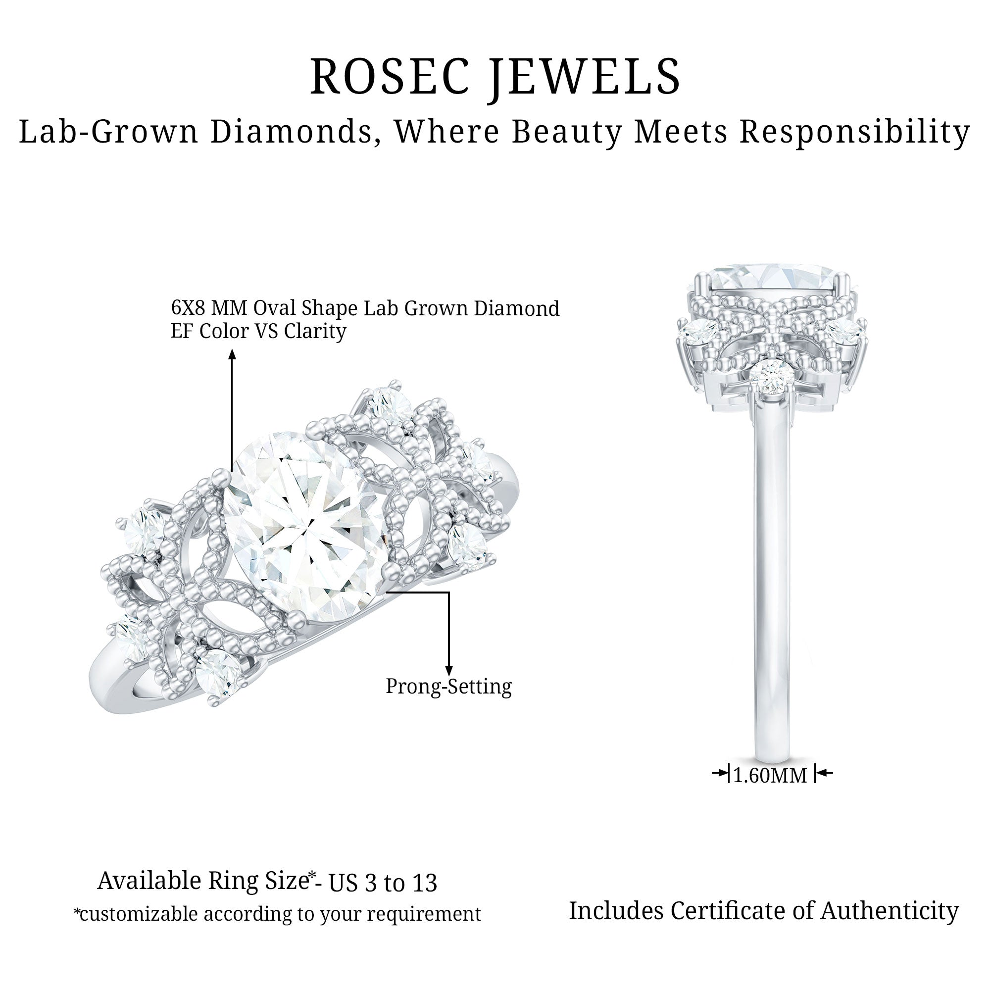 Elevate your love story with the grace of nature through this Solitaire Engagement Ring. At its heart lies a brilliant Oval Lab Grown Diamond, meticulously cradled in a secure prong setting, embodying sheer elegance. The distinctive design is a testament to natures beauty, featuring delicate round Lab Grown Diamond accents and intricate beaded patterns in a floral arrangement on both sides of the solitaire ring.