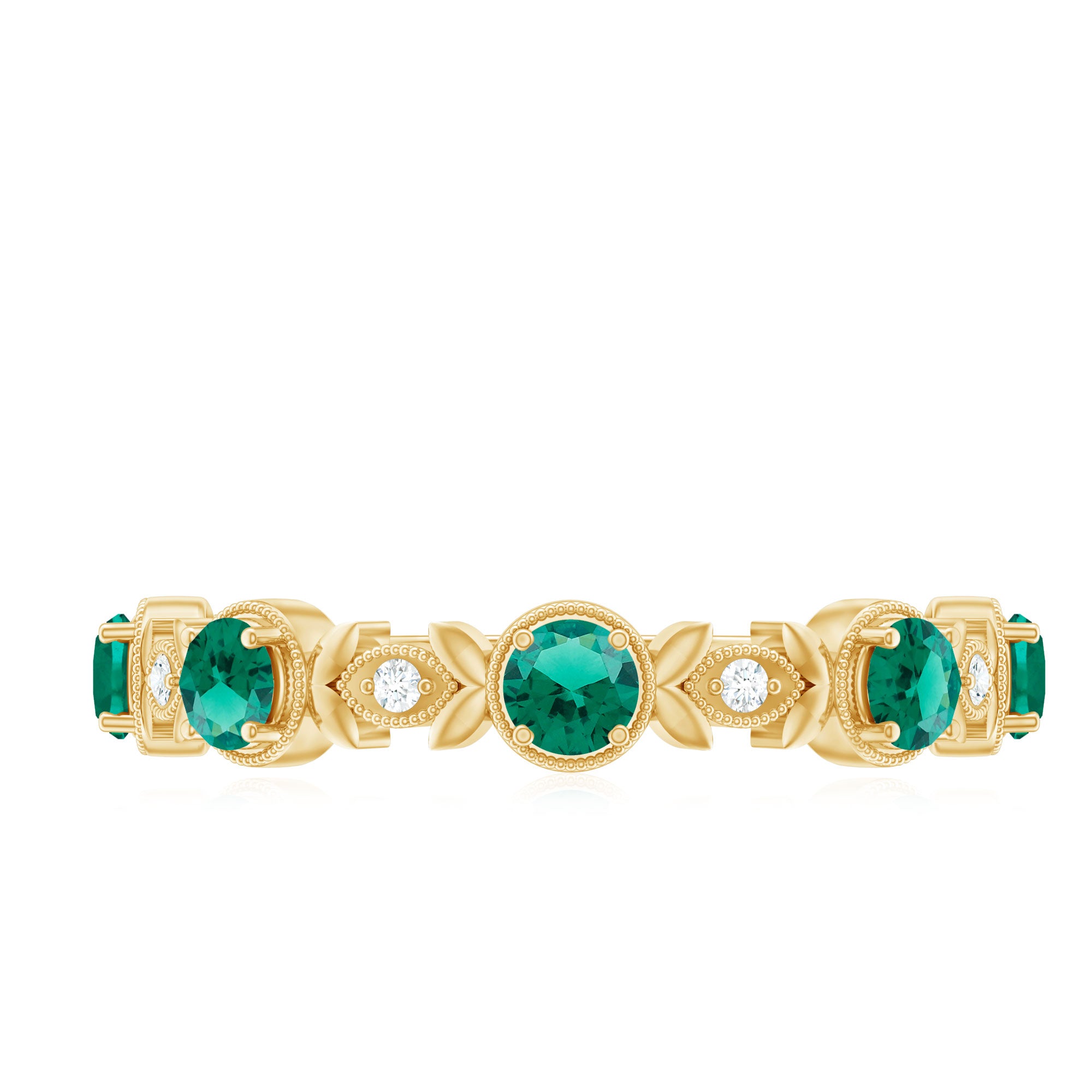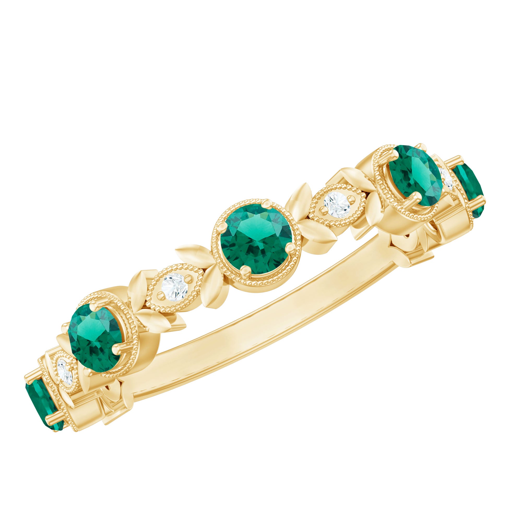 Present her this glamorous and sparkling Half Eternity Ring, designed to reflect the beauty and elegance of nature. This stunning ring is adorned with 3 mm Round Shape Lab Created Emerald stones set in Prong Setting and placed alternately with sparkling, dainty Diamond stones. The combination of vibrant green AAAA Quality Lab Emerald and dazzling HI-SI Diamond creates a perfect balance of color and brilliance. Surrounding the stones is delicate Beaded Detailing, adding old-world charm to the design. The elegant Band of the ring features intricate leaf motifs, inspired by the beauty of nature, symbolizing growth, harmony and the flourishing of love. This thoughtful design makes this Lab Emerald Diamond Ring a beautiful accessory and also a meaningful piece that celebrates the natural beauty of life and enduring connections. Perfect for special occasions, celebrations or simply as an everyday expression of style, the Lab Grown Emerald Ring enhances any look by adding a touch of sophistication and sparkle. Whether gifted as an anniversary ring, promise ring or simply to show appreciation, this Leaf Ring is ideal for women who appreciate classic designs with a unique and elegant twist.