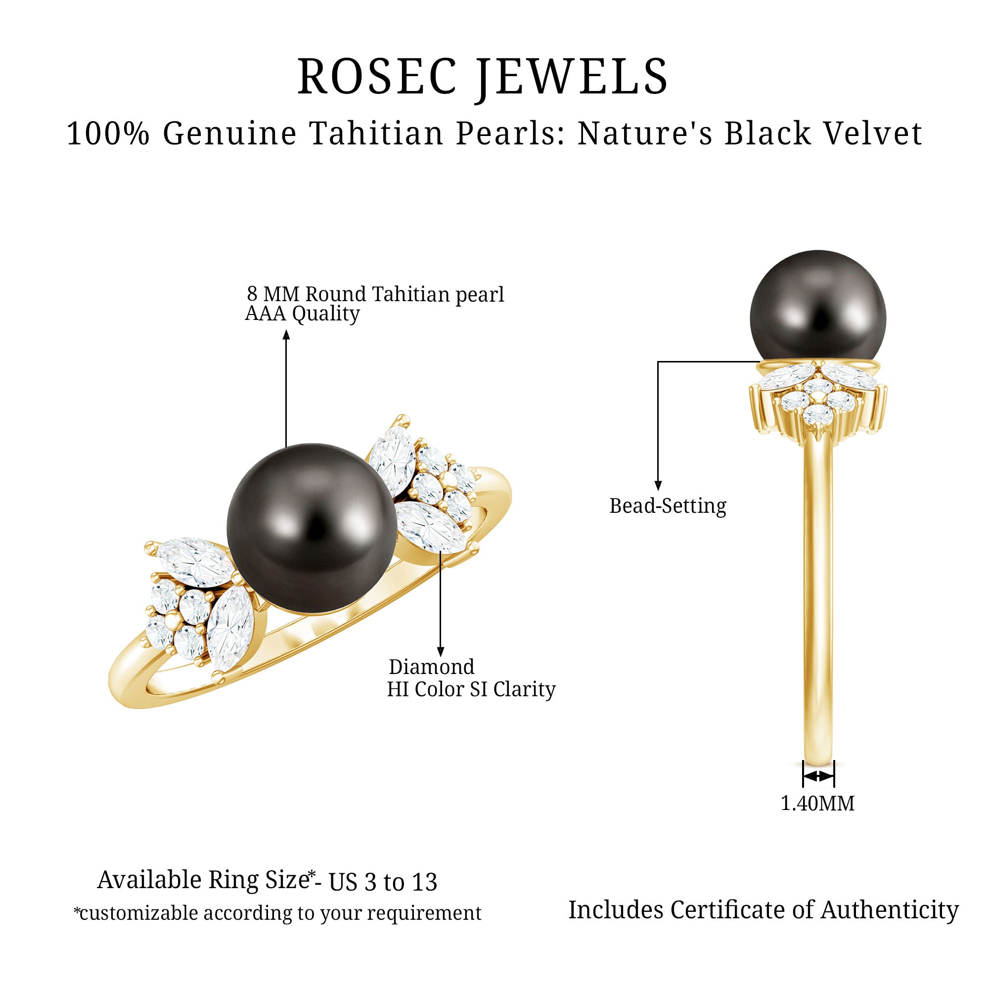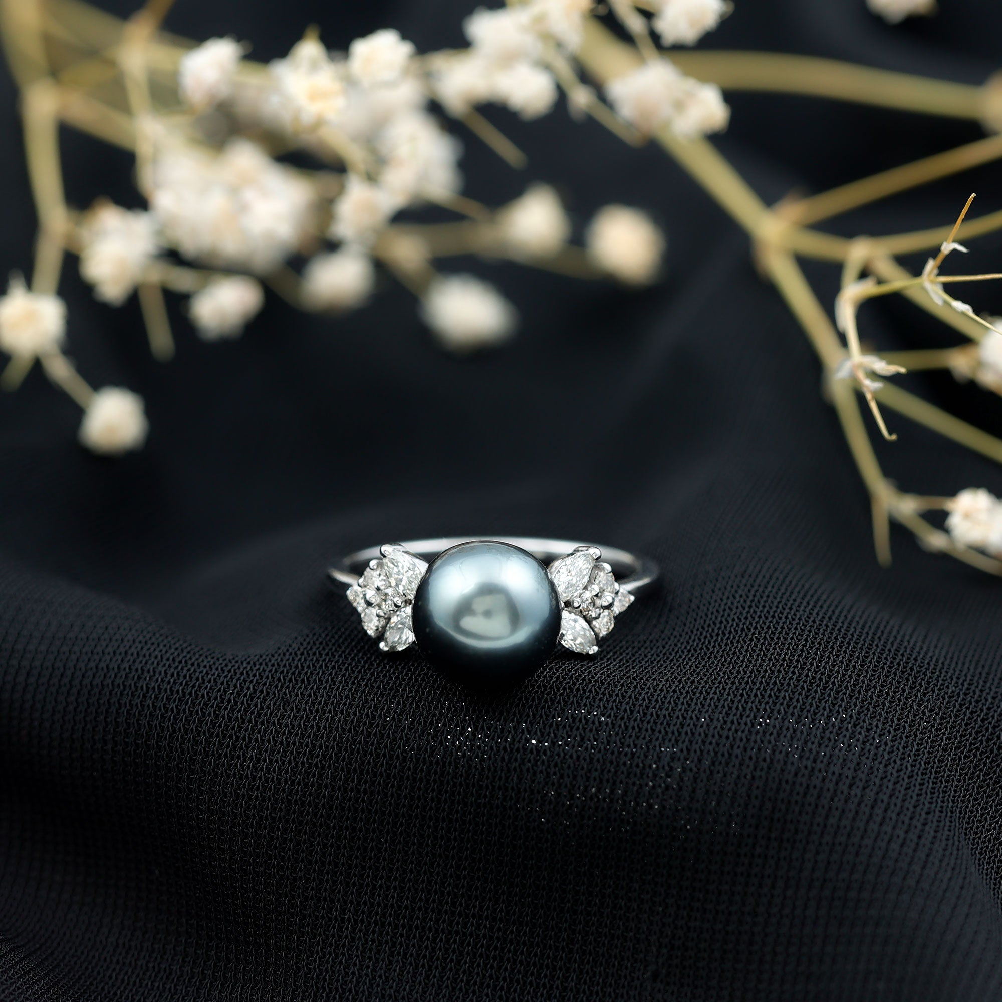 A sign of eternal love and faithfulness, perfection and infinity can be expressed with this Tahitian Pearl Engagement Ring, This beautiful ring is accentuated with round and marquise shape Diamond accent to showcase brilliance. This Natured Inspired Tahitian Pearl and Diamond Engagement Ring is handcrafted in gold for lustrous charm.