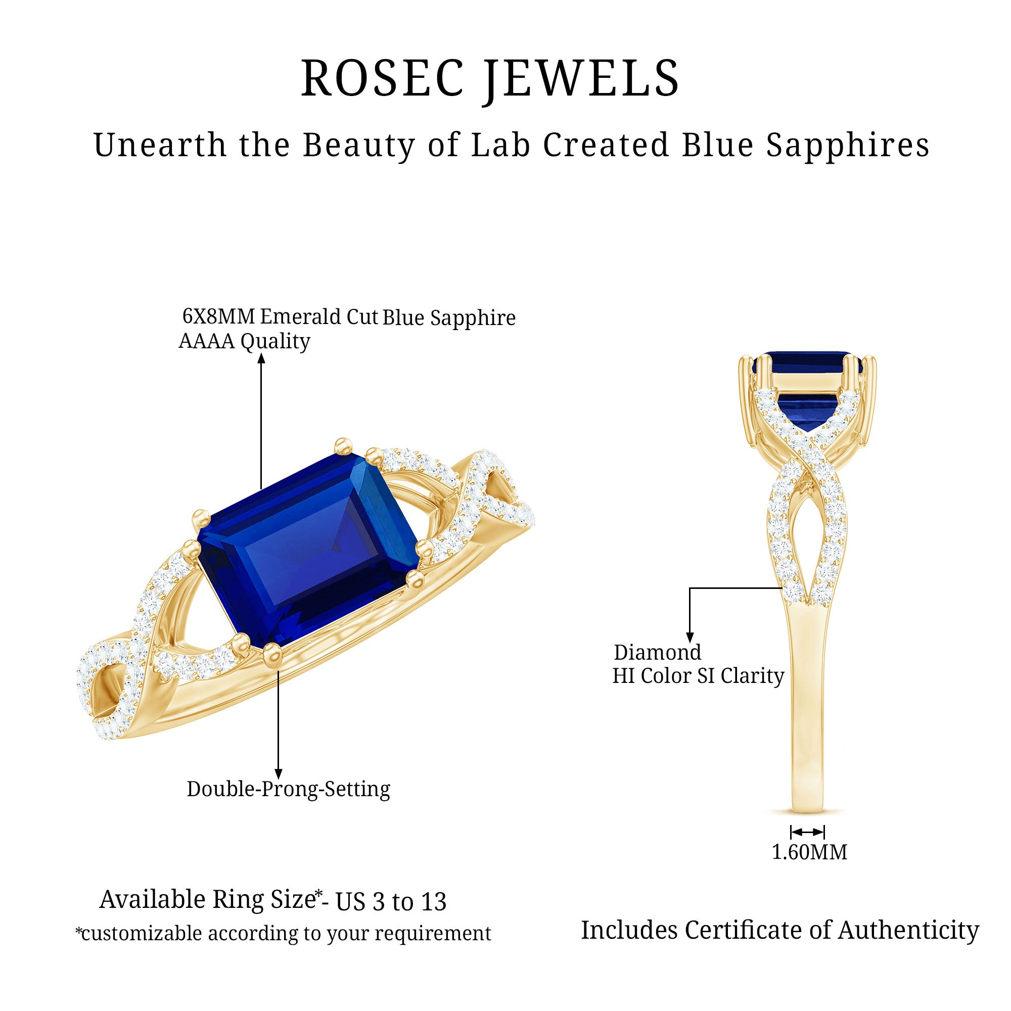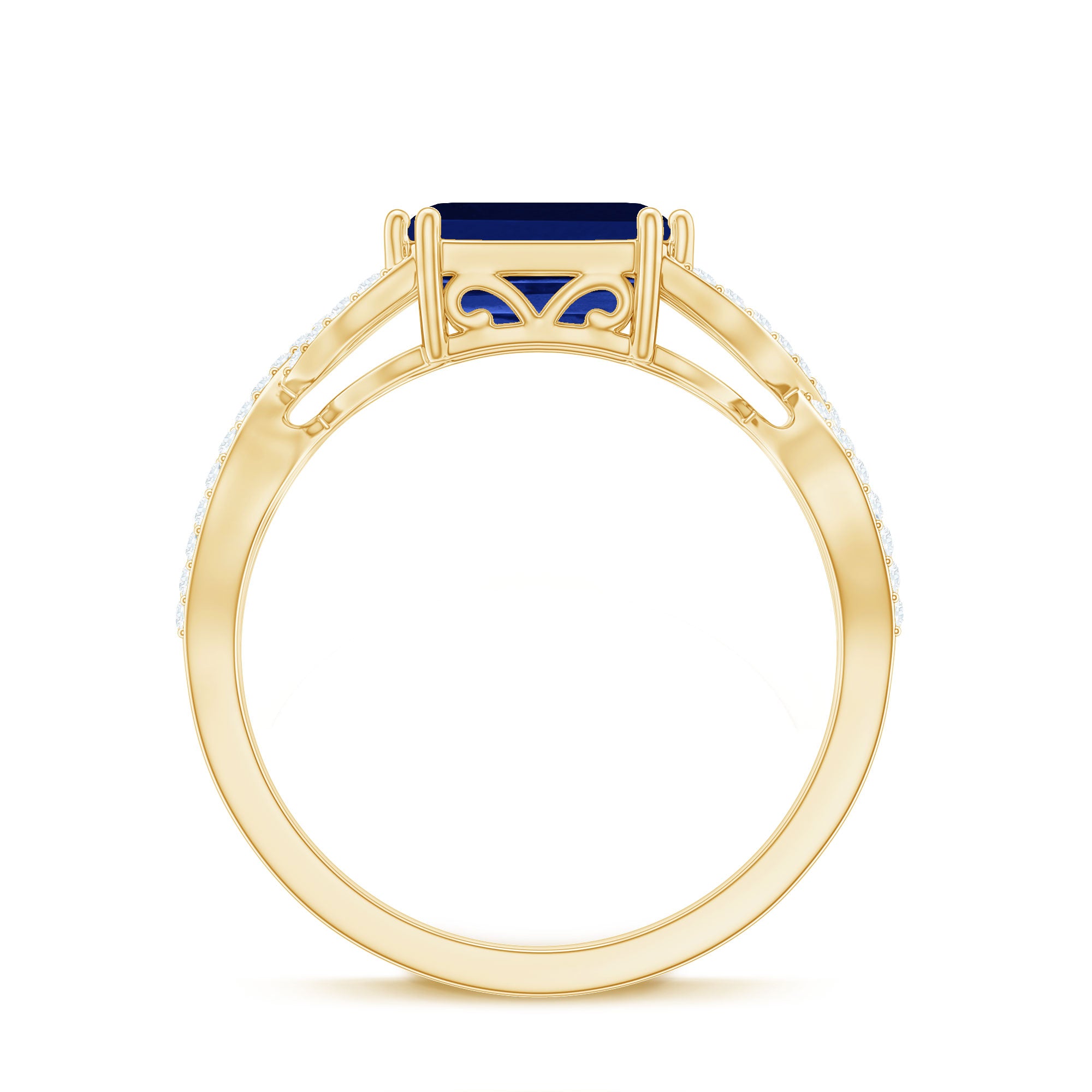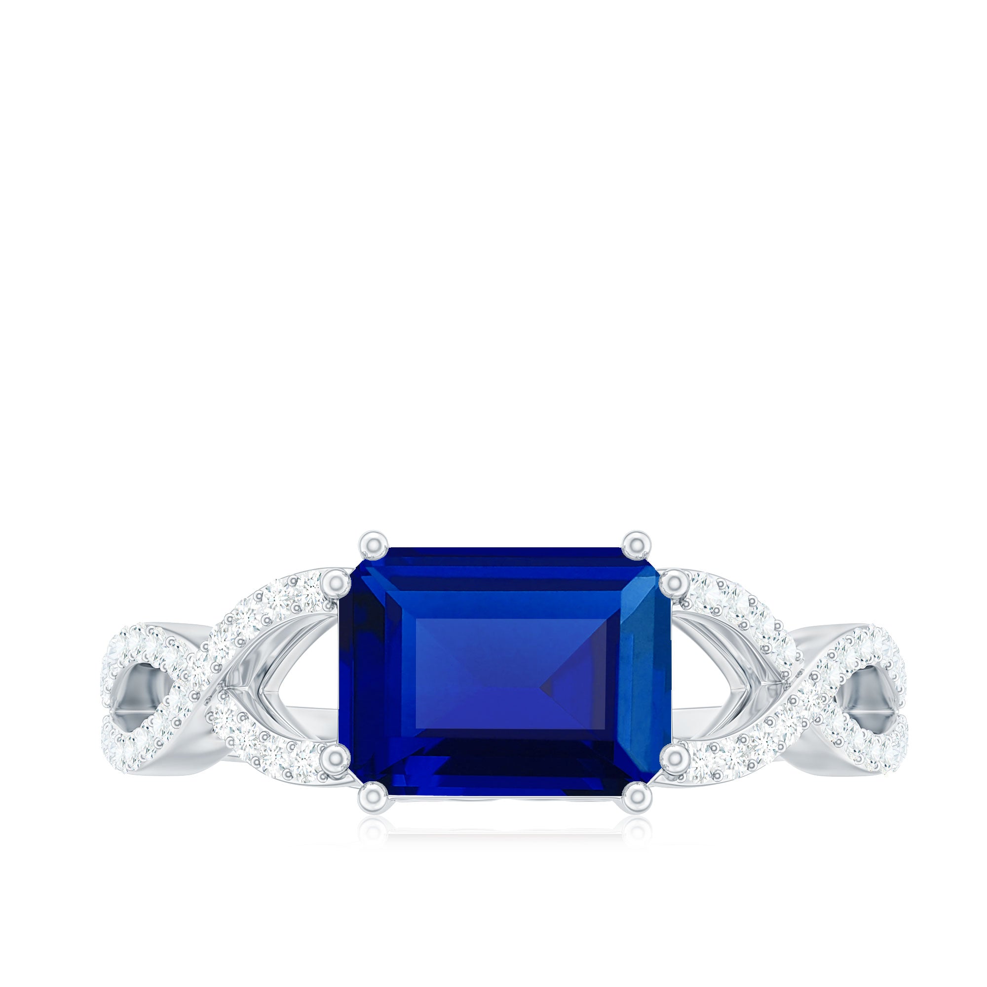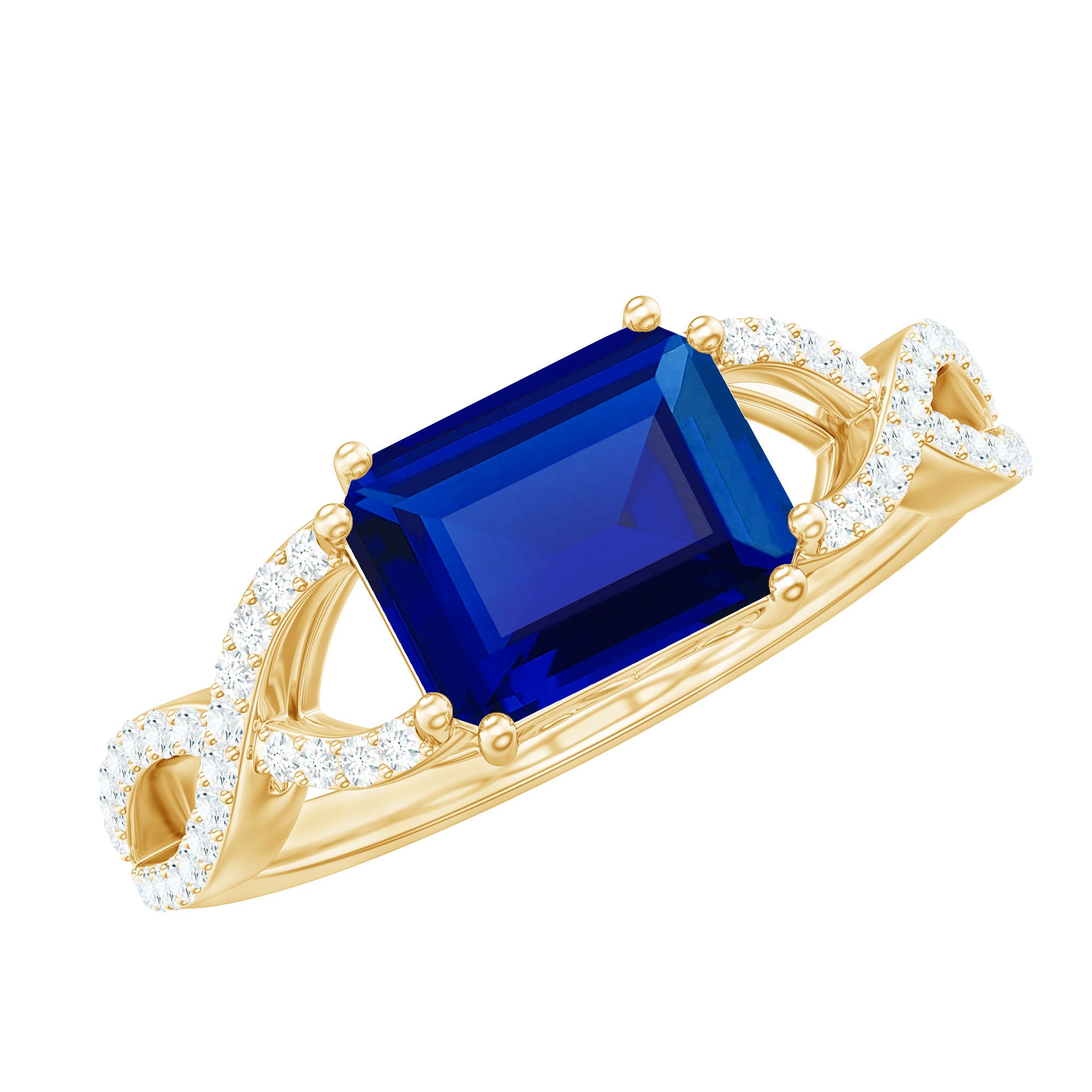 Introducing a stunning Designer Created Blue Sapphire Engagement Ring to enhance your beauty with its captivating bright blue hue. Featuring an exquisite Octagon Cut Created Blue Sapphire gemstone set as a solitaire in an East-West style and embellished with Diamond on a Gold Crossover Shank, this Solitaire Ring is the perfect choice for your lovely lady.