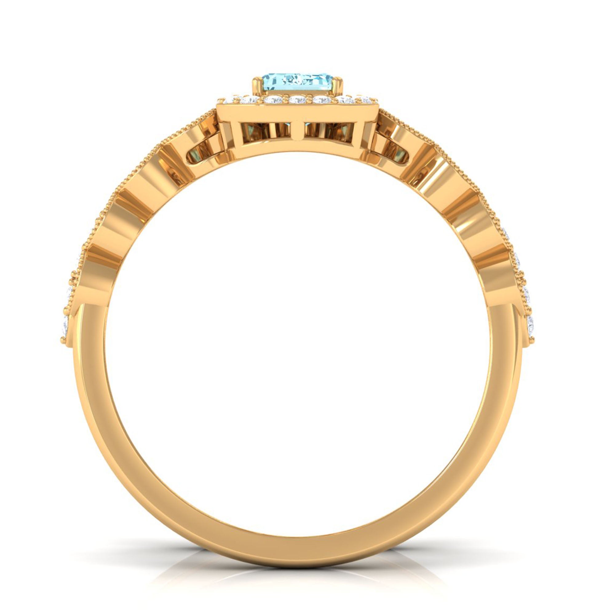 Get this alluring Wedding Ring Set for her and make a commitment to a lifelong promise of caring, laughter, and love. Decorated with Emerald Cut Aquamarine secured in 4 Prong Setting while dainty Round Diamond adding a touch of sparkle. This Aquamarine Ring Set will shine brighter on your special day. Make your bond stronger by giving her this Ring Set as a symbol of love.