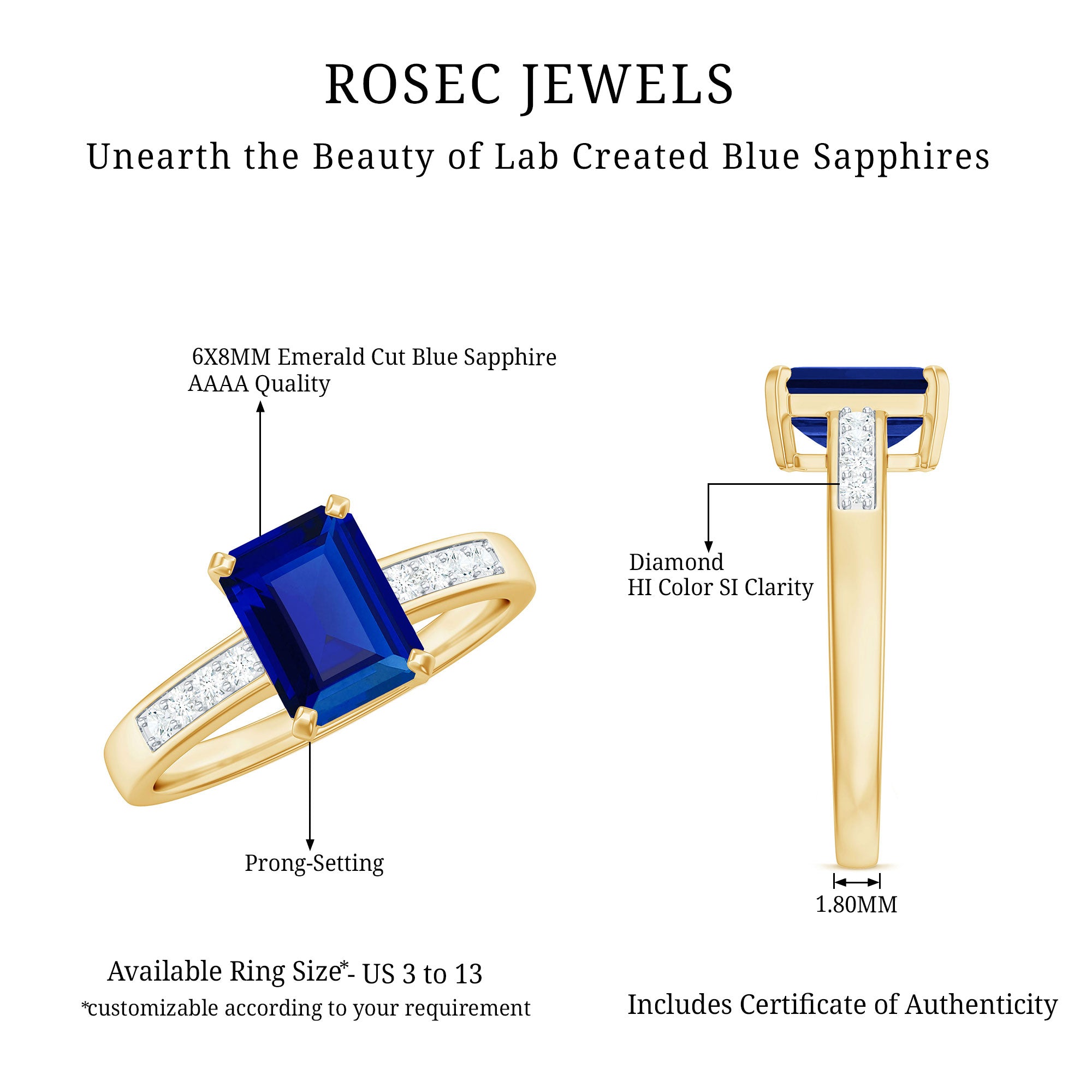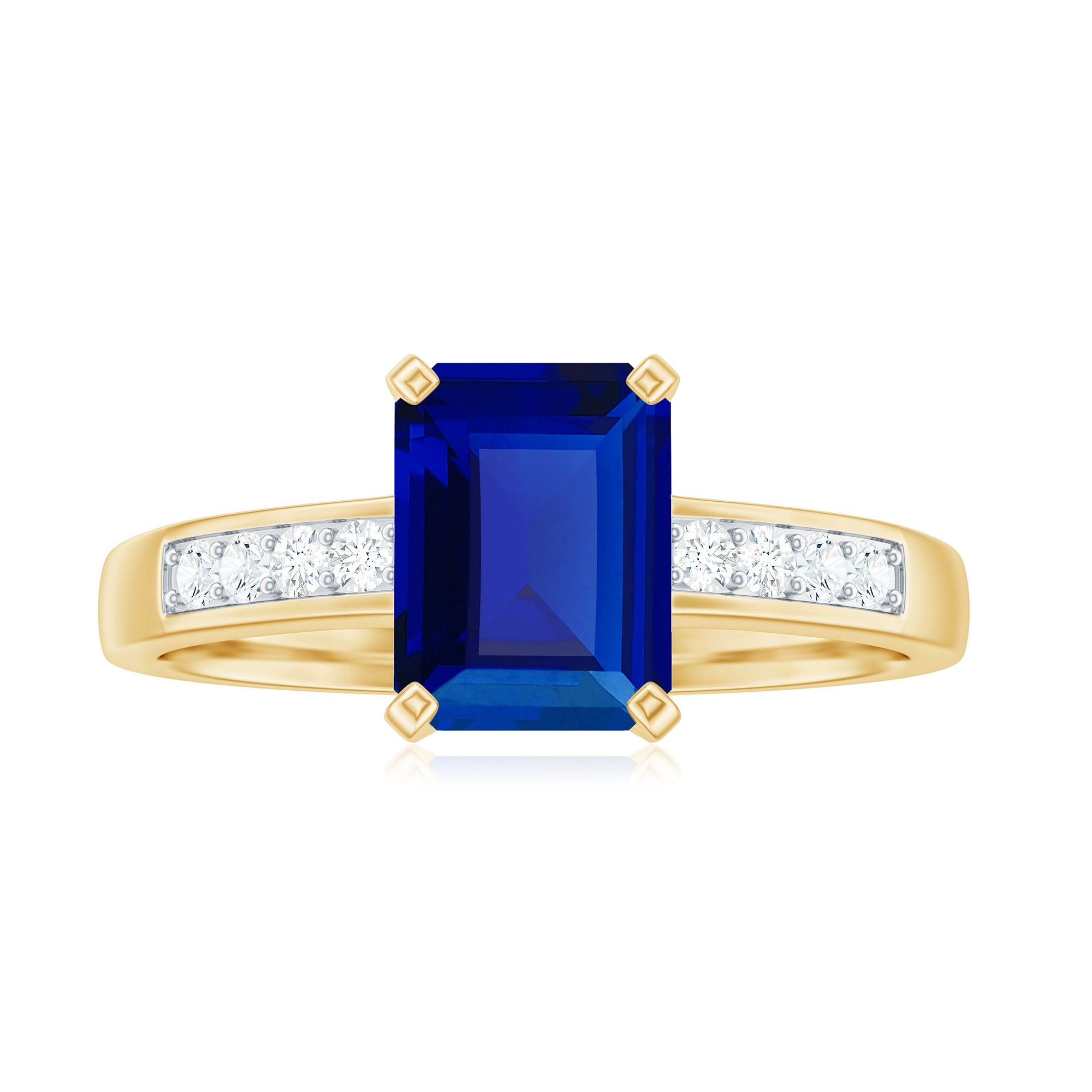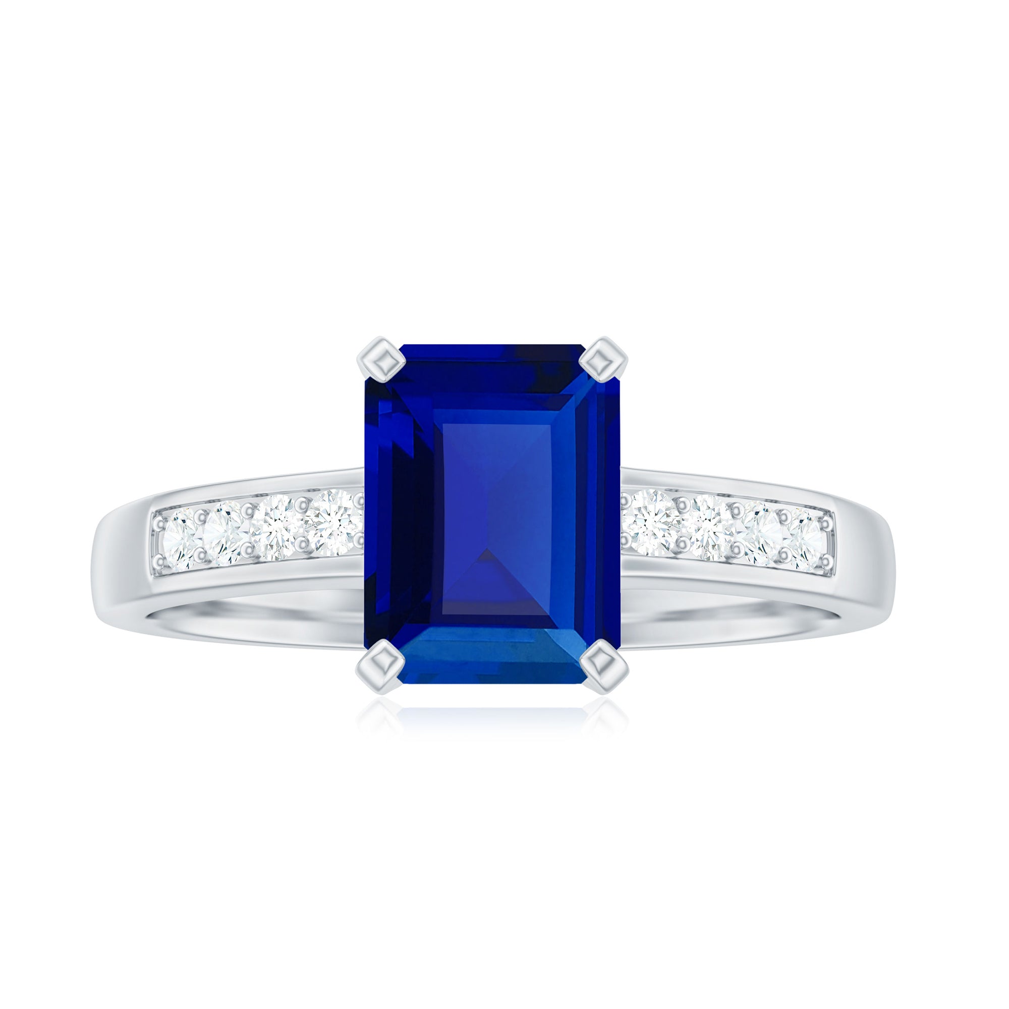 Make a statement with this stunning Created Blue Sapphire Ring! Featuring a 6X8 MM Octagon Cut Created Blue Sapphire in Prong Setting and Diamond Side Stones on a Solitaire Ring, this piece is sure to turn heads. This Ring can also be the perfect Engagement Ring for your loved one. With a total weight of 2 Carats and AAAA Clarity, you can trust that all our certified gemstones undergo rigorous quality checks to ensure their exceptional quality.