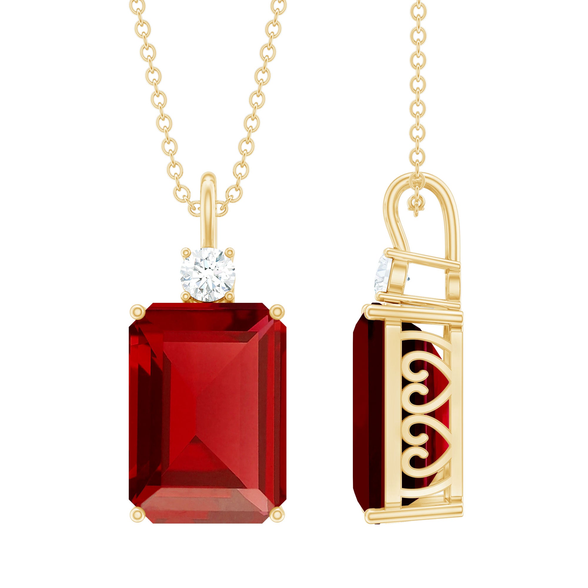 Elevate your style with this Solitaire Pendant Necklace, featuring a striking Octagon Cut Created Ruby Gemstone in a Prong Setting. Adorned with small Brilliant Round Cut Moissanite, the meticulous craftsmanship and captivating color combination exude elegance and sophistication, complementing any ensemble with timeless allure.
