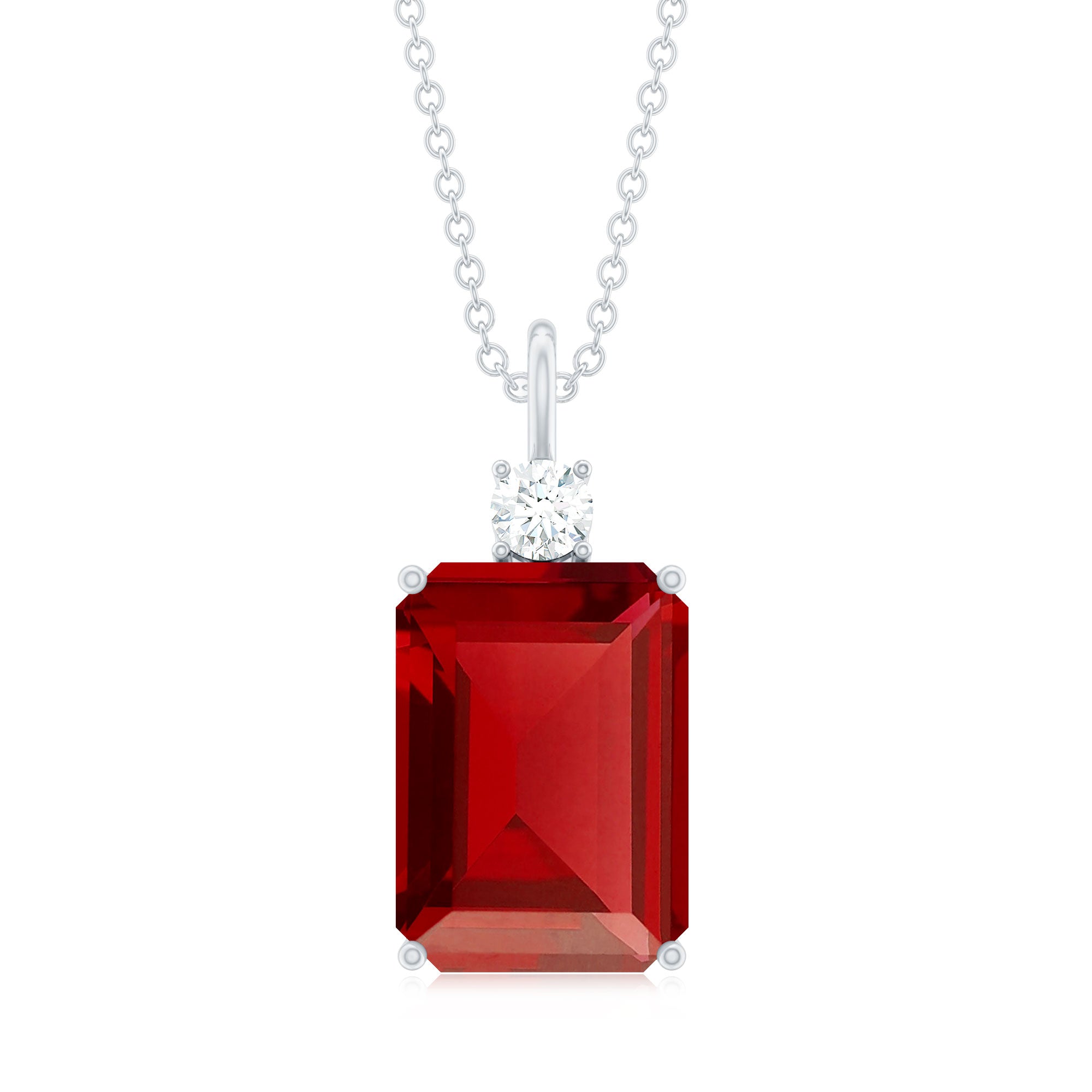 Elevate your style with this Solitaire Pendant Necklace, featuring a striking Octagon Cut Created Ruby Gemstone in a Prong Setting. Adorned with small Brilliant Round Cut Moissanite, the meticulous craftsmanship and captivating color combination exude elegance and sophistication, complementing any ensemble with timeless allure.