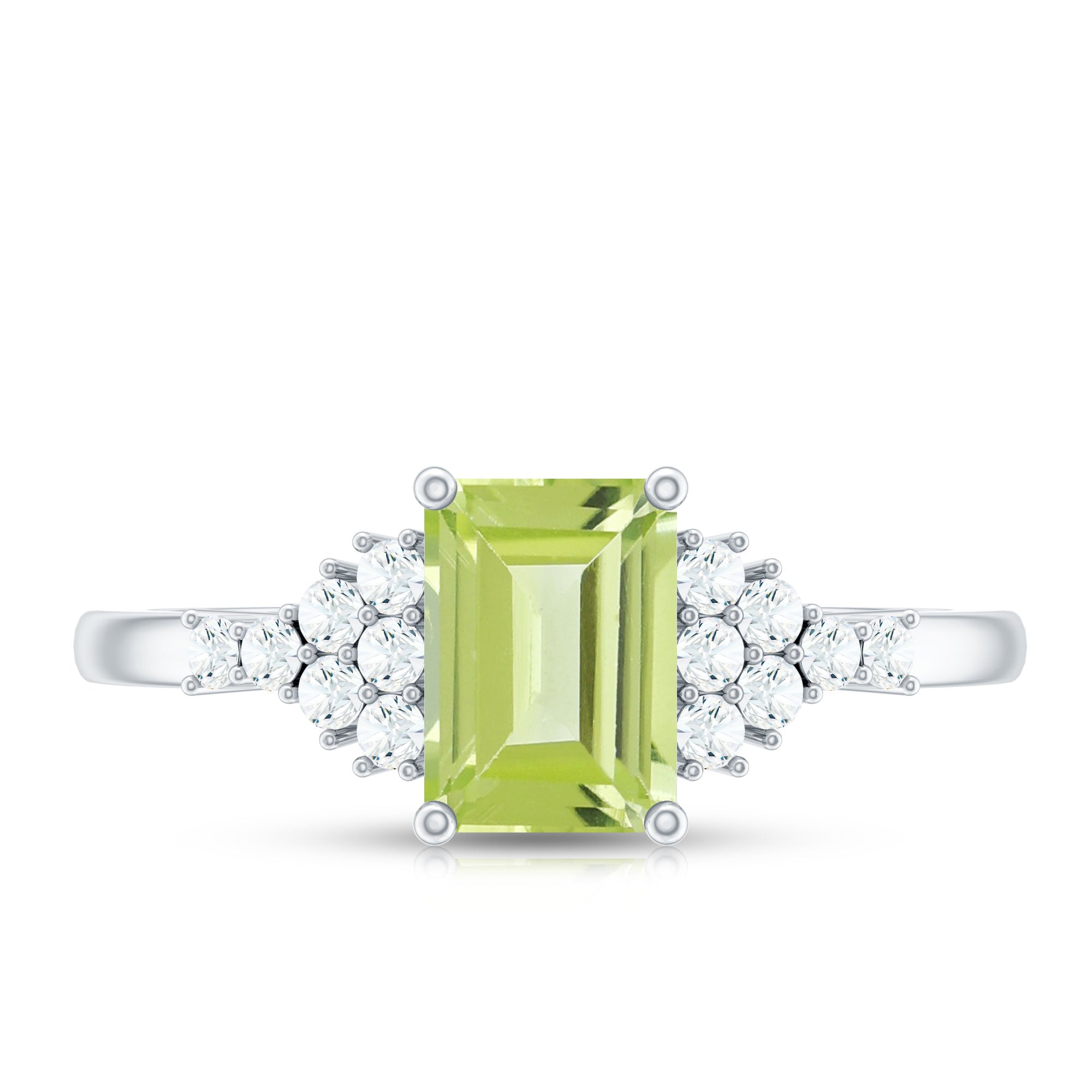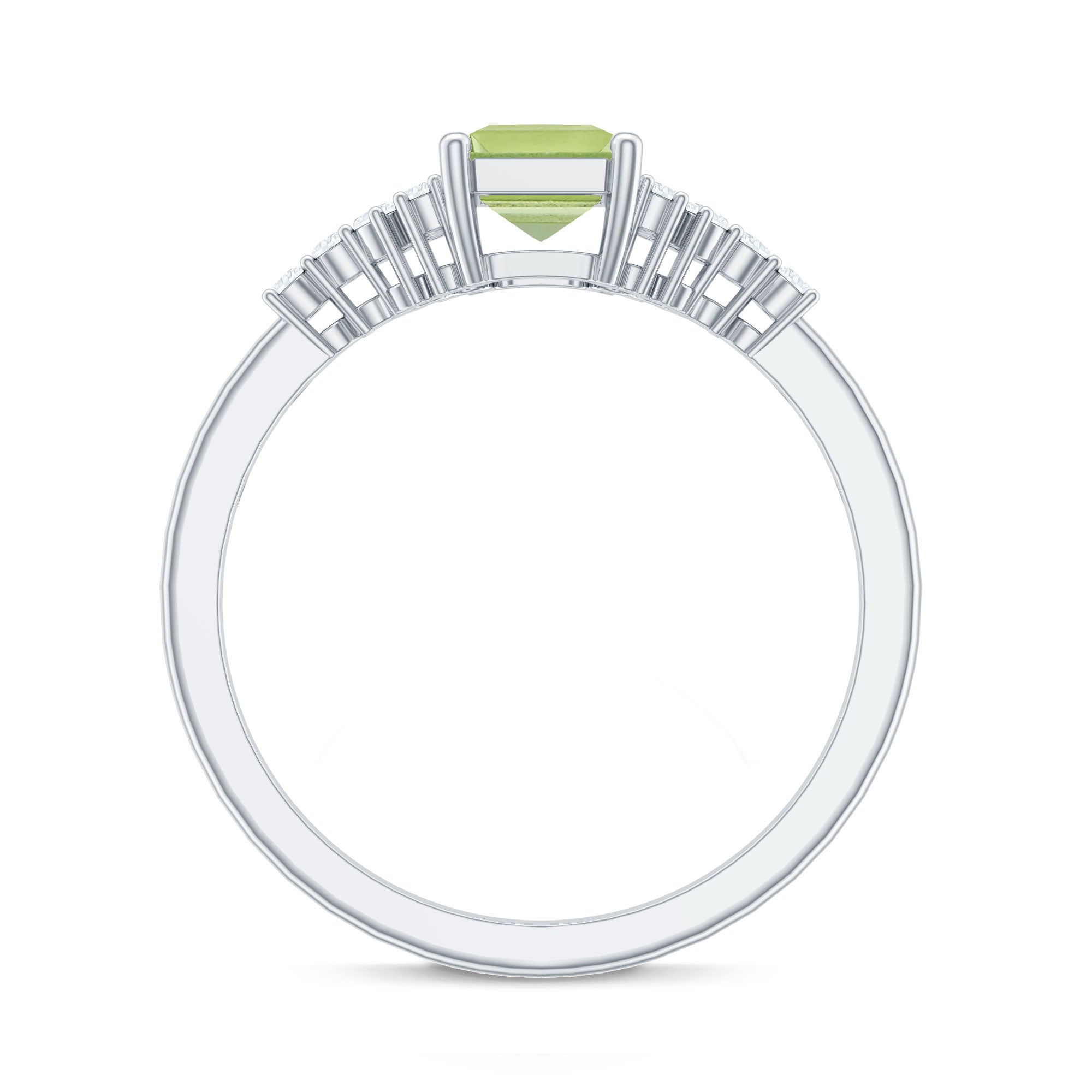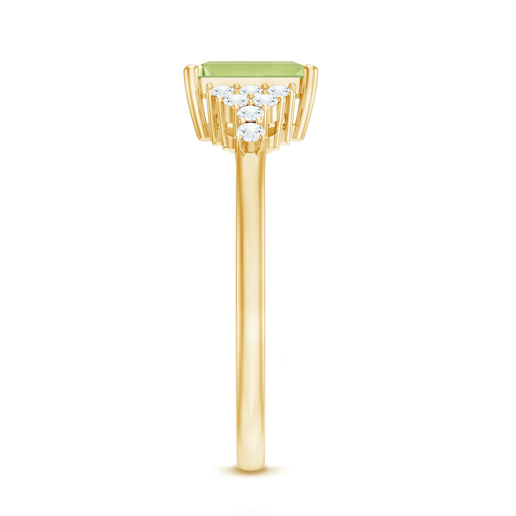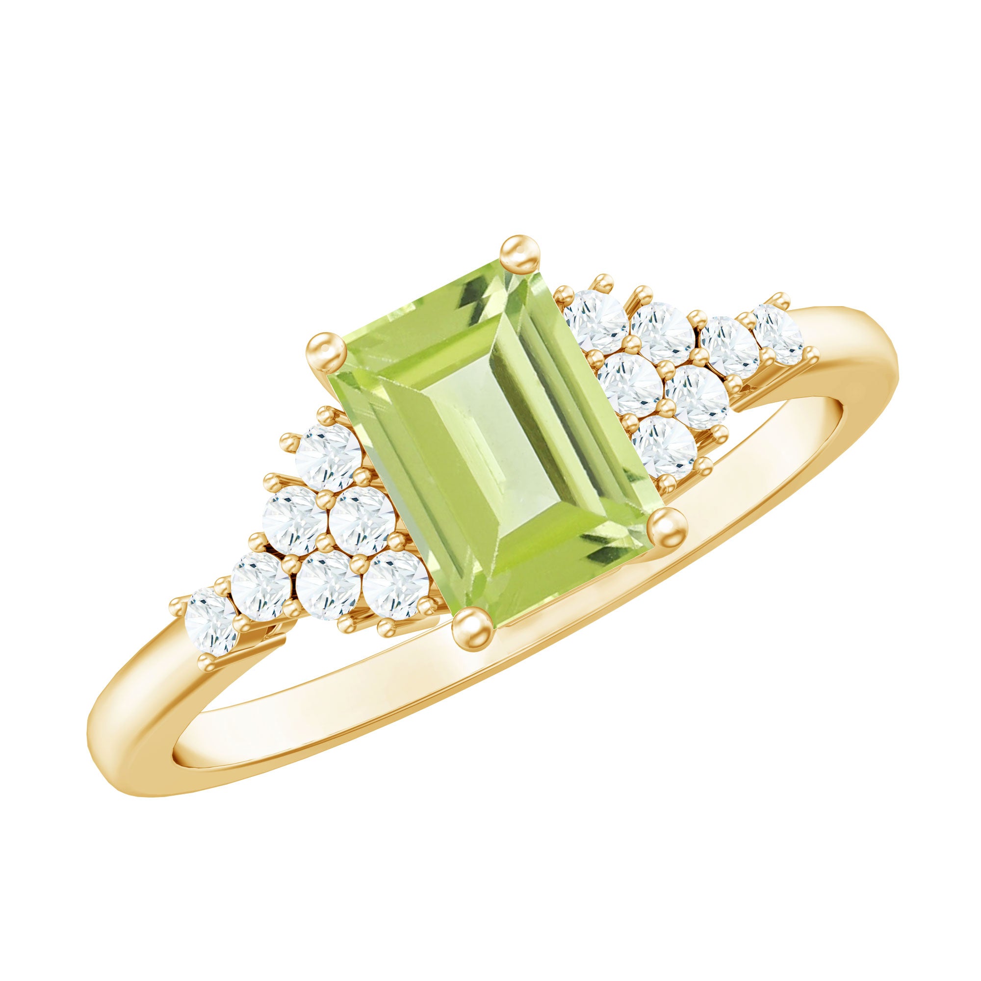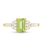 This solitaire engagement ring features an Emerald Cut Peridot center stone, accented by round Diamond cluster on both sides. The simple and elegant design makes this piece a versatile choice that can be worn every day or on special occasions, making it the perfect symbol of your love and commitment. The unique cut of the Peridot adds a touch of individuality to this timeless piece.