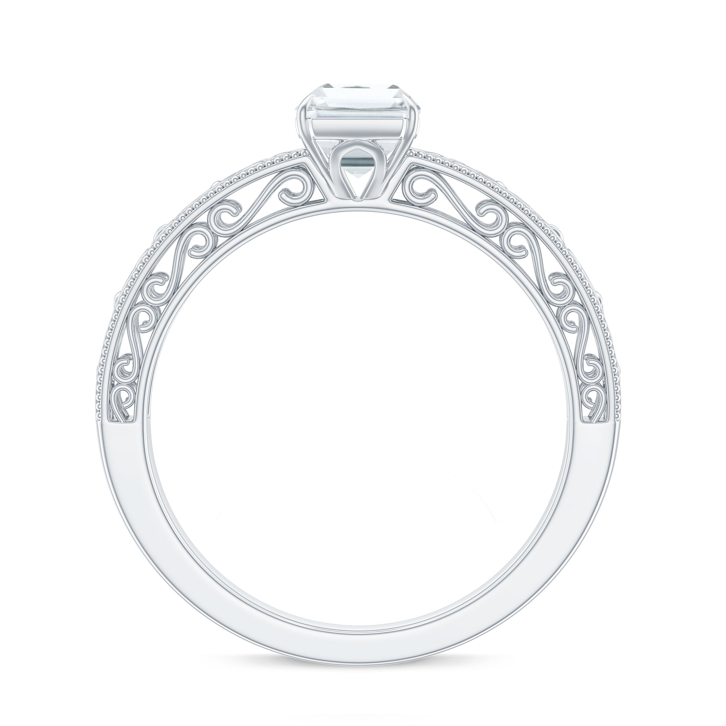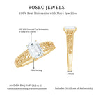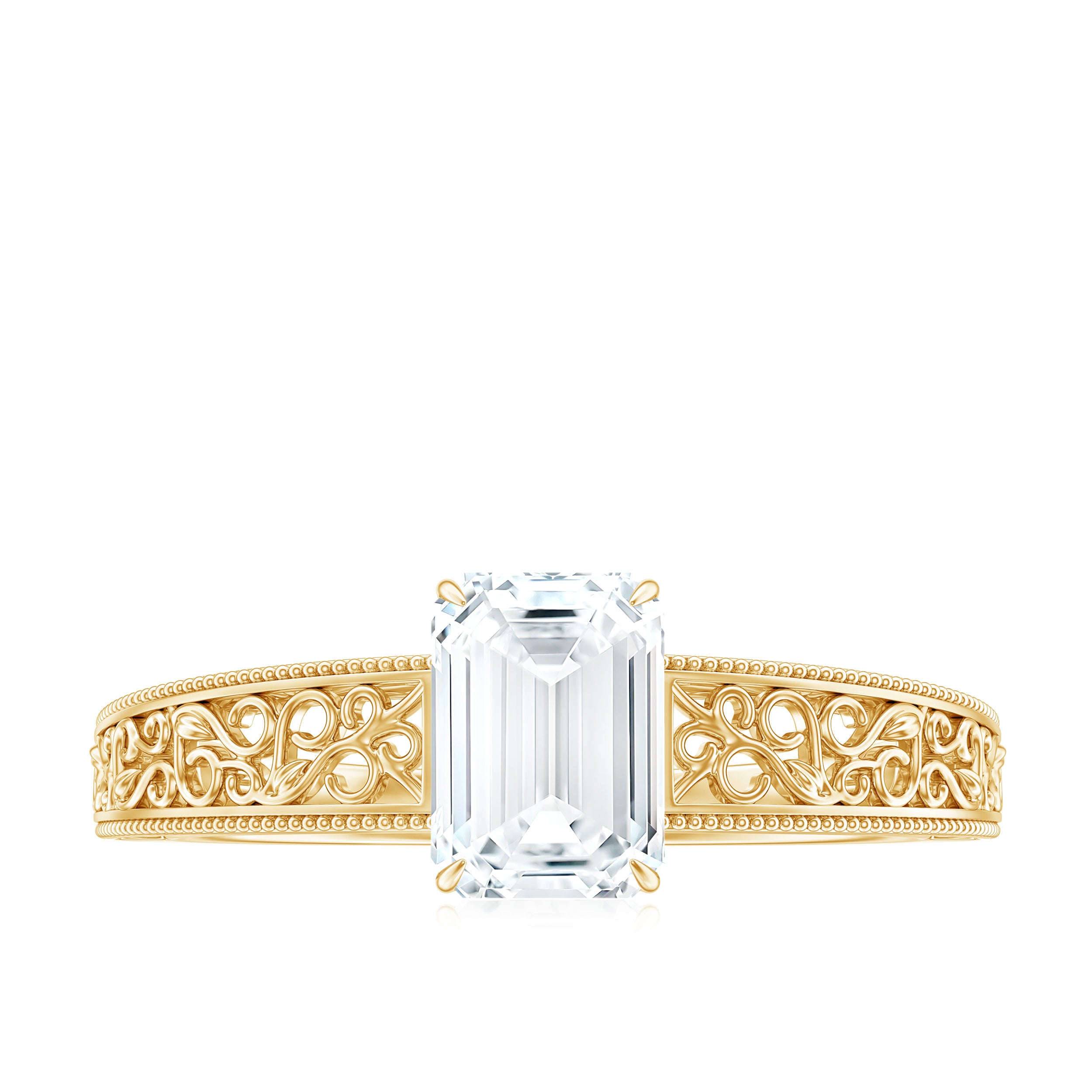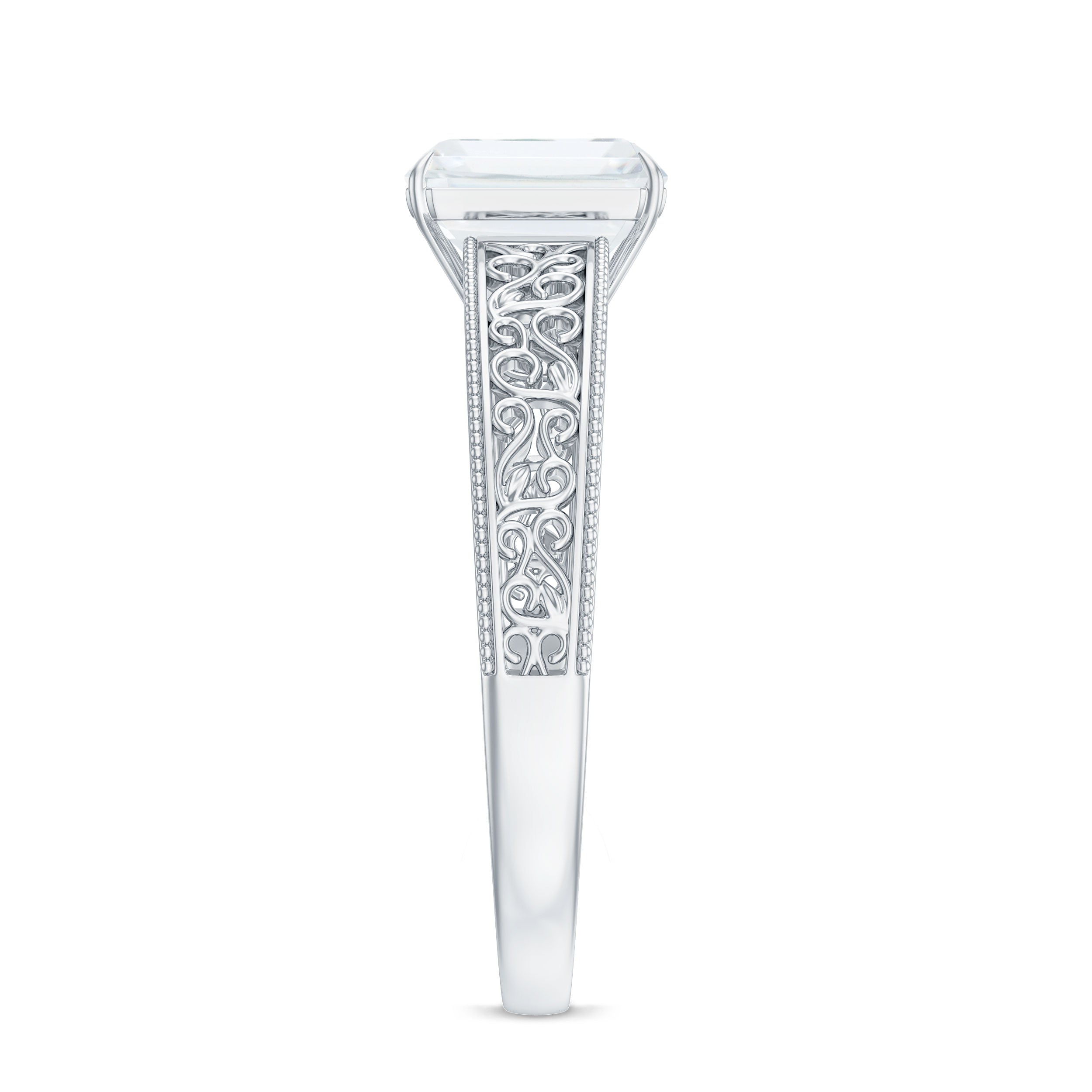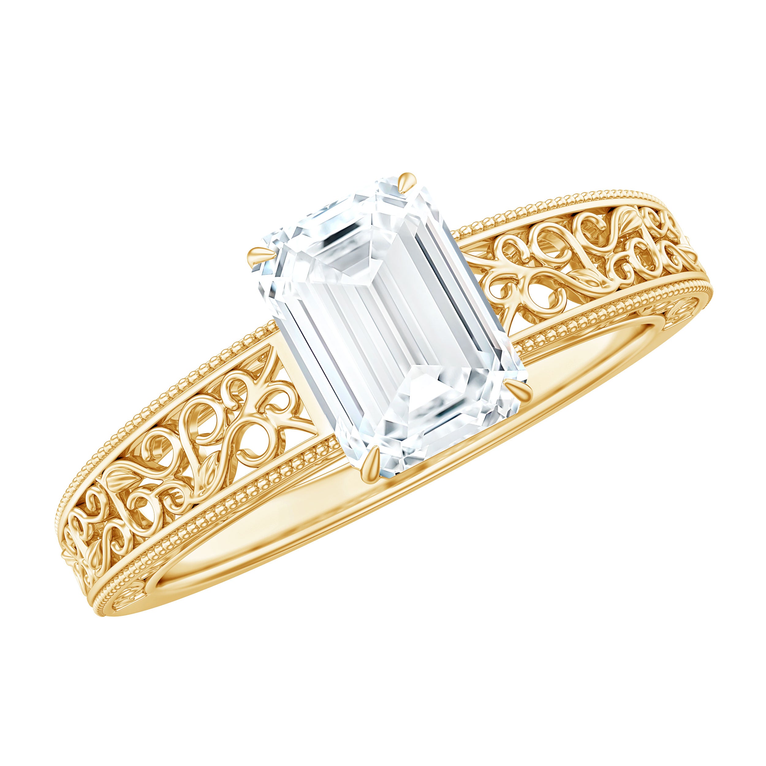 Turn heads with this exquisite Emerald Cut Moissanite Ring – where timeless elegance meets captivating brilliance. Celebrate your forever with this 6X8 MM emerald cut moissanite solitaire engagement ring, showcasing a remarkable 1.87 carat total weight with D color and VS1 clarity quality. Designed for women who appreciate sophisticated detail, this filigree engagement ring is adorned with intricate vintage-style scrollwork and beaded milgrain embellishments that echo the charm of antique jewelry engagement ring. The clarity and sparkle of the certified moissanite ring radiate luxury and finesse, set securely in a classic claw setting for maximum brilliance and security. Whether youre drawn to emerald cut antique engagement ring or looking for a blend of tradition and refinement, this piece is an emblem of lasting love. The polished craftsmanship delivers unmatched quality, making this moissanite engagement ring an ideal symbol of your most meaningful promise. Embracing the allure of vintage inspired engagement ring, this design combines heritage appeal with modern sophistication. Perfectly crafted for engagement proposals, this emerald cut solitaire ring symbolizes a new chapter of everlasting love. A proud addition to any collection of womens moissanite rings, it stands out among moissanite diamond ring as a true testament to enduring beauty and personal style. Rosec Jewels assures you to get peoples heads turned with our sparkling jewelry pieces which are authentically certified just for your peace of mind.