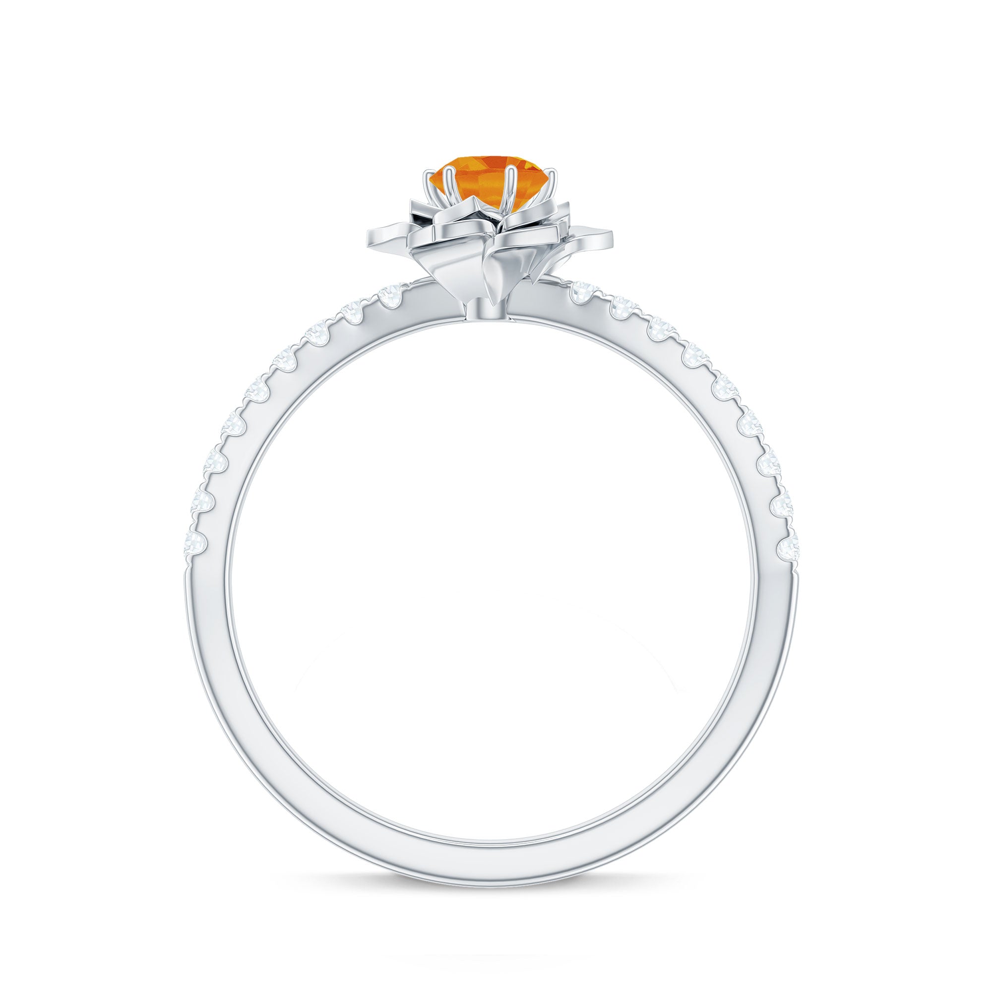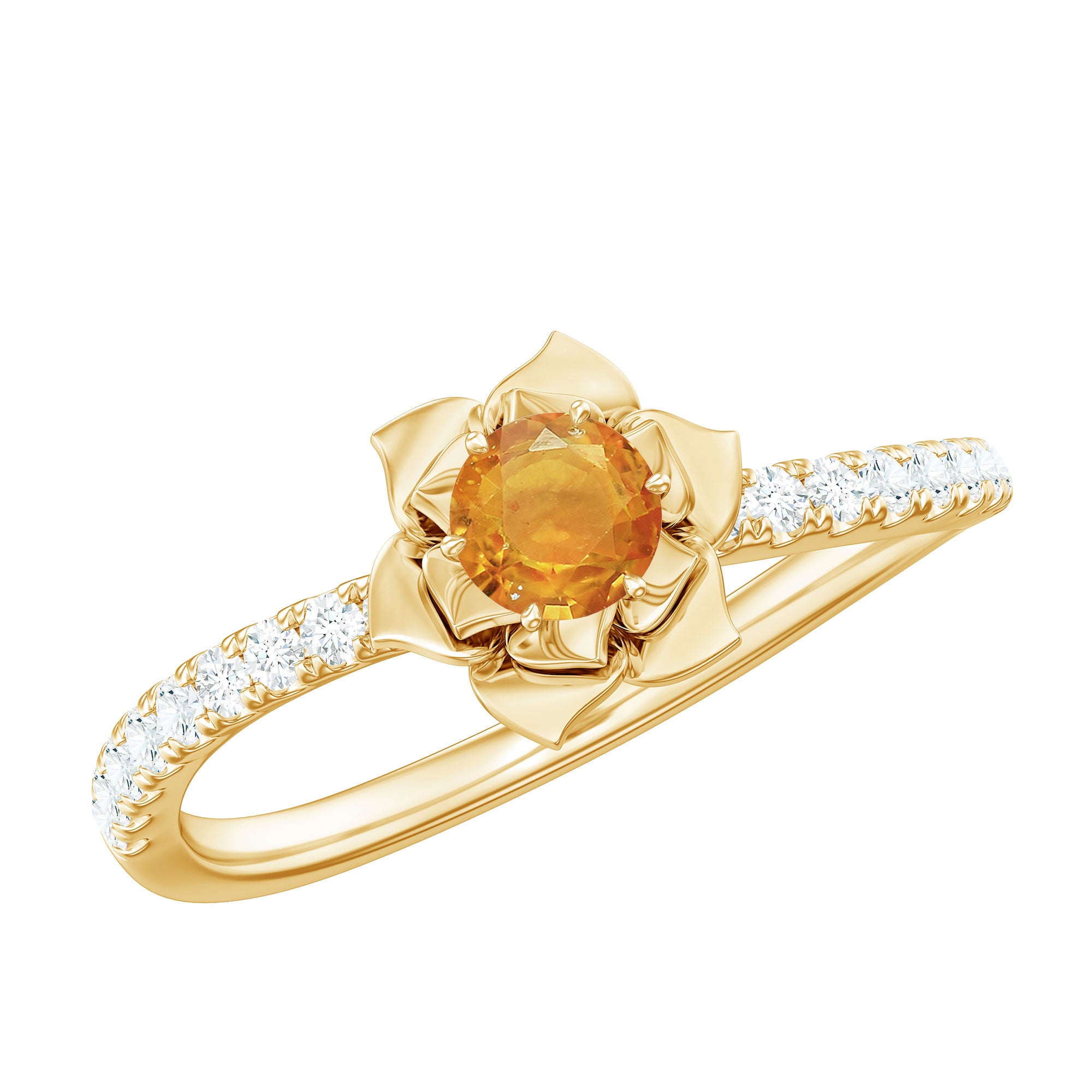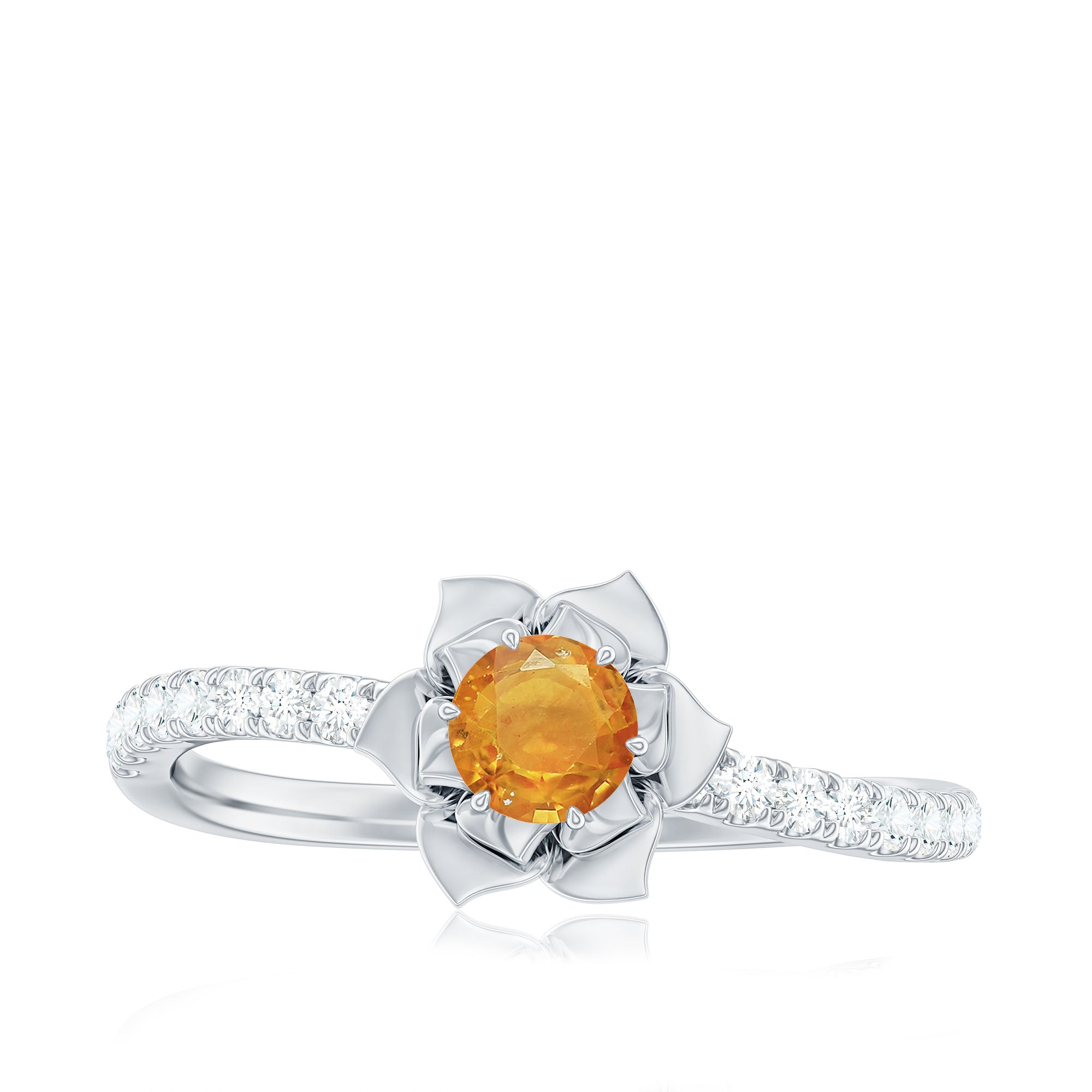 Be mesmerized by this floral engagement ring featuring a 4mm round-cut orange sapphire solitaire and sparkling Diamond side stones. This ring is sure to make you fall in love with our collection all over again.