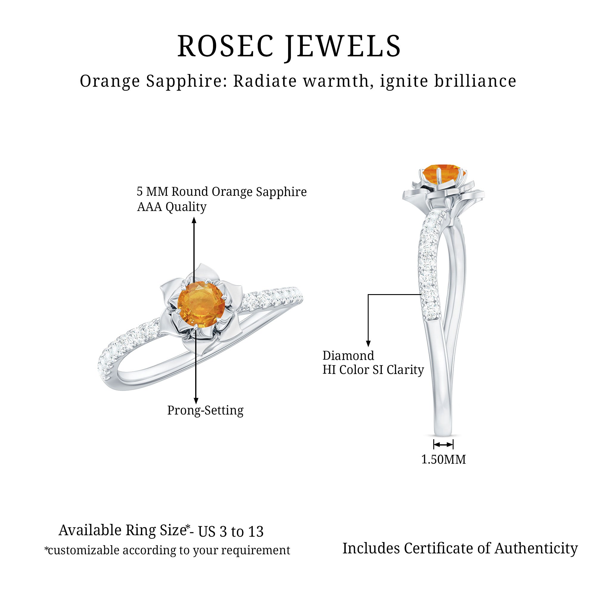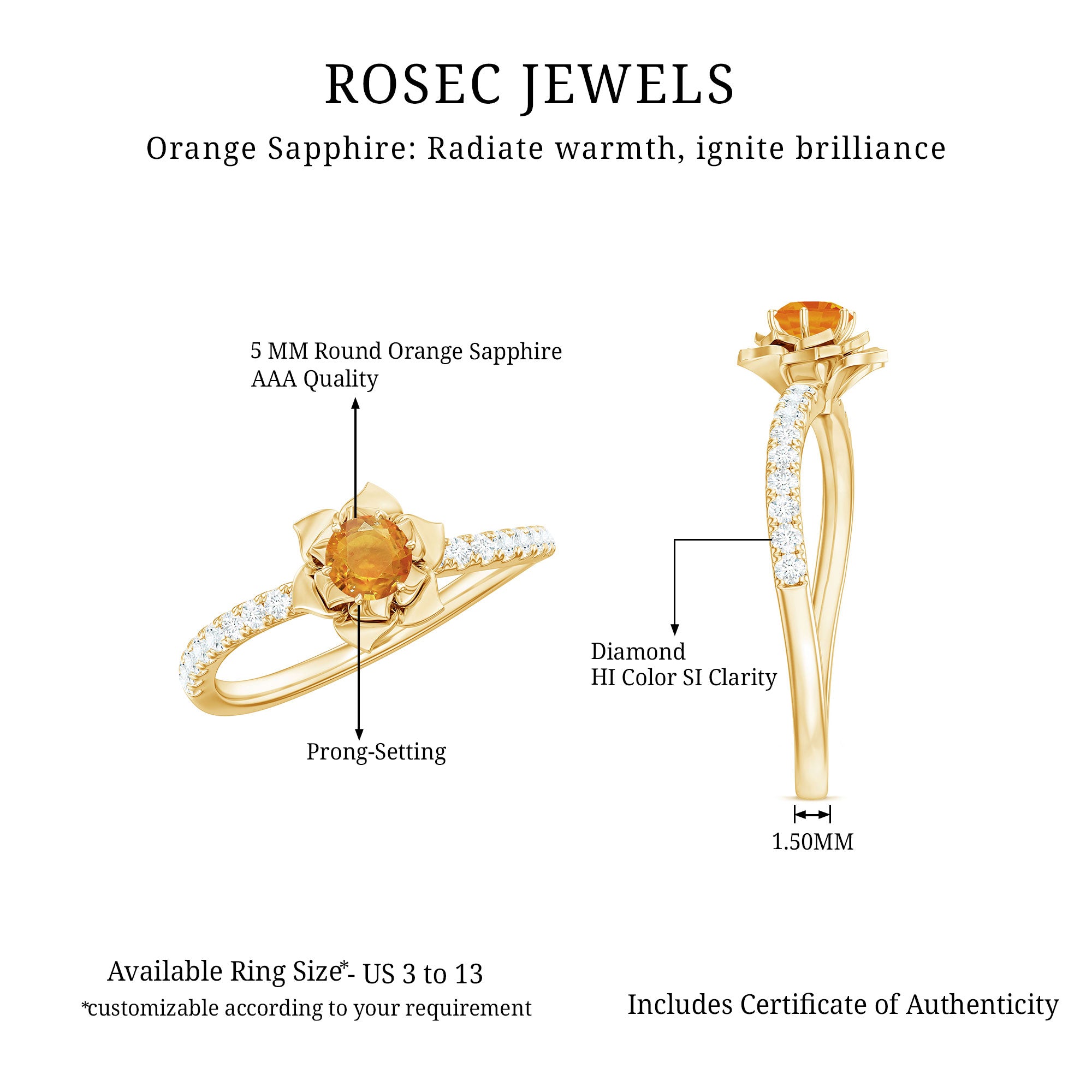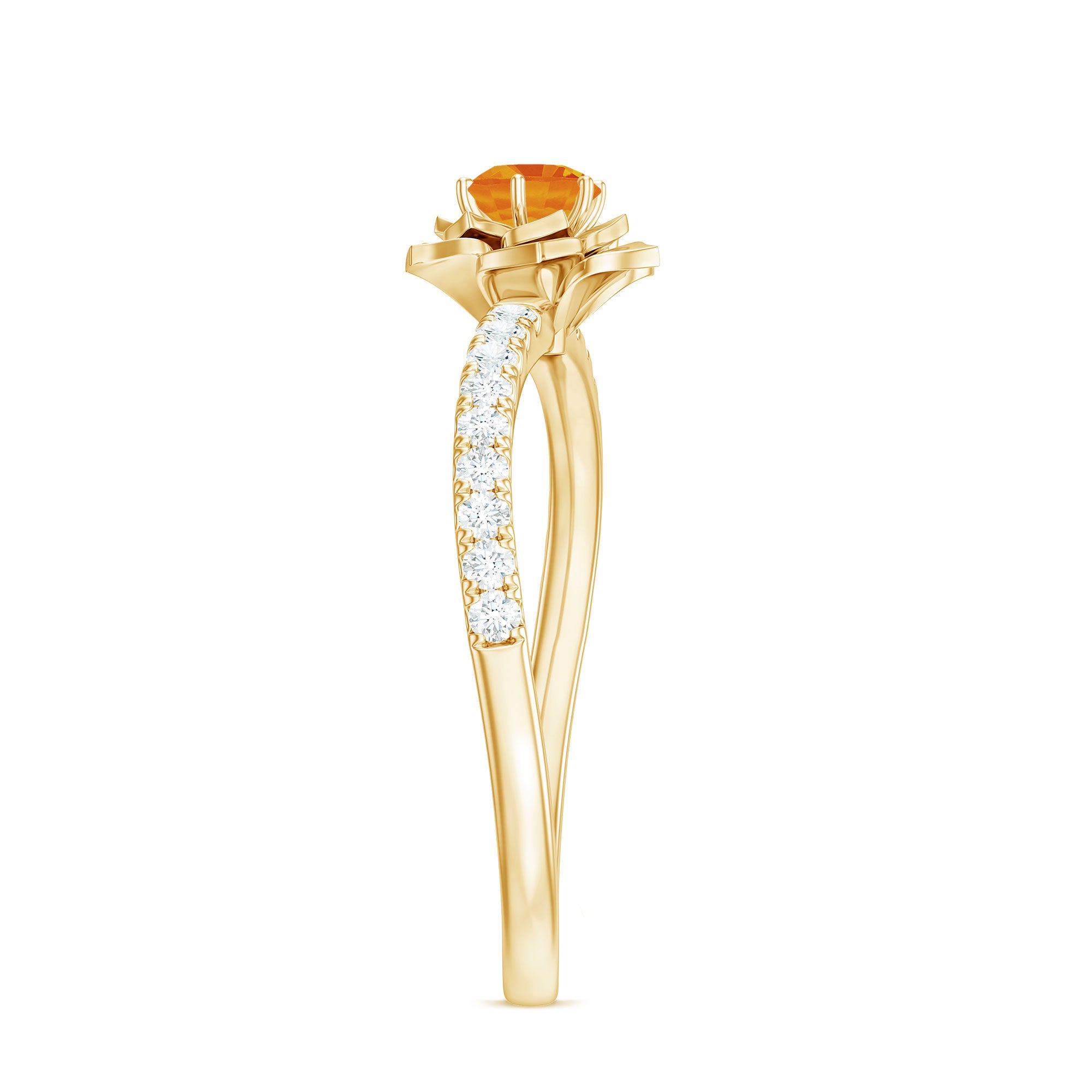 Be mesmerized by this floral engagement ring featuring a 4mm round-cut orange sapphire solitaire and sparkling Diamond side stones. This ring is sure to make you fall in love with our collection all over again.