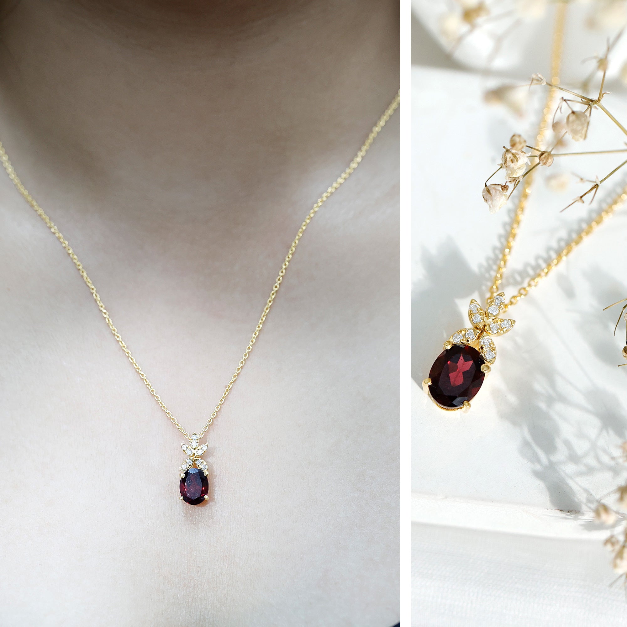 Add a romantic touch of color and elegance to your bridal look with this beautifully handcrafted Rhodolite Garnet Necklace. Thoughtfully designed in 14K yellow gold plated silver, this Oval Locket Necklace exudes warmth, charm, and grace, perfect for the bride who wants her jewelry to reflect both style and statement. At the heart of the piece lies a rich 7X9 MM oval cut Rhodolite, set securely in prongs. Above the vibrant center stone sits a delicate floral motif adorned with round cut lab grown diamonds, adding a soft, nature-inspired sparkle. Each diamond-encrusted petal is finely crafted to create a beautiful floral shape that complements the vivid rhodolite below. The design blends vintage inspiration with a fresh, modern feel, creating a standout piece you will treasure forever. The Rhodolite and Diamond Necklace hangs from a fine, adjustable chain that secures with a lobster clasp, allowing you to wear it at your preferred length. Lightweight and comfortable, it is ideal for all-day wear, from your walk down the aisle to your dinner date. Whether you are a bride, gifting your bridesmaids, or simply looking for a keepsake with deep value, this Flower Necklace is a piece that tells a story of romance, strength, and timeless beauty. Complete with a signature jewelry box, it is ready to be gifted or cherished for years to come.