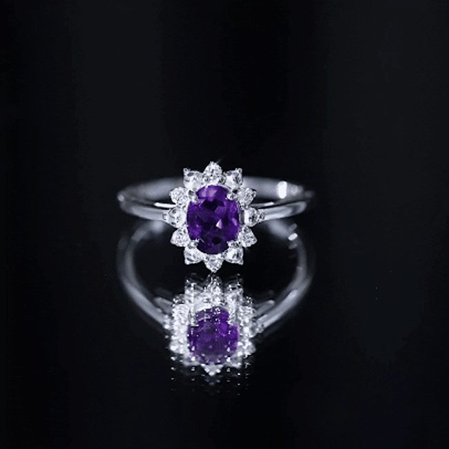 Diamond accents add brightness to the design and provide contrast against the deep tone of the amethyst. Their reflective sparkle enhances the floral halo while maintaining the focus on the central gemstone.
