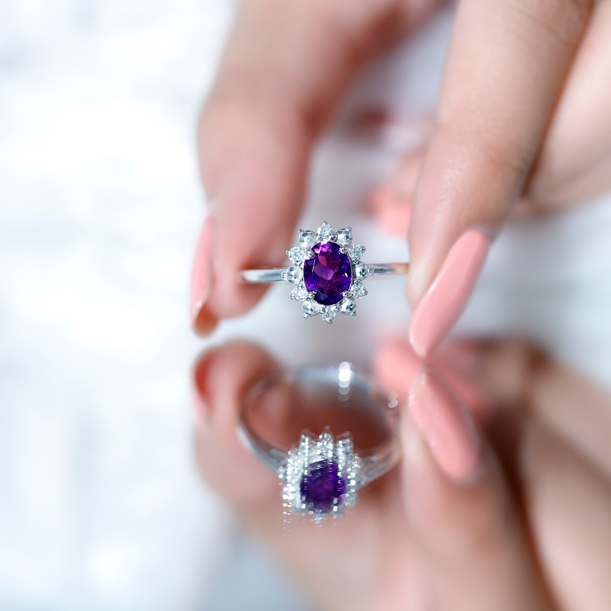 This engagement ring features an oval amethyst center stone framed by a floral-inspired halo accented with diamonds. The rich purple hue of the amethyst creates a vibrant focal point, while the surrounding halo adds delicate brilliance to the design.