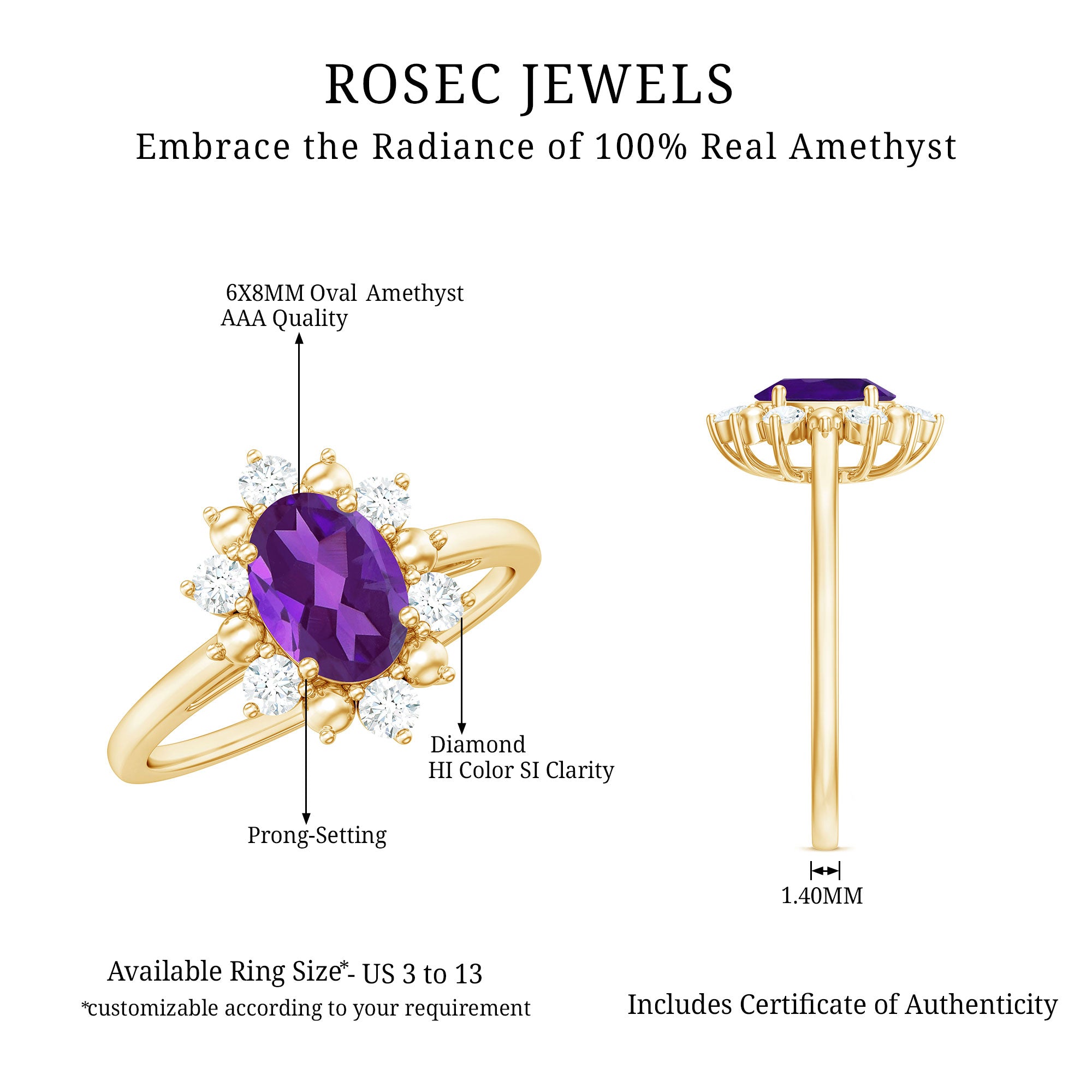 Together, the amethyst center stone and diamond accents create a balanced engagement ring that blends vibrant color with refined brilliance.