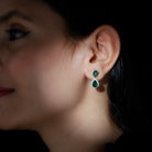 Adorn your ears with these Lab Grown Emerald Drop Earrings, crafted with 14K White Gold Plated Silver. It features a 6X8 MM Pear Shape Synthetic Emerald encircled by petite round shape Moissanite and topped with an Oval Shape Cultured Emerald. These Teardrop Earrings dazzle with the classic shine of AAAA Quality Lab Created Emerald. These earrings invoke fidelity, which can be a perfect choice for her to present on a special occasion. These Cocktail Earrings will be delivered to you in a premium quality velvet pouch.