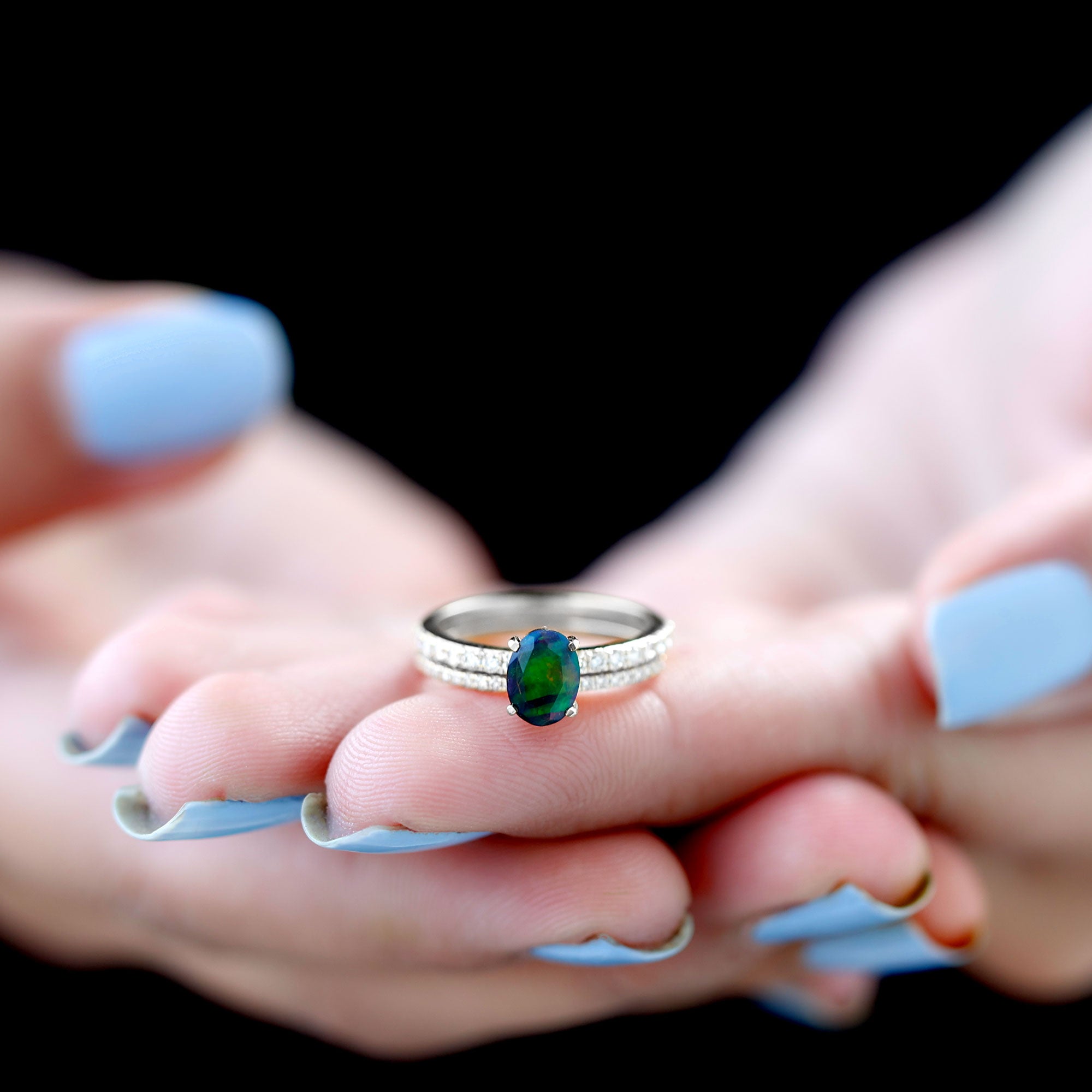 Elevate her style with the dazzling allure of this Wedding Ring Set, featuring an oval-shaped black opal gracefully set in peg head setting while the shank shimmers with the captivating hue of diamond. With the matching diamond band, this bridal ring set will capture attention. Impress her with the dazzling array of these gemstones and exquisite settings, making them a perfect piece of jewelry for your beloved.