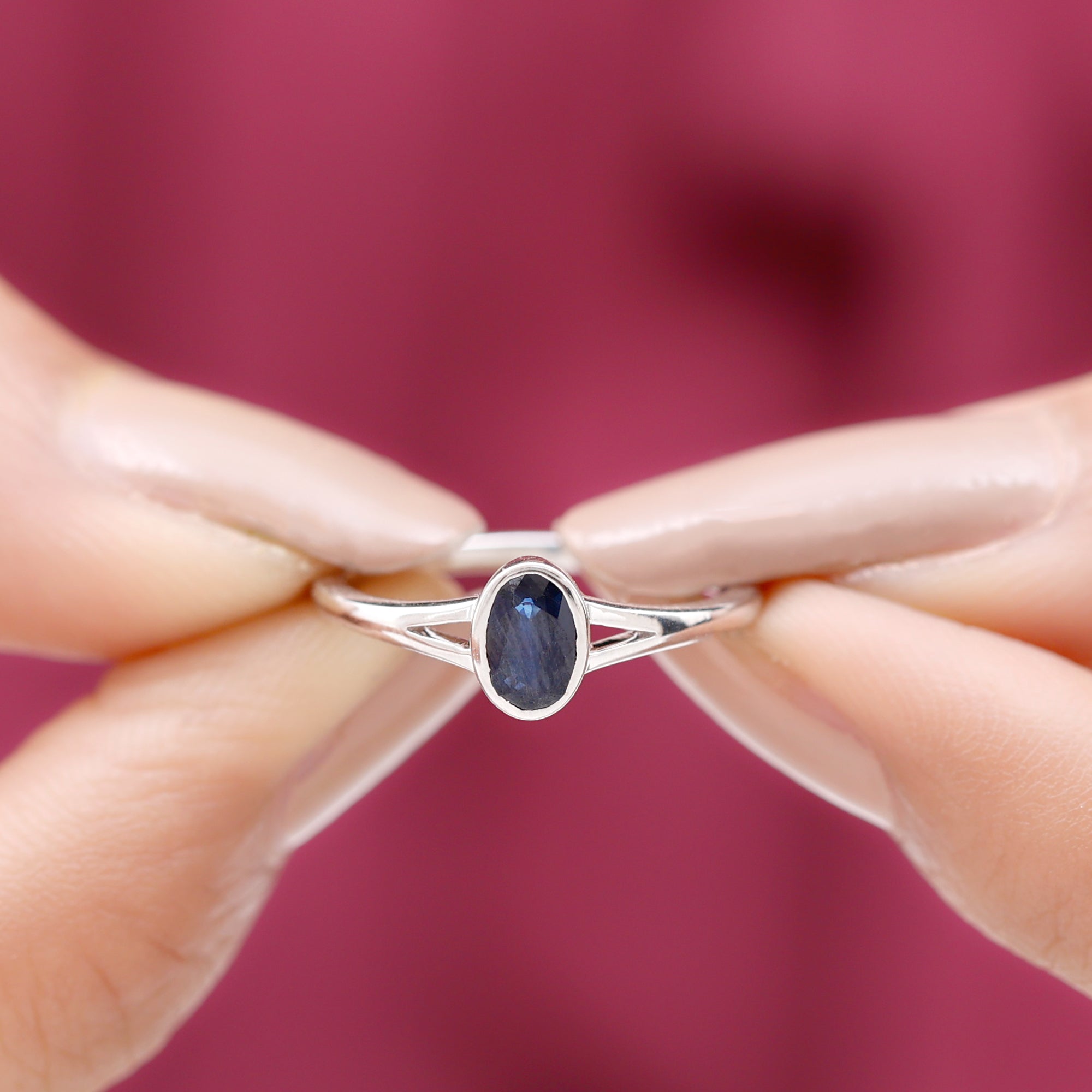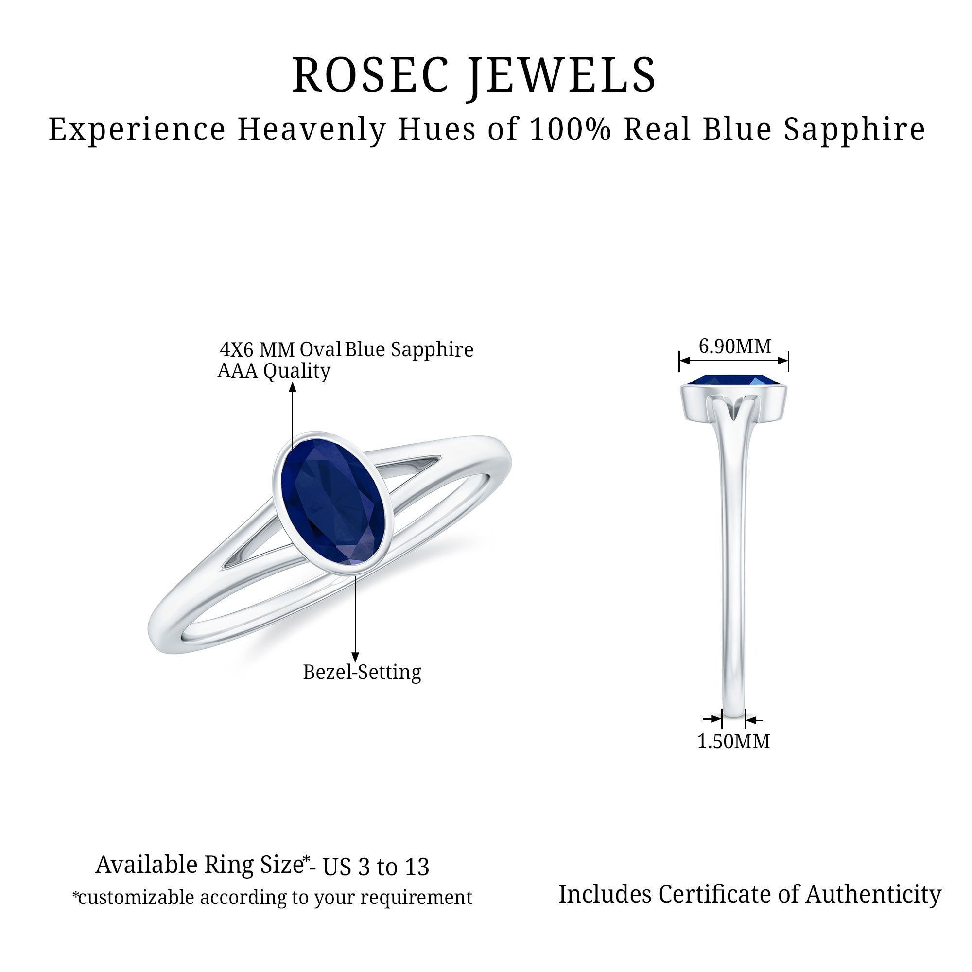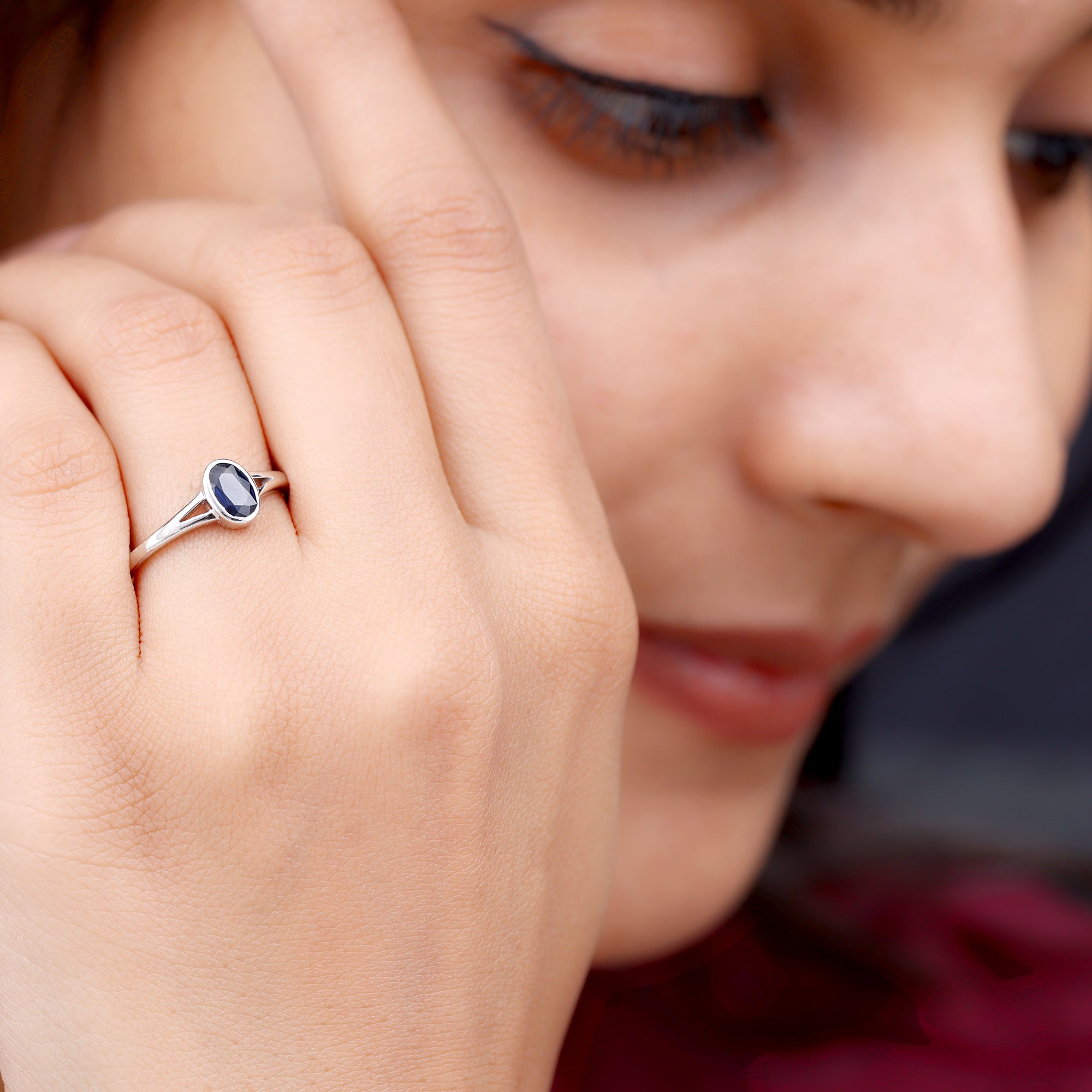 Grace your finger with the understated elegance of this Classic Blue Sapphire Ring. Adorned with an Oval Shape Blue Sapphire gemstone set delicately in a Bezel Setting in Split Shank, this Solitaire Engagement Ring is meticulously crafted in various metal options.