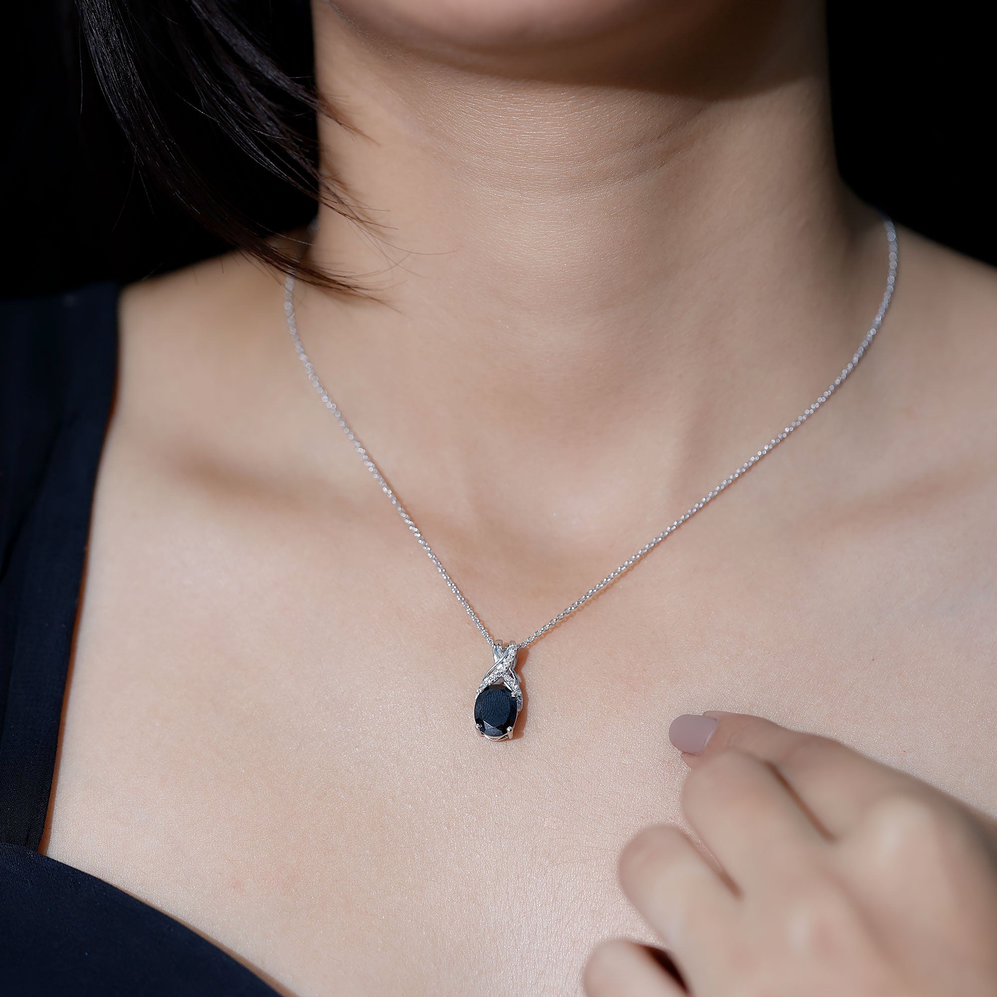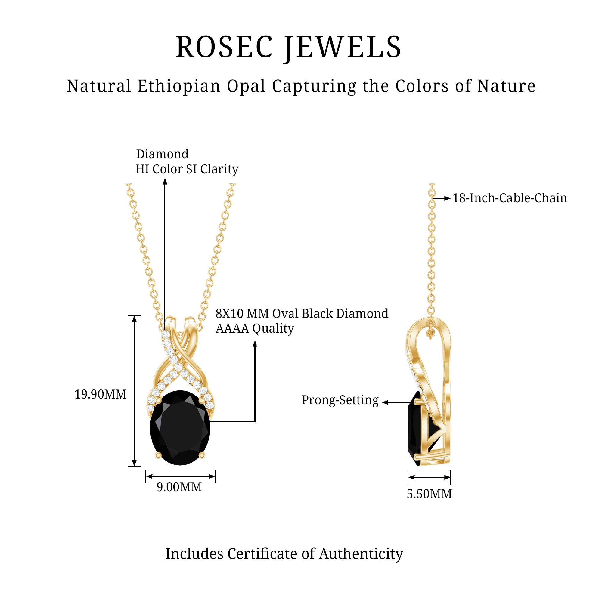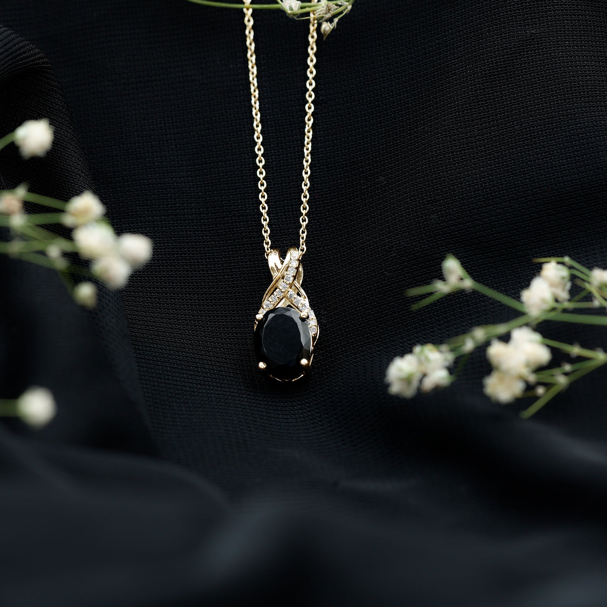 Introducing a one-of-a-kind Created Black Diamond Pendant Necklace that is both delicate and charming. The 8X10 MM Oval-Cut Created Black Diamond takes center stage in a 4 Prong Setting, with a Twisted Bail adorned with Diamond on a Solitaire Pendant. This Designer Pendant is so beautiful that its likely to become a staple in your collection, one youll never want to take off.