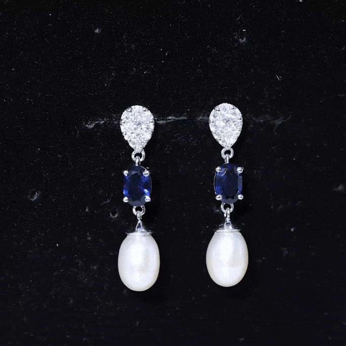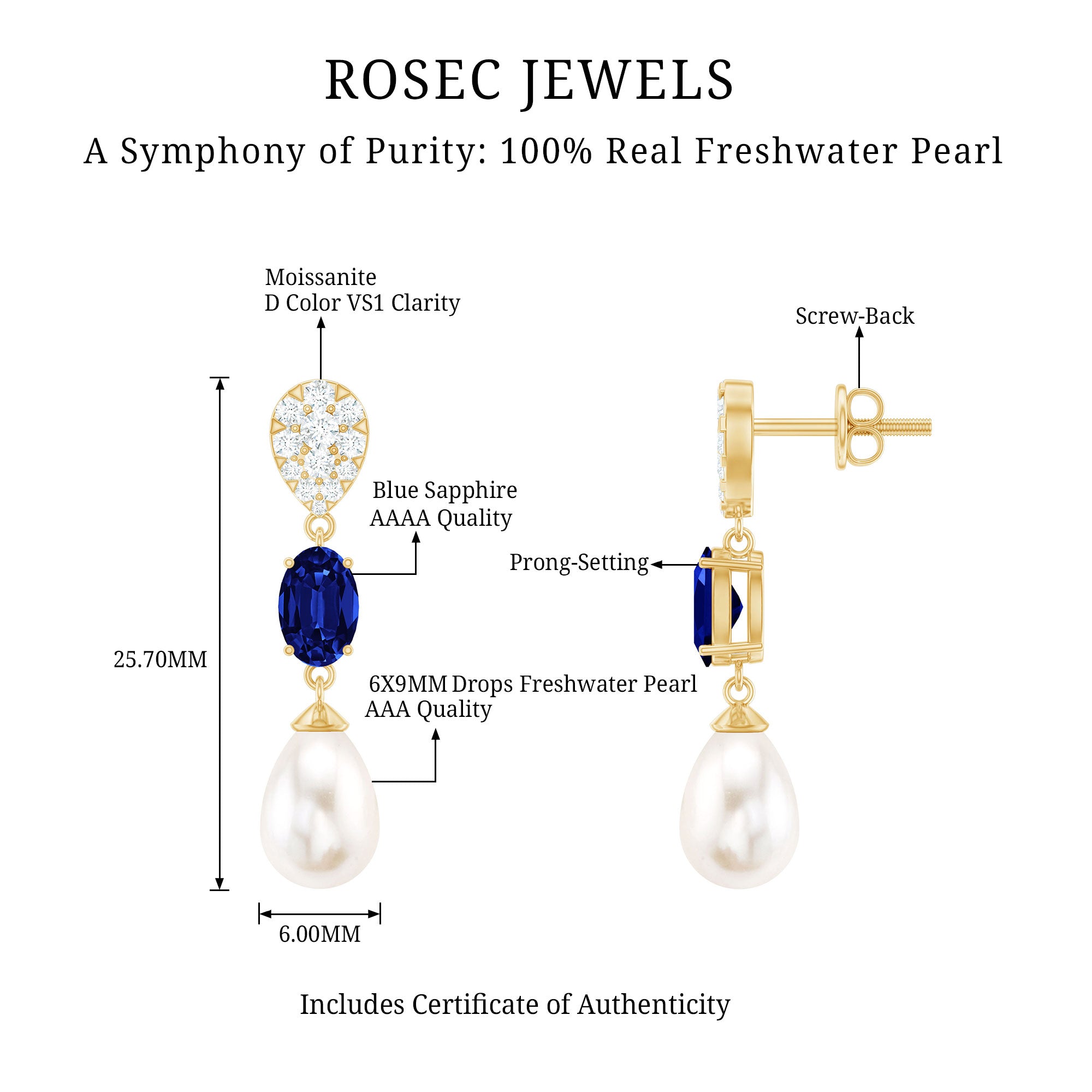 These elegant earrings feature a stunning oval-cut created blue sapphire suspended from a freshwater pearl. Sparkling Moissanite accents the pearl, adding an extra touch of brilliance to these timeless earrings. Perfect for a special occasion or everyday wear, these earrings are sure to become a cherished part of your jewelry collection. The lab-created blue sapphire is known for its deep, rich color and is considered a symbol of wisdom and truth, making it a meaningful and beautiful choice for jewelry. The freshwater pearl is a unique and versatile gem that adds a touch of natural elegance to any design.