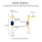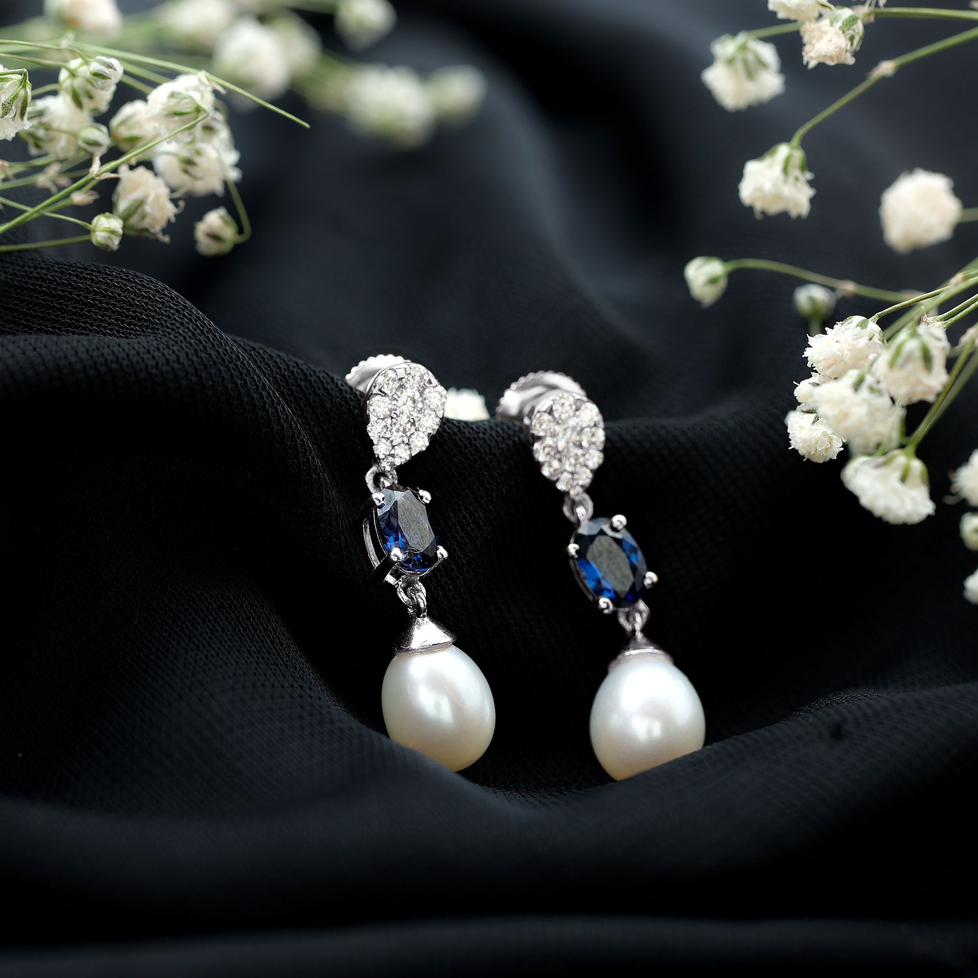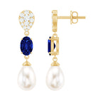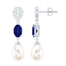 Oval Created Blue Sapphire and Freshwater Pearl Dangle Earrings with Moissanite