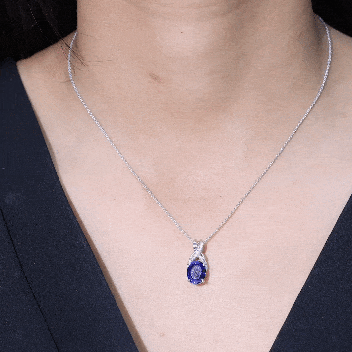 Introducing a one-of-a-kind Created Blue Sapphire Pendant Necklace that is both delicate and charming. The 8X10 MM Oval-Cut Created Blue Sapphire takes center stage in a 4 Prong Setting, with a Twisted Bail adorned with Diamond on a Solitaire Pendant. This Designer Pendant is so beautiful that its likely to become a staple in your collection, one youll never want to take off.