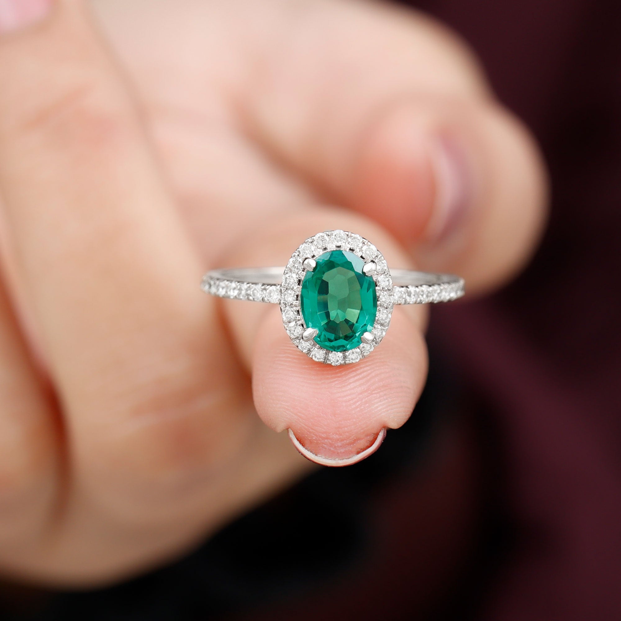 6x8mm Oval Cut Lab Created Emerald Halo Engagement Ring with Diamond