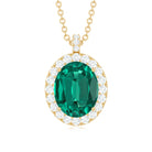 Indulge in the refined sophistication of the Halo Pendant. This pendant showcases a captivating Oval Cut Created Emerald, securely held in place by a prong setting and embellished with dazzling Diamond accents. With its cocktail-inspired design, this pendant effortlessly enhances the beauty of any outfit.