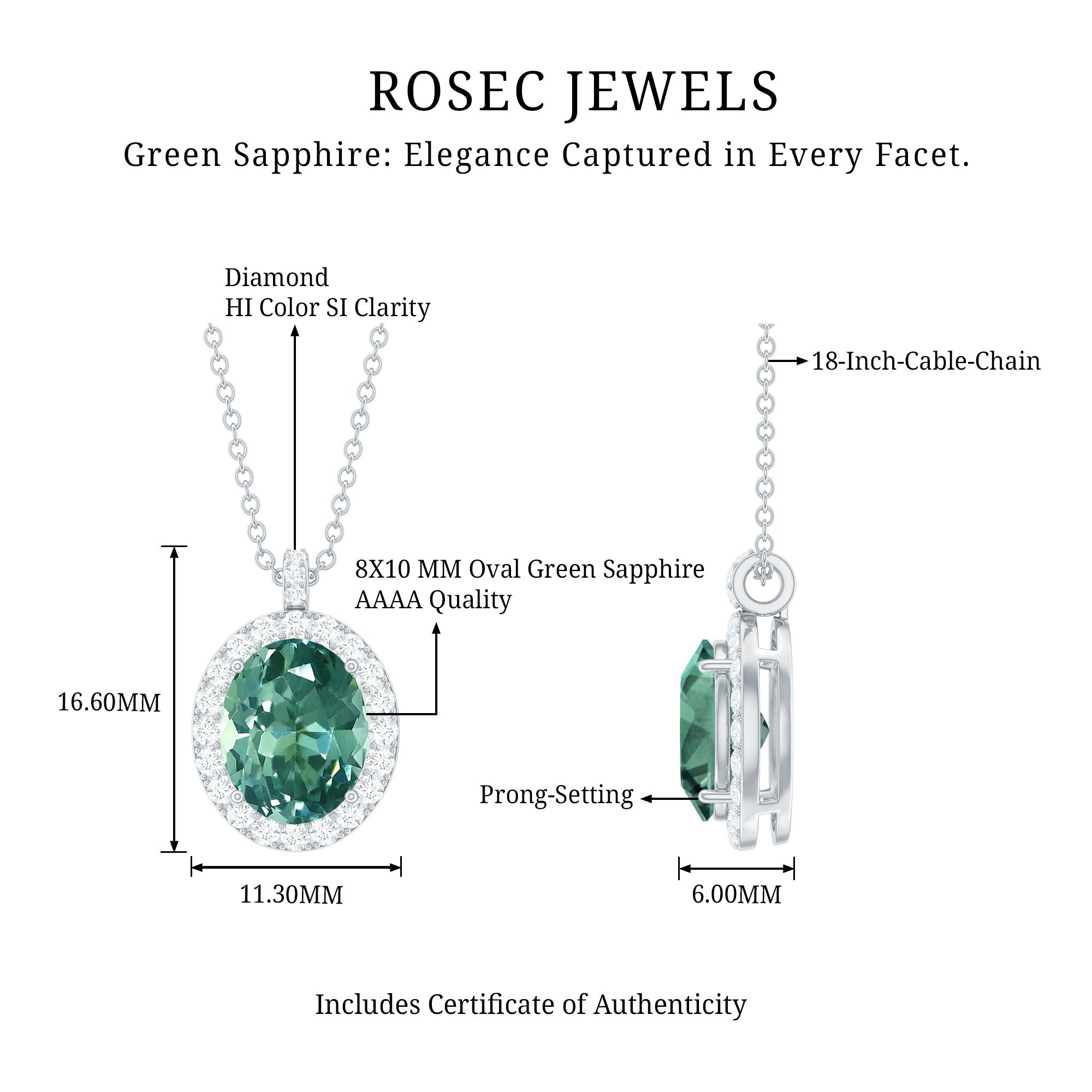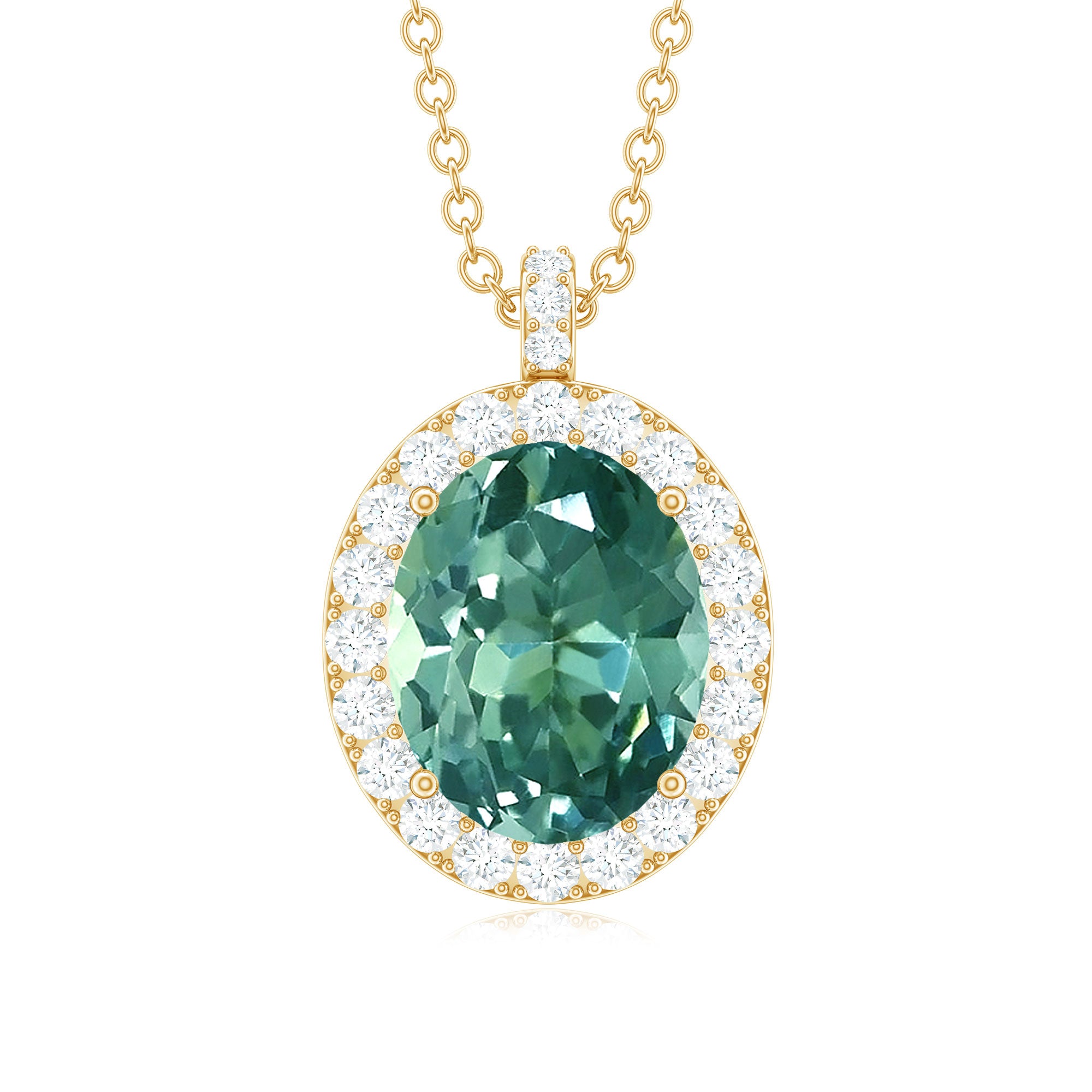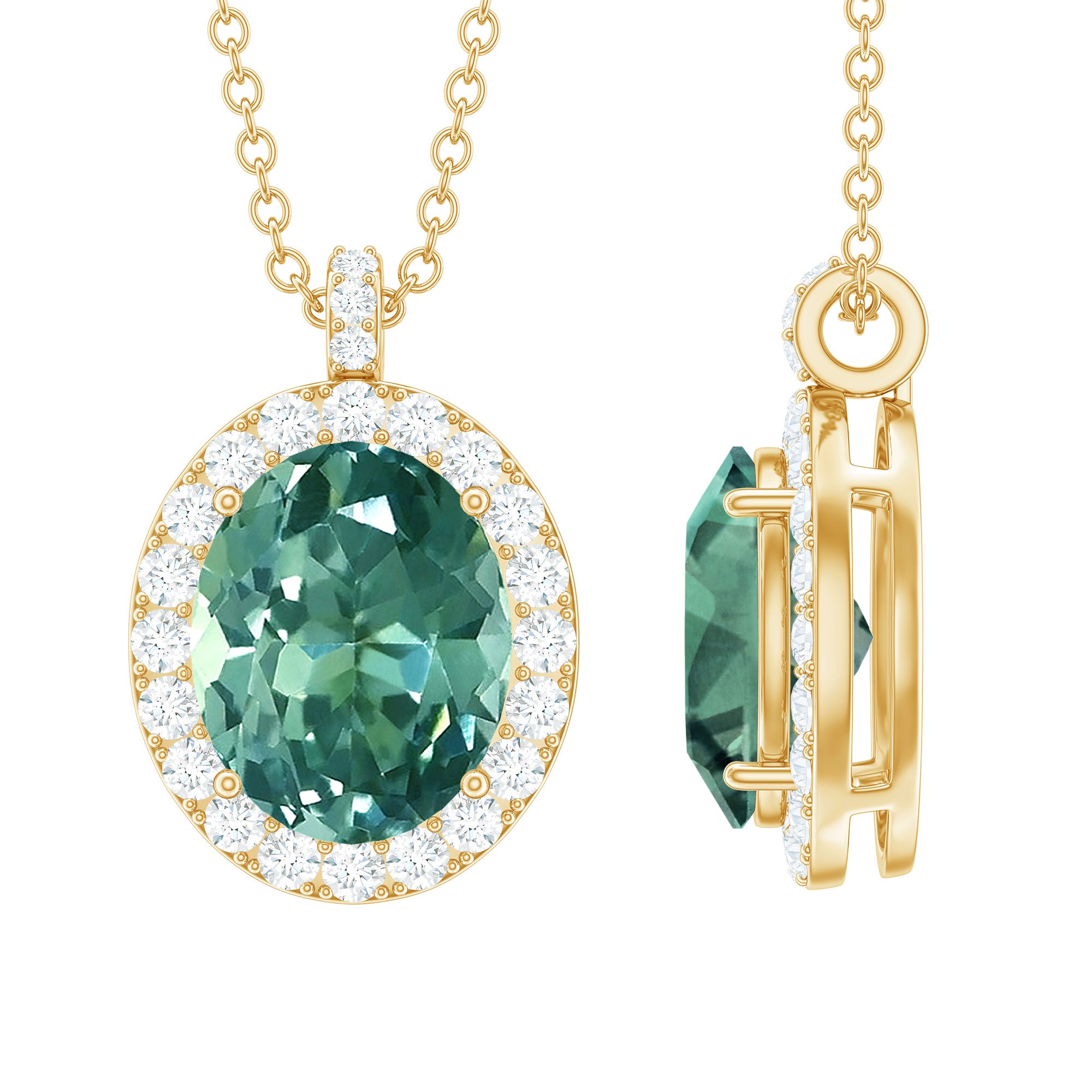Enrich your allure with this mesmerizing Pendant Necklace showcasing a dazzling Oval Shape Lab Created Green Sapphire as the centerpiece, delicately set in a prong setting. The captivating created sapphire is encircled by a radiant halo of Diamond gemstones, exuding brilliance from every angle.