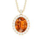 Indulge in the enchantment of this captivating Halo Pendant that showcases a breathtaking Oval Shape Lab Created Orange Sapphire as its focal point, delicately cradled within a prong setting. The mesmerizing created sapphire is embraced by a dazzling halo of Diamond gemstones, exuding a mesmerizing radiance from every angle.