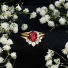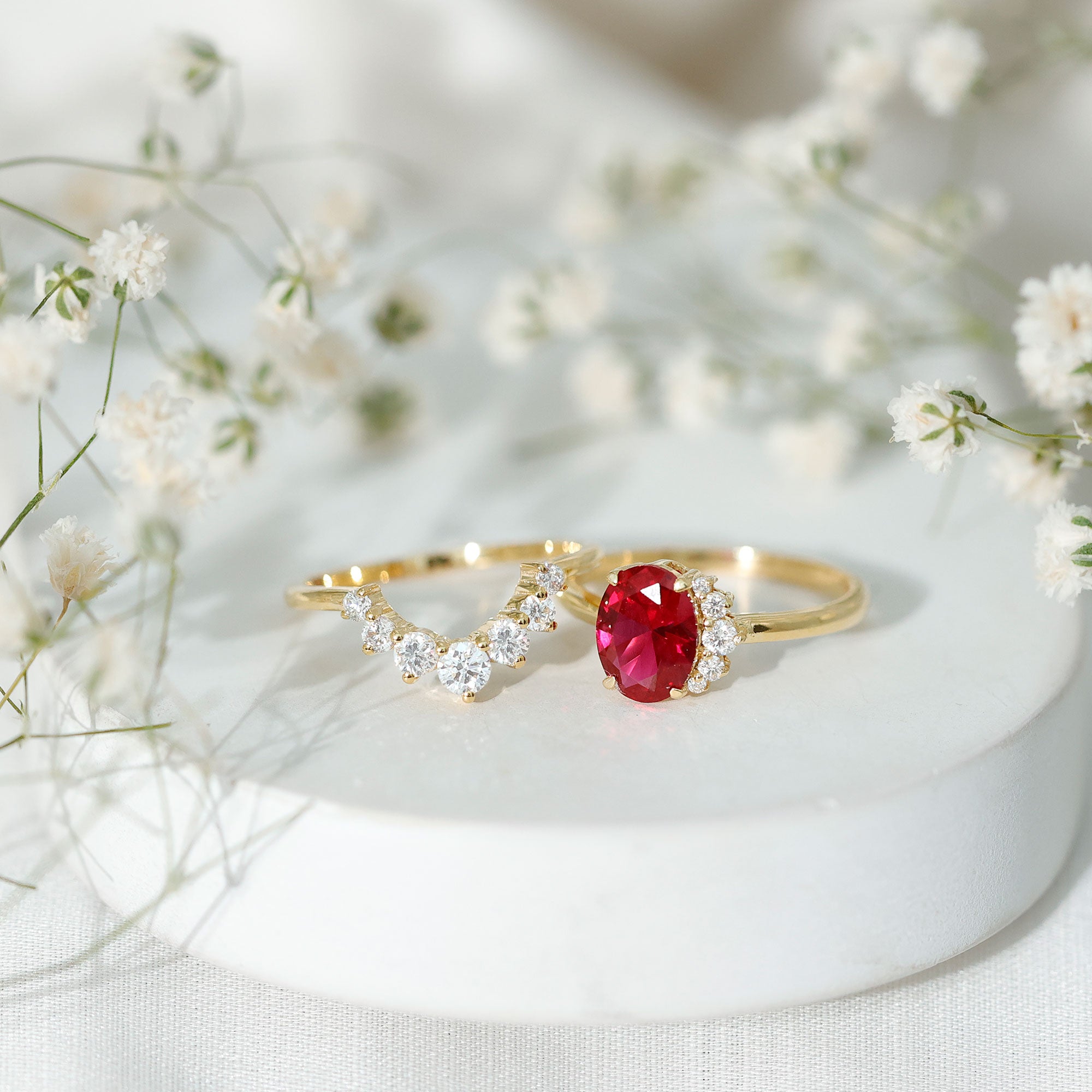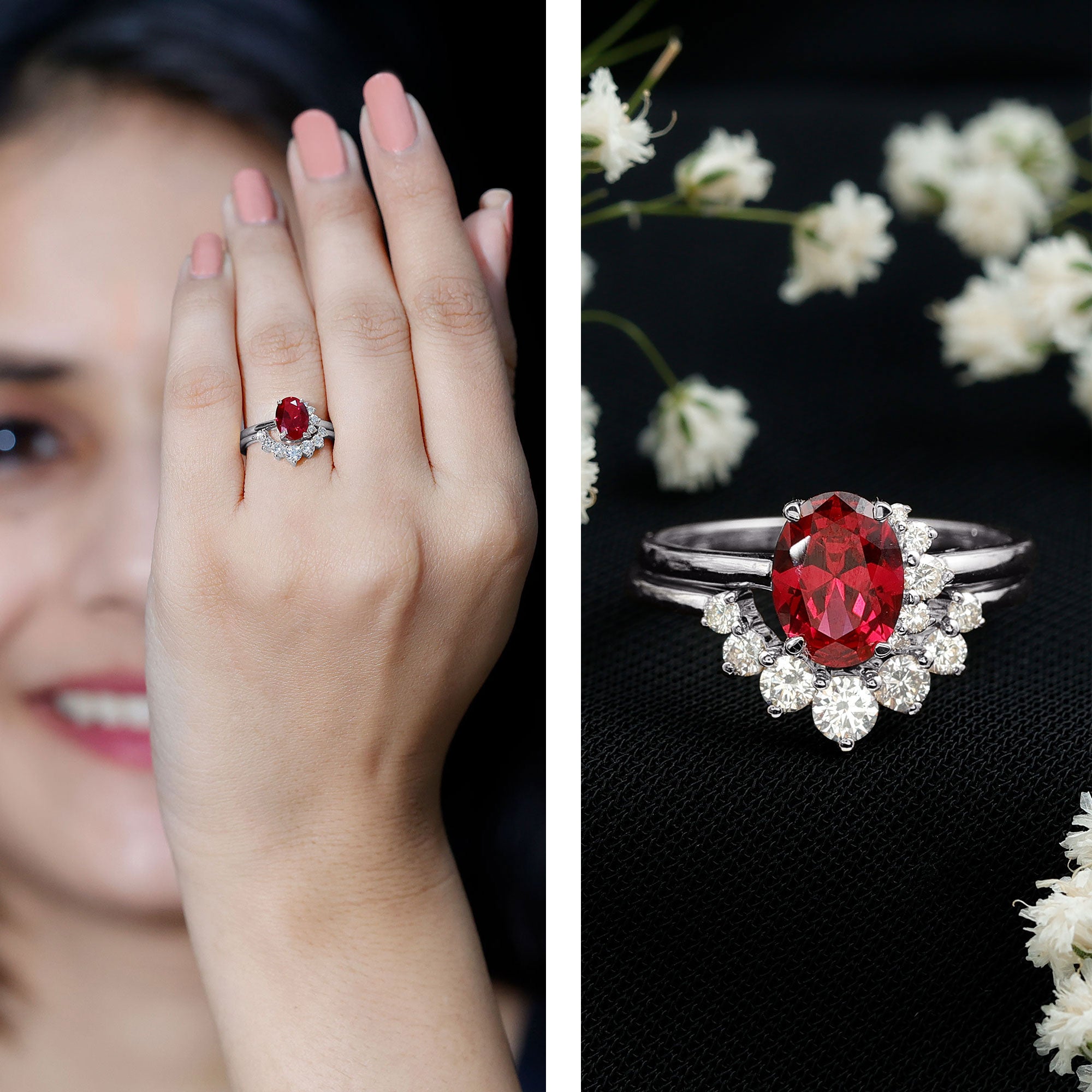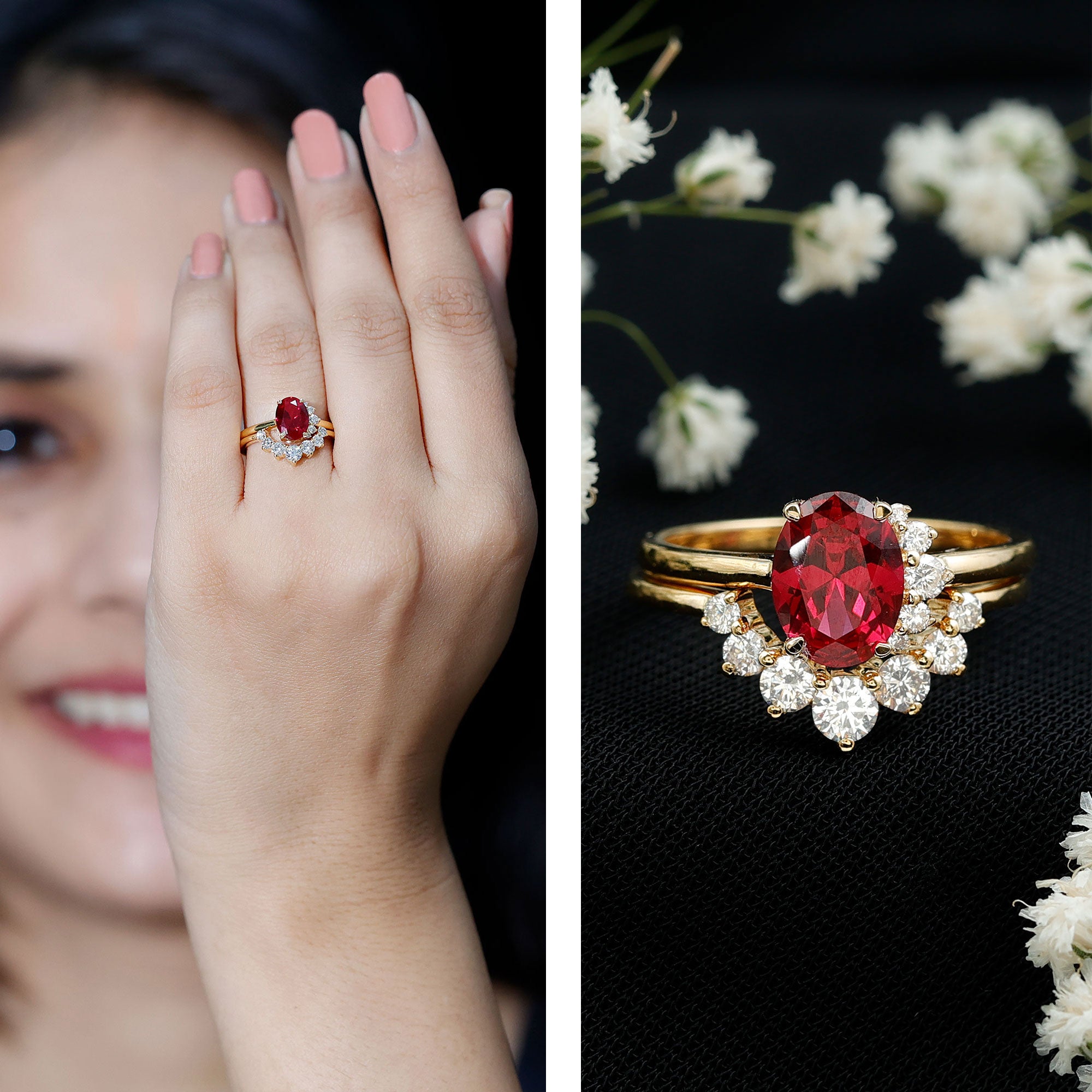 Celebrate your love with this exquisite Wedding Ring Set featuring a stunning 6X8 MM Oval Cut Lab Created Ruby solitaire in a claw setting and Round Shape Diamond accents in prong setting. Crafted from beautiful gold, this ring set exudes charm and elegance. With a total weight of 2.25 Carats and a AAAA quality rating, this ring set is sure to be treasured for years to come. All the gemstones used are certified and undergo a rigorous quality inspection process.