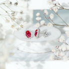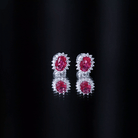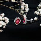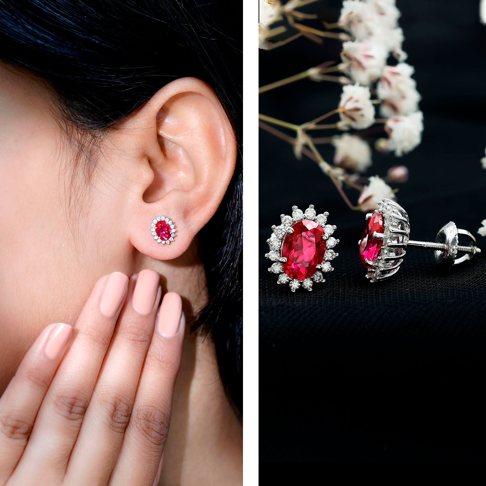 These Lab Grown Ruby Stud Earrings will add an intense hue to the outfit, which is crafted with 14K White Gold Plated Silver. The earrings feature 5X7 MM Cultured Ruby encircled by a Halo of Moissanite. These Oval Earrings hold the classic shine of AAAA Quality Lab Created Ruby securely placed in Prong Setting. The Halo Earrings will adorn your ears beautifully and make your look complete. These Earrings with Screw on Backs will stay on place throughout the day and will be delivered to you in a premium velvet pouch with the certificate of authenticity.