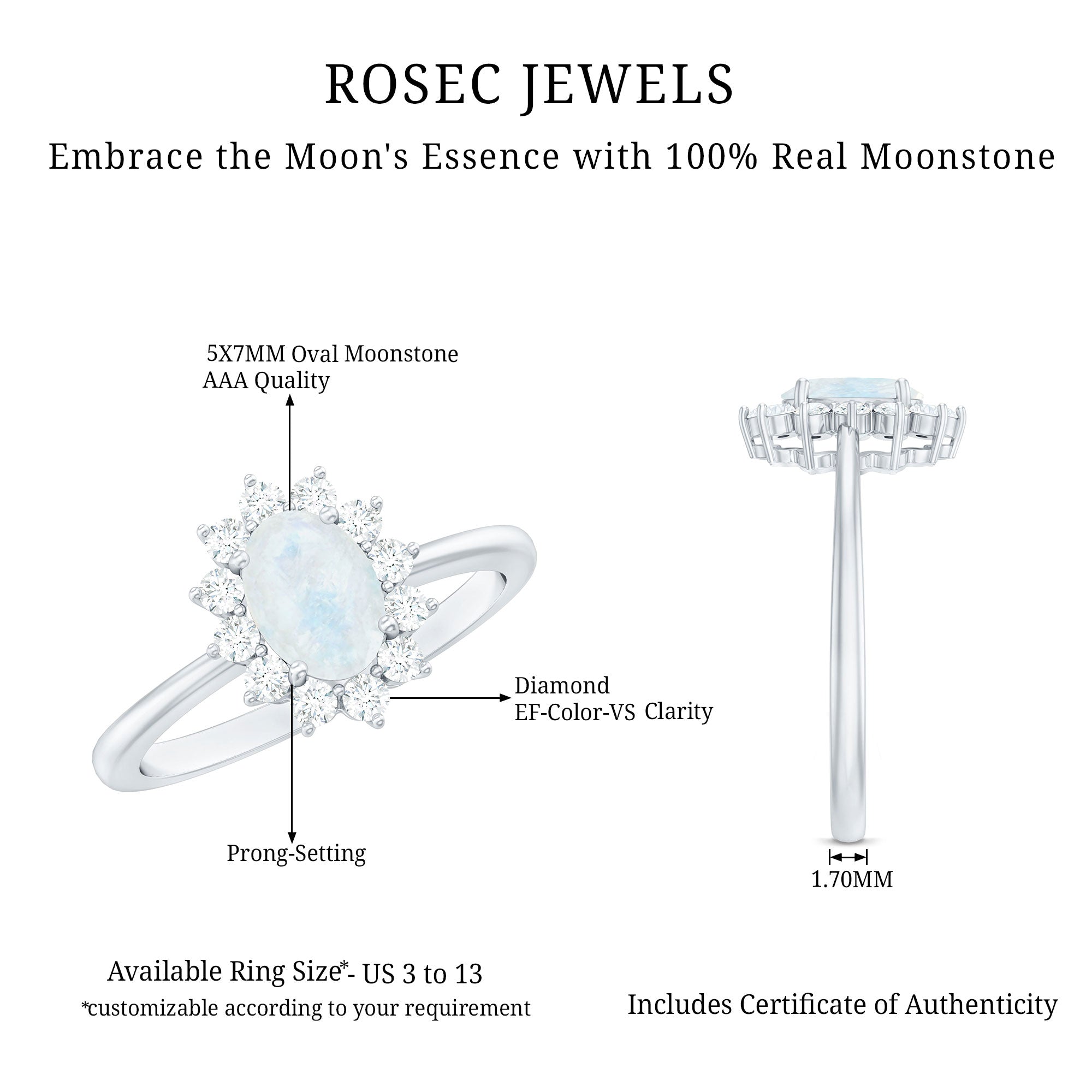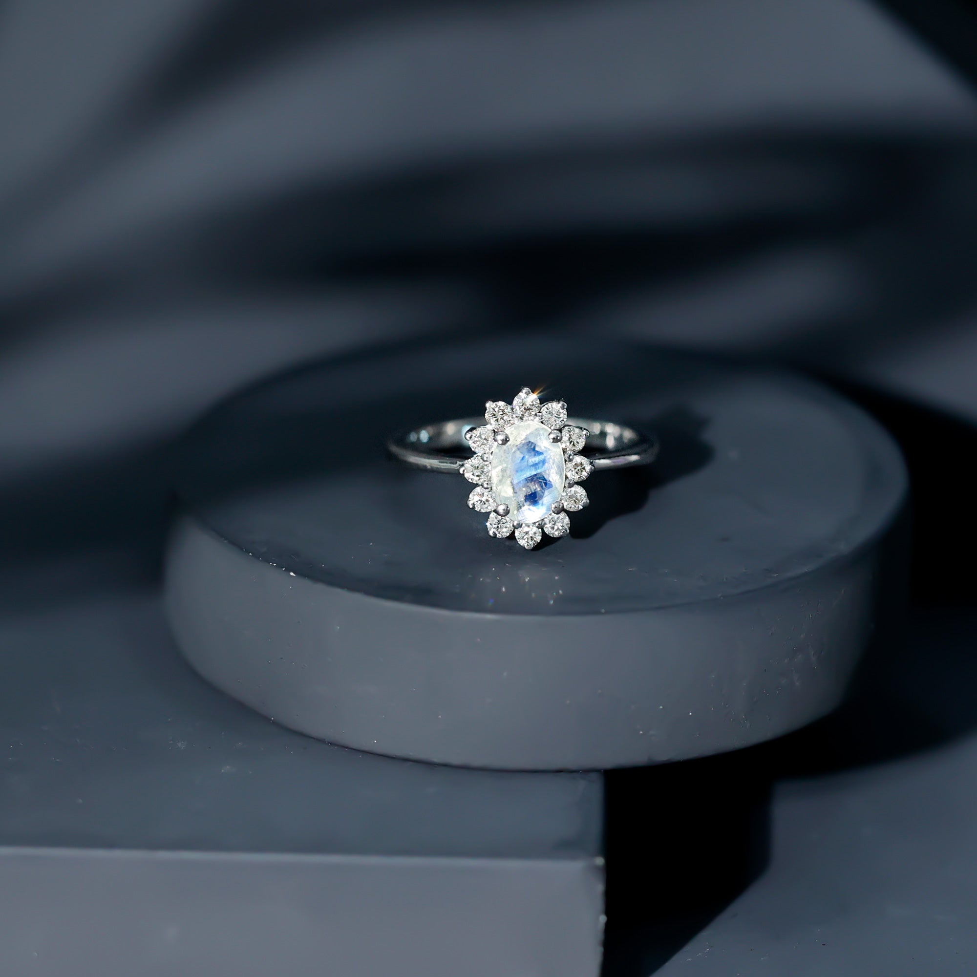 Oval Cut 5X7 MM Moonstone and Diamond Halo Engagement Ring