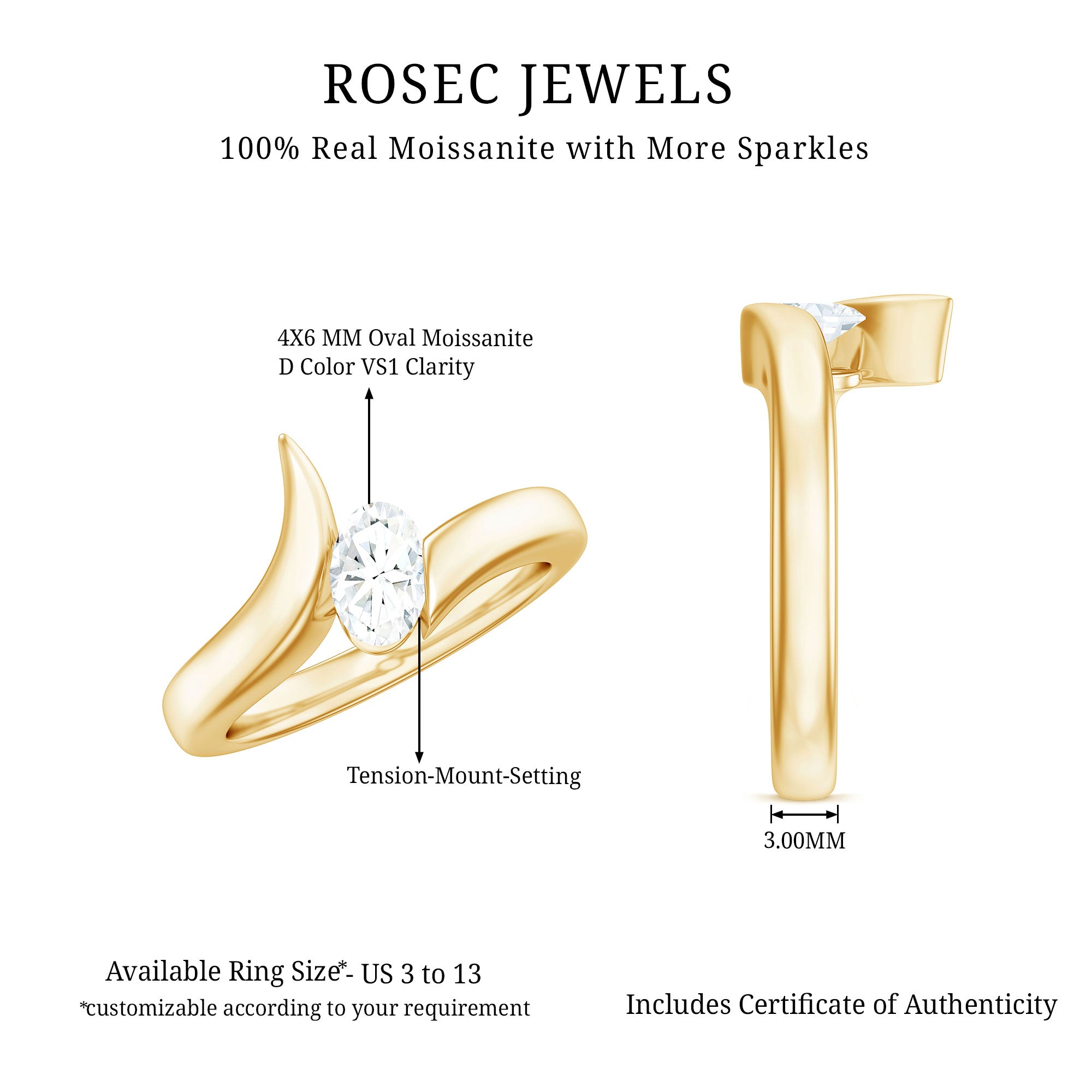 Give her a ring shell love forever! This Oval Moissanite Engagement Ring, a true emblem of enduring love and commitment. Crafted with a blend of classic elegance and contemporary style, this Bypass Engagement Ring is a breathtaking option for the one who means the world to you. At its heart is a stunning 4x6MM oval cut moissanite, securely held in a tension mount setting. It radiates simplicity and sophistication. The bypass design introduces movement and charm, allowing this Moissanite Solitaire Ring to shine while remaining effortlessly timeless. Meticulously crafted, it comes in various high-quality metal purity options and colors, letting you customize it to reflect your personal style. It is also available in US standard sizes from 3 to 13, ensuring a perfect fit for every hand. Whether it is for a proposal, an anniversary, or a special moment just for the two of you, this Solitaire Engagement Ring is a classic piece she will cherish forever.
