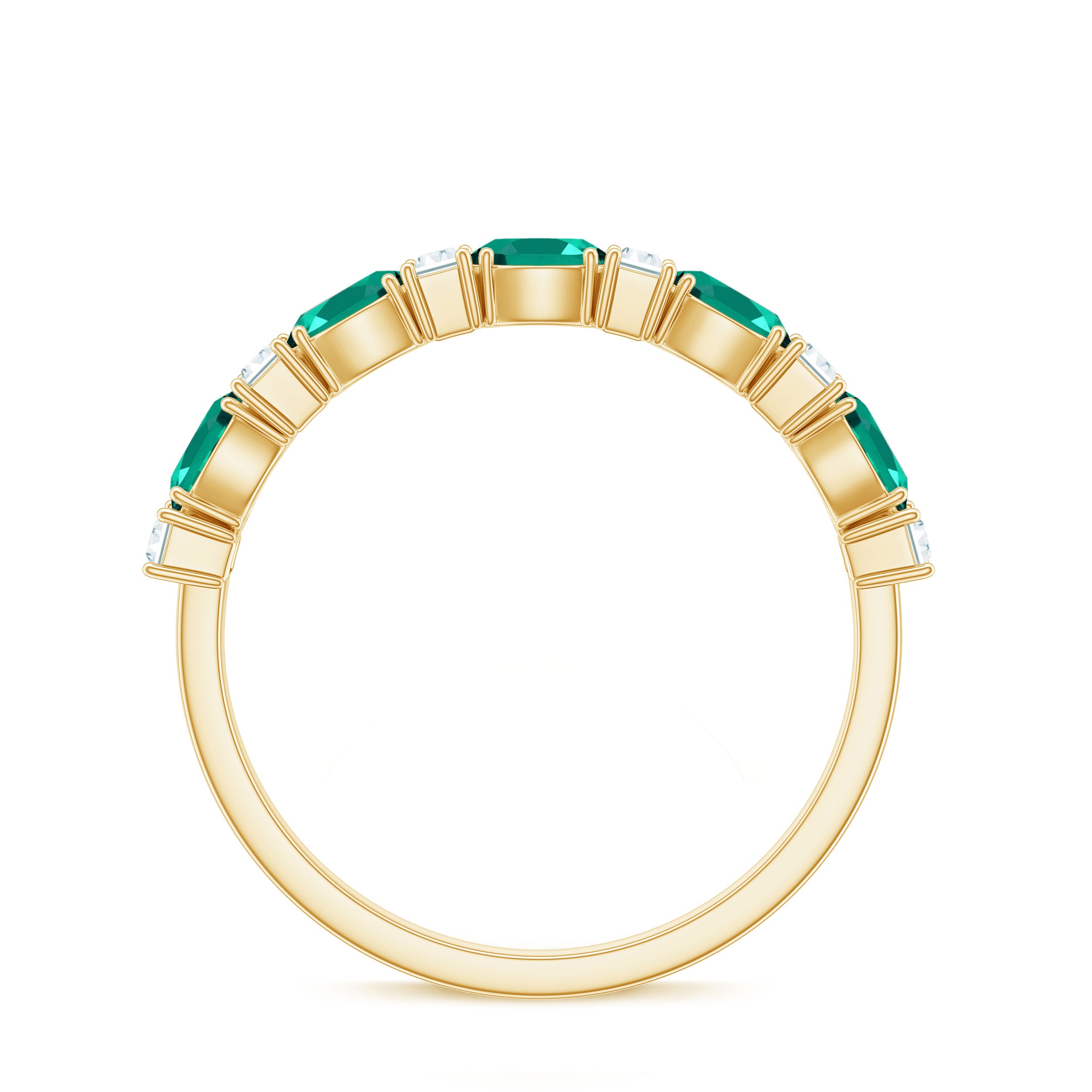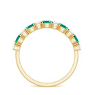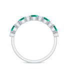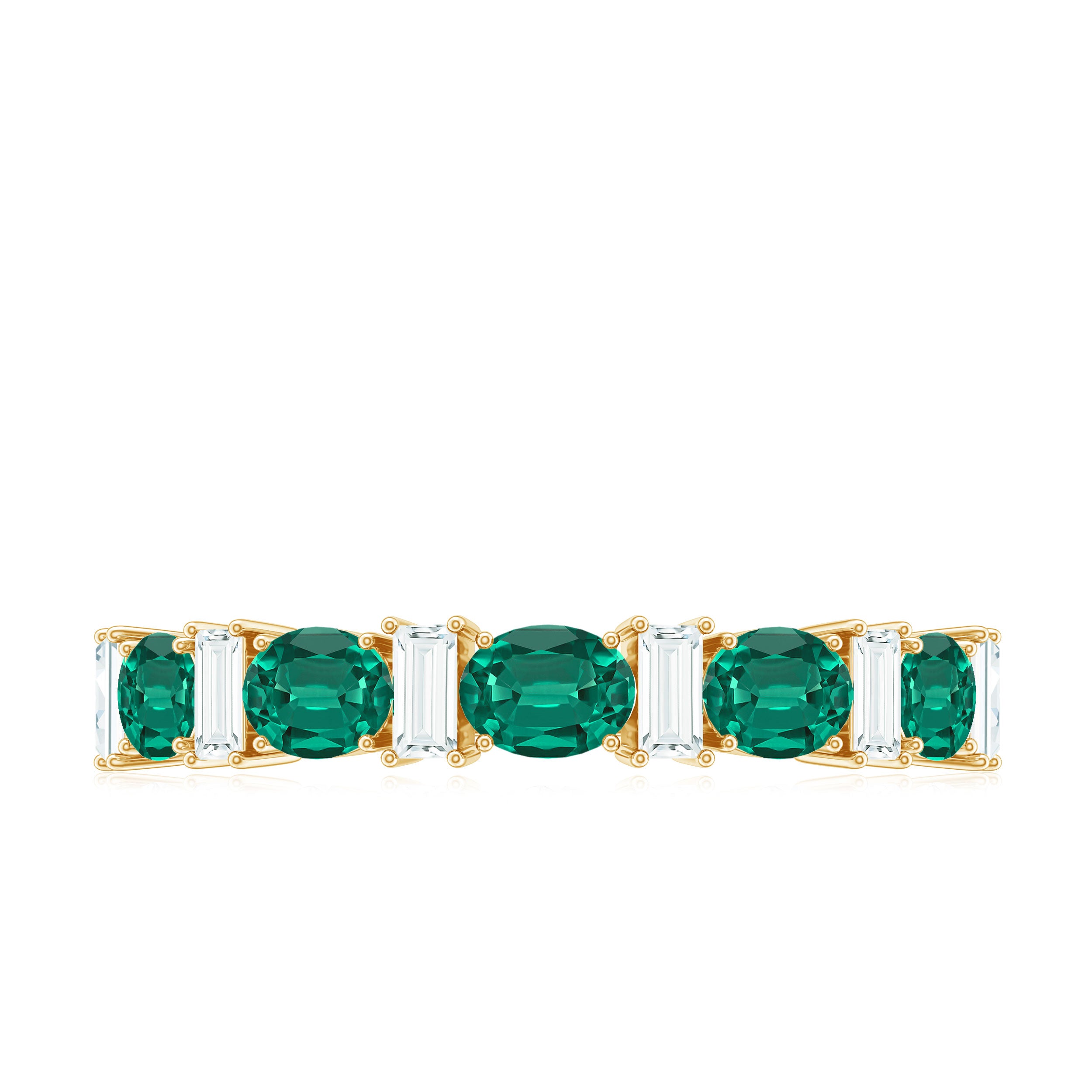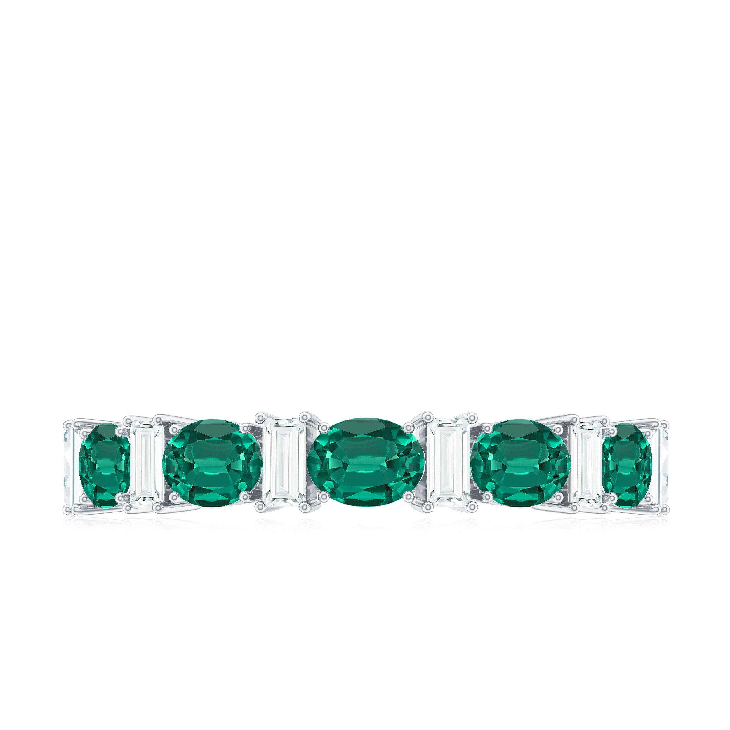Make a striking style statement with this Half Eternity Band, a design that blends modern artistry with timeless elegance. This unique band showcases lush 3X4 mm Oval Shape Lab Created Emerald stones set horizontally across the ring, their vivid green hue creating a bold yet graceful rhythm. In perfect contrast, vertical Baguette Shape Moissanite stones are placed between the AAAA Quality Lab Emerald stones, their radiant sparkle adds brilliance to the design. The interplay of shapes, oval and baguette, horizontal and vertical, creates a captivating balance that feels fresh, contemporary and unforgettable. Crafted in a half eternity style, this Lab Emerald Anniversary Band ensures both comfort and everyday wearability while still making an undeniable statement of luxury. Ideal as a wedding band, anniversary ring or a distinctive stackable piece, this Wedding Anniversary Ring offers versatility while standing out on its own. With its detailing and harmonious fusion of Lab Emerald and Moissanite, this Half Eternity Wedding Band is a modern masterpiece that reflects individuality, elegance and a love designed to shine without end.