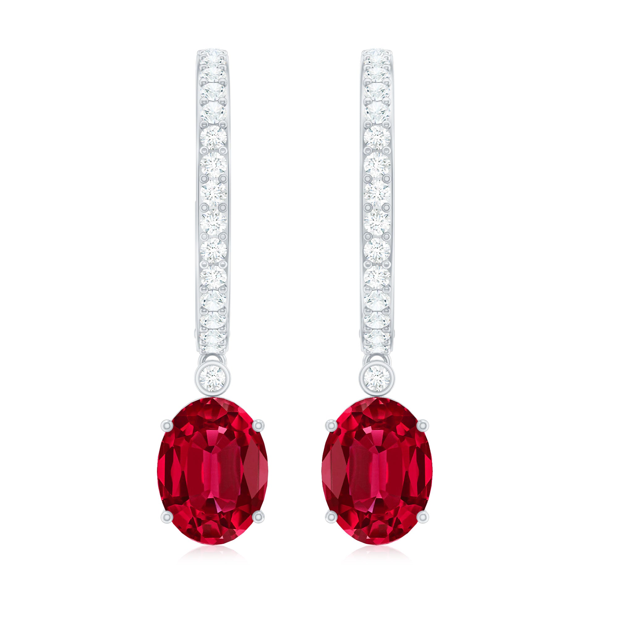 Oval Cut Lab Created Ruby Hoop Drop Earrings with Diamonds