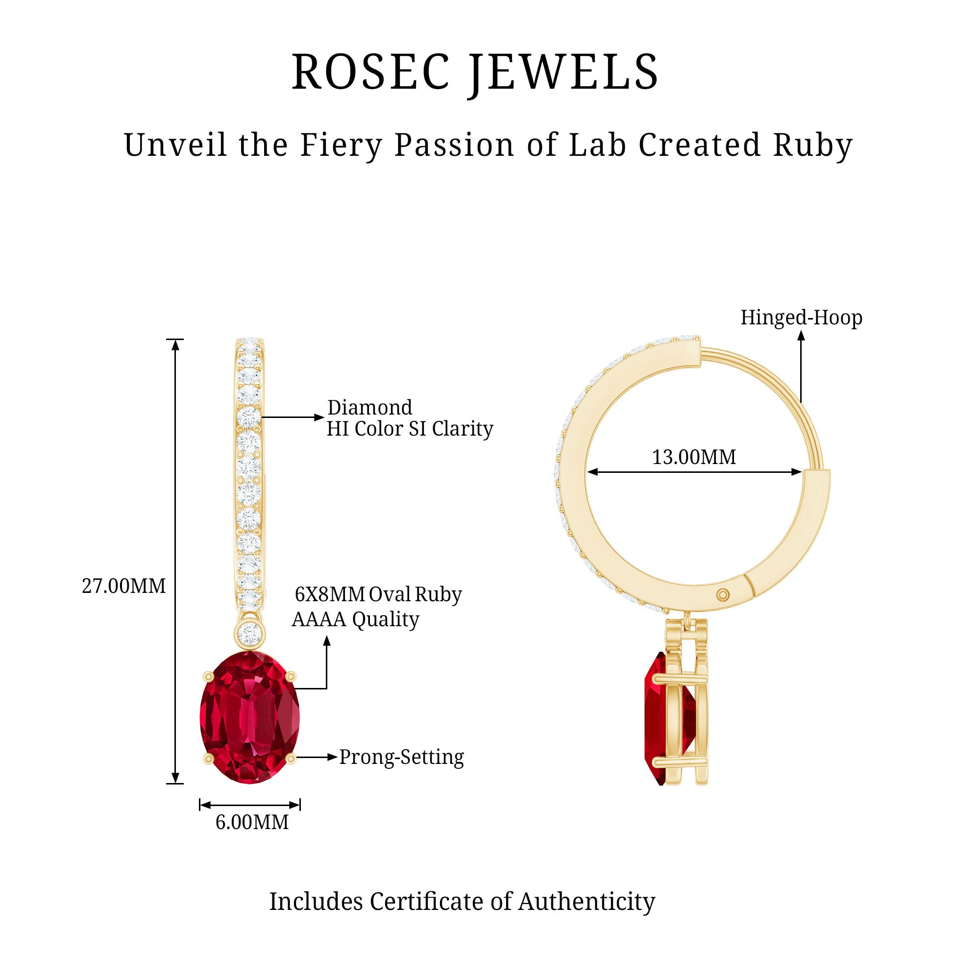 Radiating warmth and timeless beauty, these Lab Created Ruby Drop Earrings bring a touch of sophistication to any look. At the center of each earring shines a 6X8 MM oval cut lab created ruby of AAAA quality, gracefully dangles from a delicate hoop that is adorned with round HI-SI quality diamonds, adding just the right amount of sparkle to enhance its brilliance. The flowing drop design gives these Hoop Drop Earrings a graceful movement, catching the light with every turn of your head. The ruby’s rich color contrasts beautifully with the shimmering diamonds, creating a balance of boldness and refinement. Crafted with attention to detail, these Huggie Hoop Earrings are designed to remain beautiful and durable for years, making them a versatile addition to any jewelry collection. The hinged hoop closure ensures both comfort and security, allowing you to wear them effortlessly throughout the day or night. Whether you are dressing up for a formal event or adding a touch of charm to your everyday style, these Ruby and Diamond Earrings bring a sense of luxury that feels both classic and fresh.