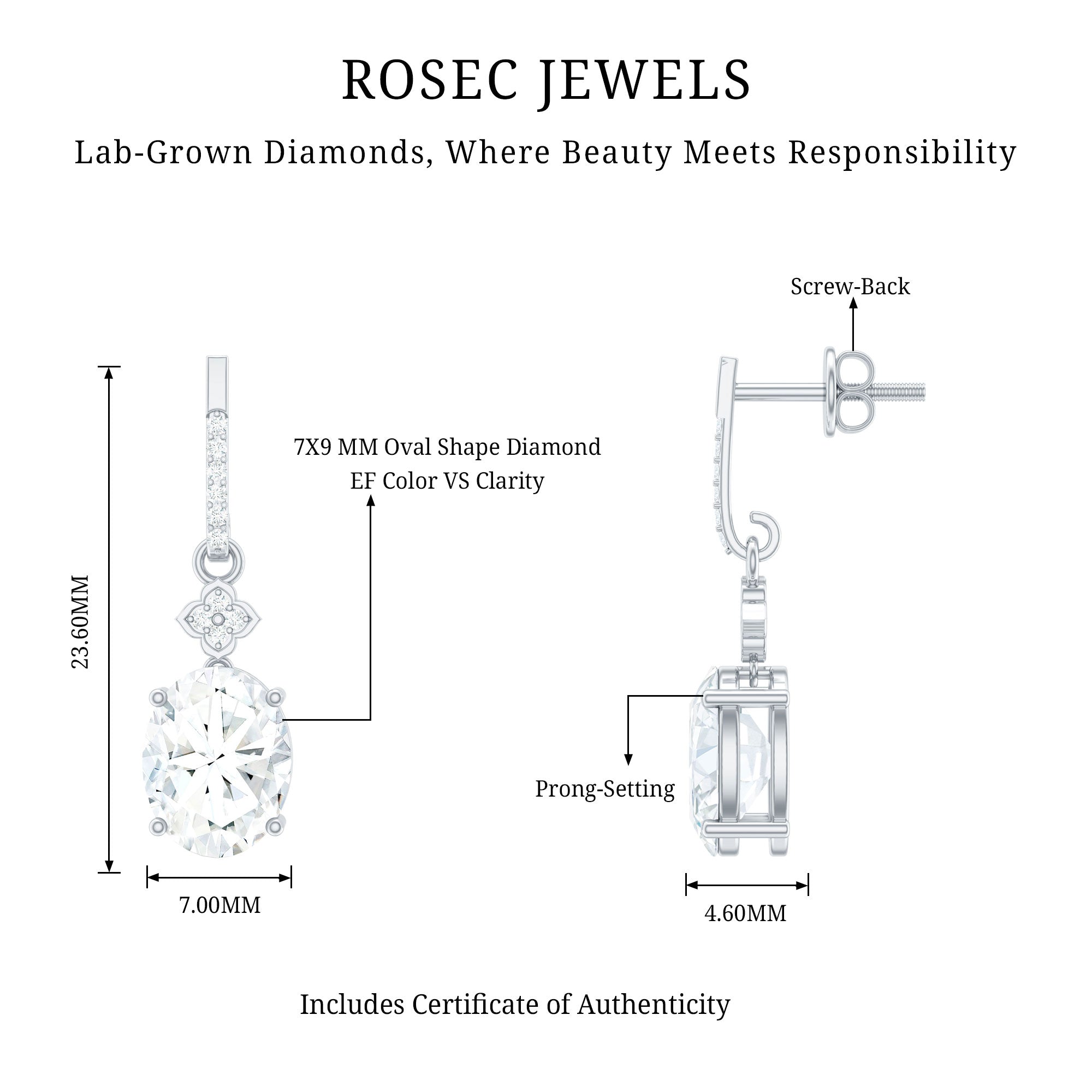 Add more charm and elegance to your look with these stunningly handcrafted Lab Grown Diamond Drop Earrings, a perfect blend of timeless elegance and sophistication. Each earring features a 7X9 MM Oval Shape Lab Grown Diamond in Prong Setting, that dangles gracefully with a delicate Flower Motif adorned with shimmering, tiny Round Shape Lab Diamond stones for a graceful look. The drop design adds just the right amount of movement and shine, making these Dangling Earrings perfect for both everyday wear and special occasions. The Screw Back Closure ensures a secure and comfortable fit, so you can wear them with confidence all day long. Whether you are dressing up for a dinner date or adding a little elegance to your daily look, these Oval Diamond Earrings (Lab Diamond) bring just the right amount of charm. Their classy design makes them a versatile choice for any wardrobe. Delivered in a beautiful jewelry box, these Lab Diamond Earrings are ready to gift or keep as a go-to favorite. Understated yet eye-catching, these Bridal Earrings are a timeless addition to any jewelry collection.