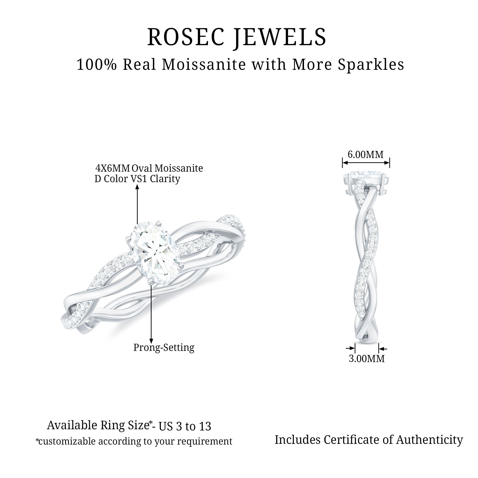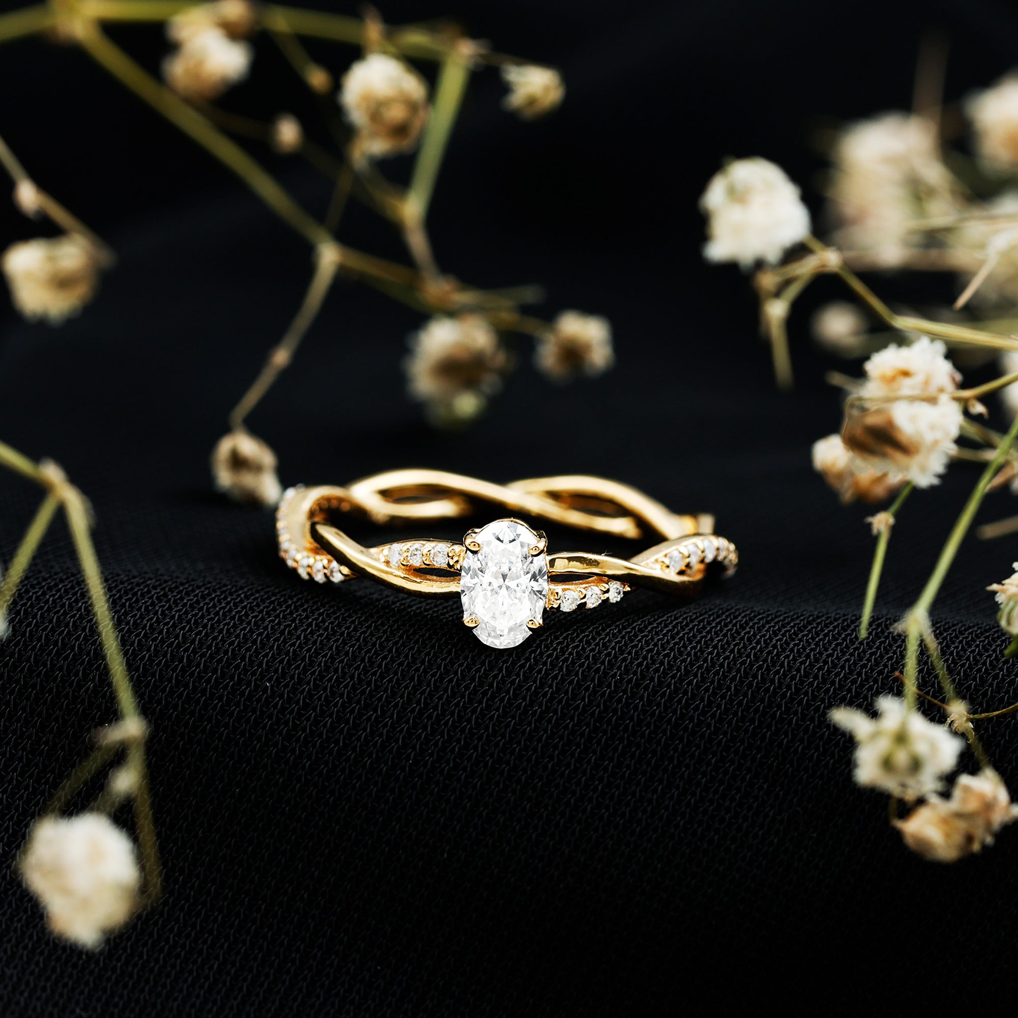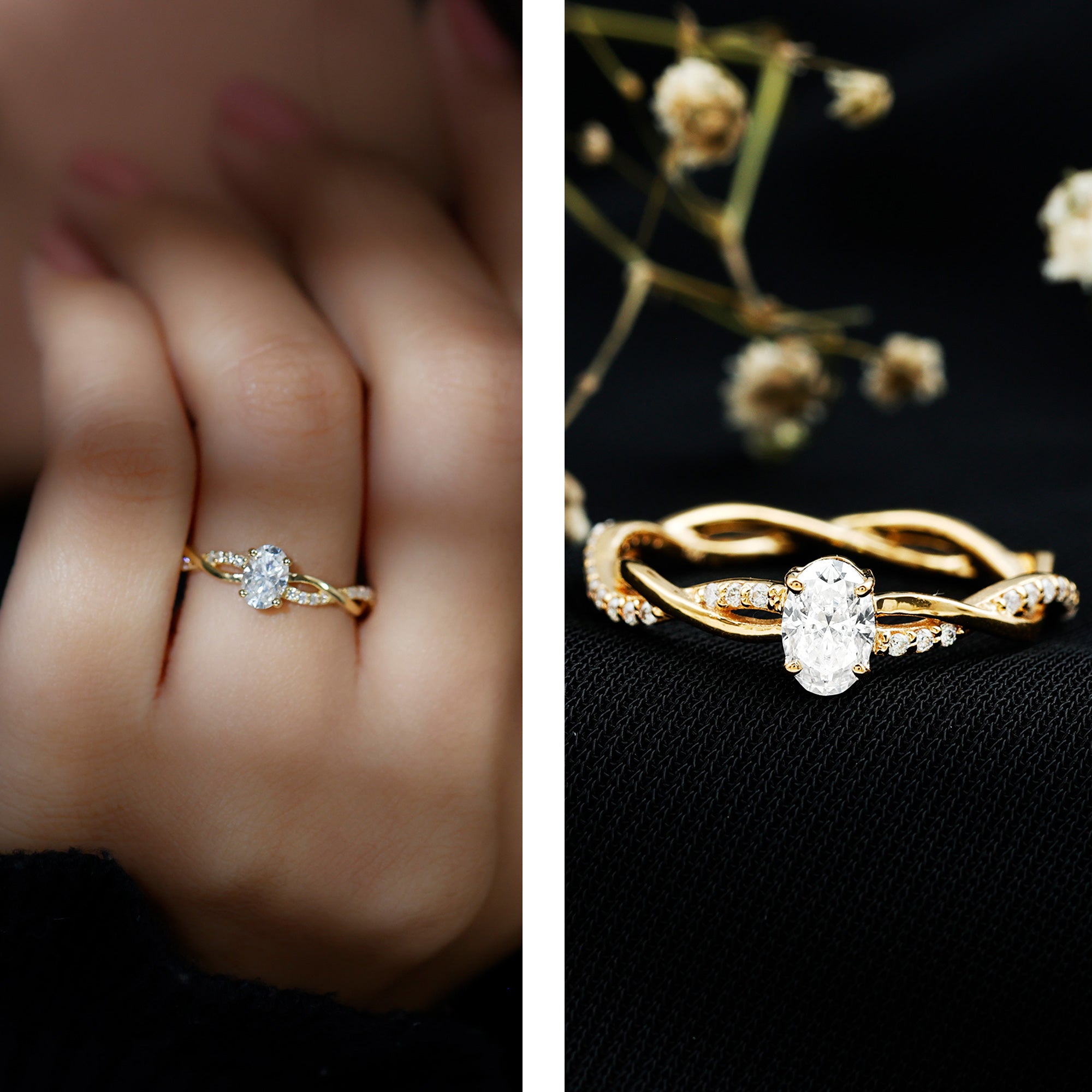 Take a look at this gorgeous Moissanite Engagement Ring that beautifully blends classic elegance with a contemporary feel. The band of this Oval Engagement Ring showcases two strands that twist together in a lovely way, creating a braided appearance, embellished with sparkling round cut moissanites. This striking design features a central 4X6 MM oval cut moissanite, gently set in prongs. Stylish and charming, this Crossover Ring represents everlasting love and displays a sophisticated flair. Its distinctive twist brings a fun element of elegance to this timeless piece. This beauty makes for a considerate and budget-friendly gift for your special someone. It is ideal for celebrating any significant occasion, whether it is an engagement, anniversary, or simply a heartfelt gift. This Braided Engagement Ring is a beautiful way to express love, appreciation, and connection to someone special. Present this Moissanite Ring to that extraordinary person, and let it serve as a lasting symbol of love and beauty.