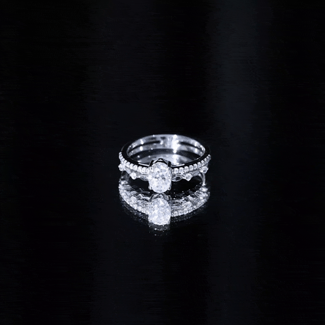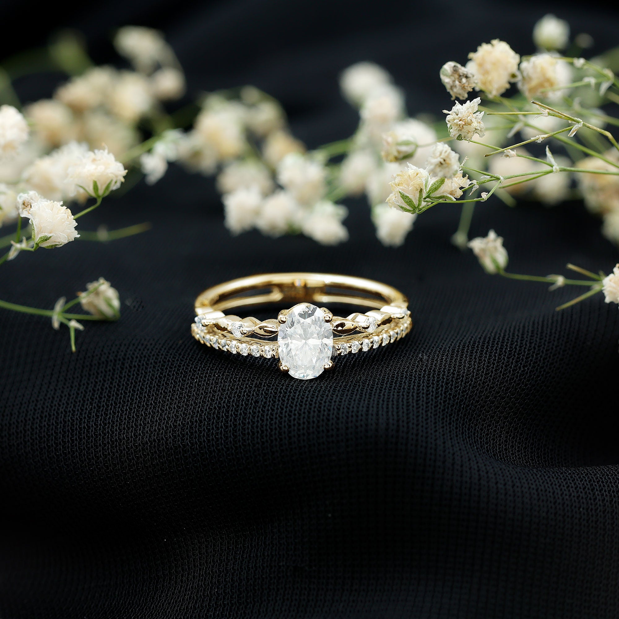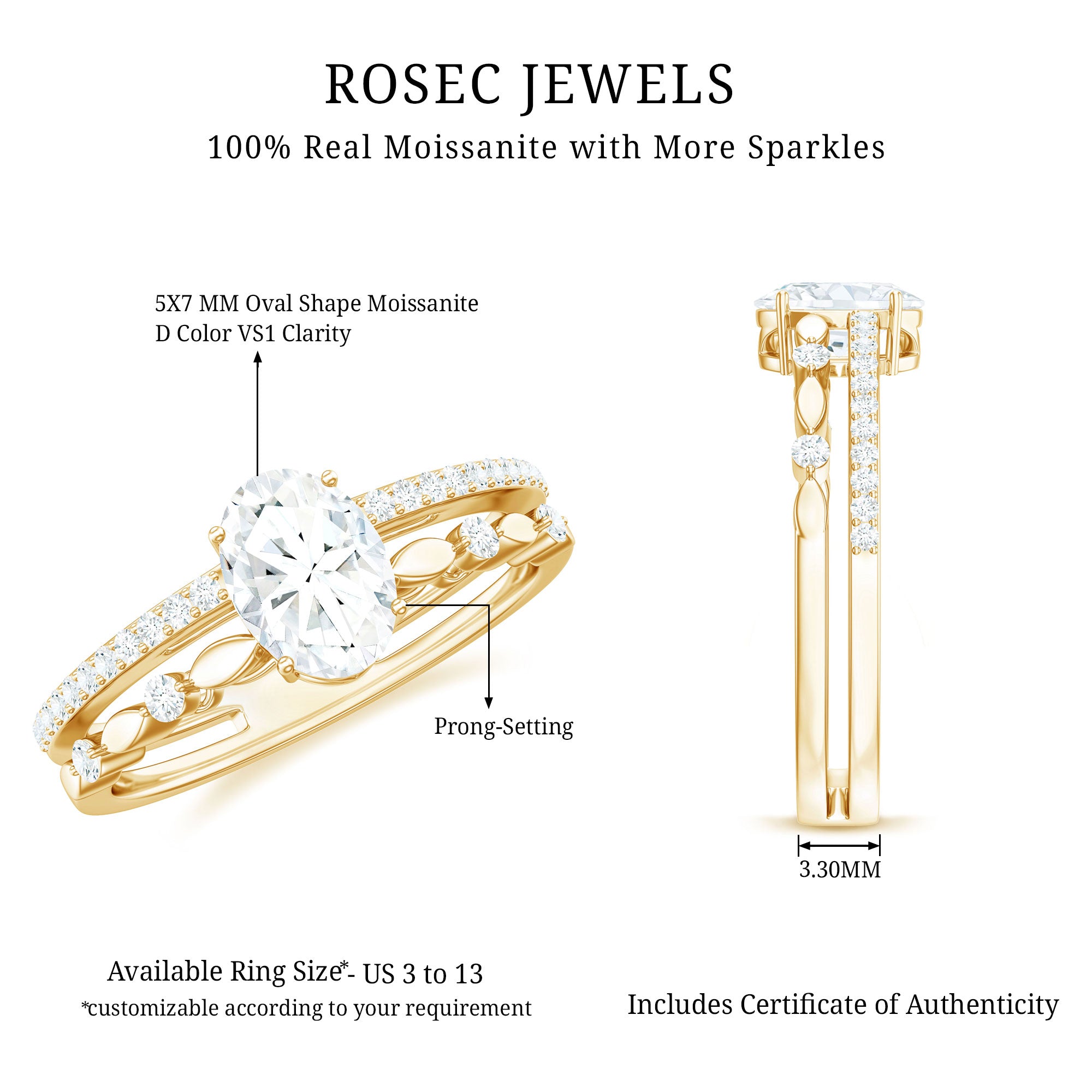 Win her heart with the stunning details of this Solitaire Engagement Ring, featuring a 5X7 MM Oval Cut Moissanite (D-VS1 quality) securely set in prongs. The unique double band shank brings an artistic touch, with one band embellished with a row of surface prong set round cut moissanites for a constant sparkle, while the other displays delicate marquise metal motifs and gemstones set alternately for a contemporary vibe. Together, these elements in this Moissanite Engagement Ring create the look of a stackable ring while ensuring the comfort of a single band. Designed to symbolize everlasting love, this Oval Moissanite Ring is perfect for the bride who values elegance, uniqueness, and timeless beauty. It comes beautifully packaged in a premium jewelry box, ready to be gifted and cherished for a lifetime. Made with precision and style, the Double Band Engagement Ring is offered in various metal types and colors, providing a luxurious and sustainable symbol of your connection.